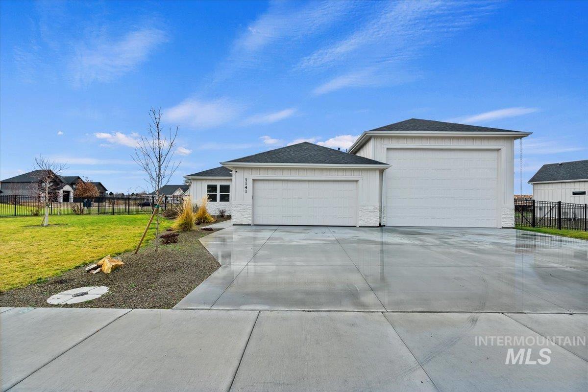 4-bedroom, 3 bath, 2543 sq ft, 0.53 acres, 1880 sq ft garage with 45ft deep double wide RV bay, built 2024, single level, beautifully landscaped front, forced air gas furnace, central air, occupied for only 9 months KITCHEN: Huge island with storage, Appliance pantry, Built-in large 5-burner stainless gas range, Built-in stainless double oven, Breakfast bar/butler’s pantry, Quartz countertops, Stainless dishwasher, Disposal, Large graphite sink LIVING ROOM: Great room with gas fireplace and beamed ceiling MASTER SUITE: Luxurious master suite with separate entrance to patio, remote control adjustable mood lighting, separate tub, his/her sinks, roll-in double shower, make-up vanity, enormous walk through closet with direct access to laundry BEDROOMS: ceiling fans with remotes, large closets, 4th bedroom can be guest suite with their own full bathroom GARAGE: 1880 sqft. Polyurea floor upgrade, 14ft tall door on double RV bay (45ft deep), Roomy 2-car parking, Attic ladder upgrade with flooring added for storage, Water softener upgrade, Plumbed for central vacuum LAUNDRY/MUD ROOM: Shop sink, Folding area, storage PATIO: gas bib for grill, direct access to master bedroom BATHROOMS: 3 full baths, Quartz countertops, sealed tile, dual function shower heads **Upgrades added: water softener, polyurea garage floor, custom cushion for mudroom bench, modern push-button blinds throughout.