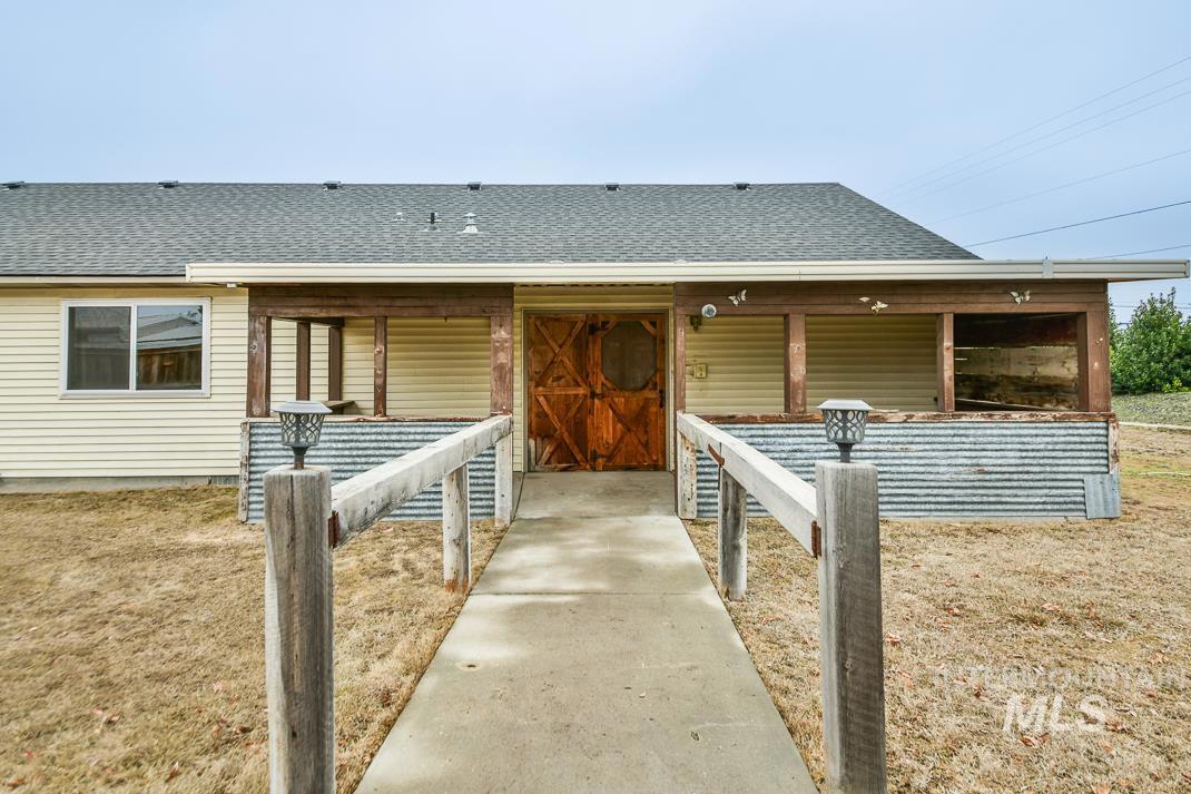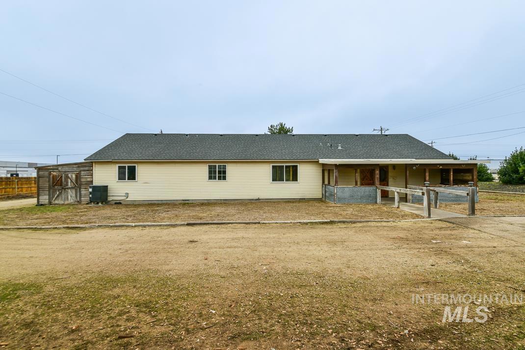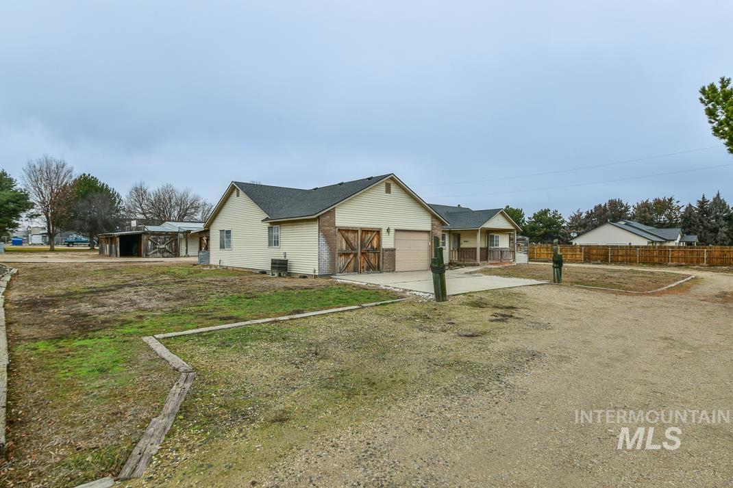 Just under one acre with Apx. 24x80 shop/storage with 2 overhead doors, 2 man doors, vaulted ceilings and overhead gas heater. All one level home with circular driveway. Front and back covered porch/patios. No homeowner dues, covenants or restrictions. Plenty of room to park work trucks, trailers, RV`s or toys! Cozy home with warm wood accents features country kitchen with built-in hutch, Kohler Kitchen sink and wood blinds. Vaulted sunny living room. Family room with office and 1/2 bath. Low maintenance yard but yet with all the room for everything and centrally located with easy access to Meridian, Eagle & Boise.