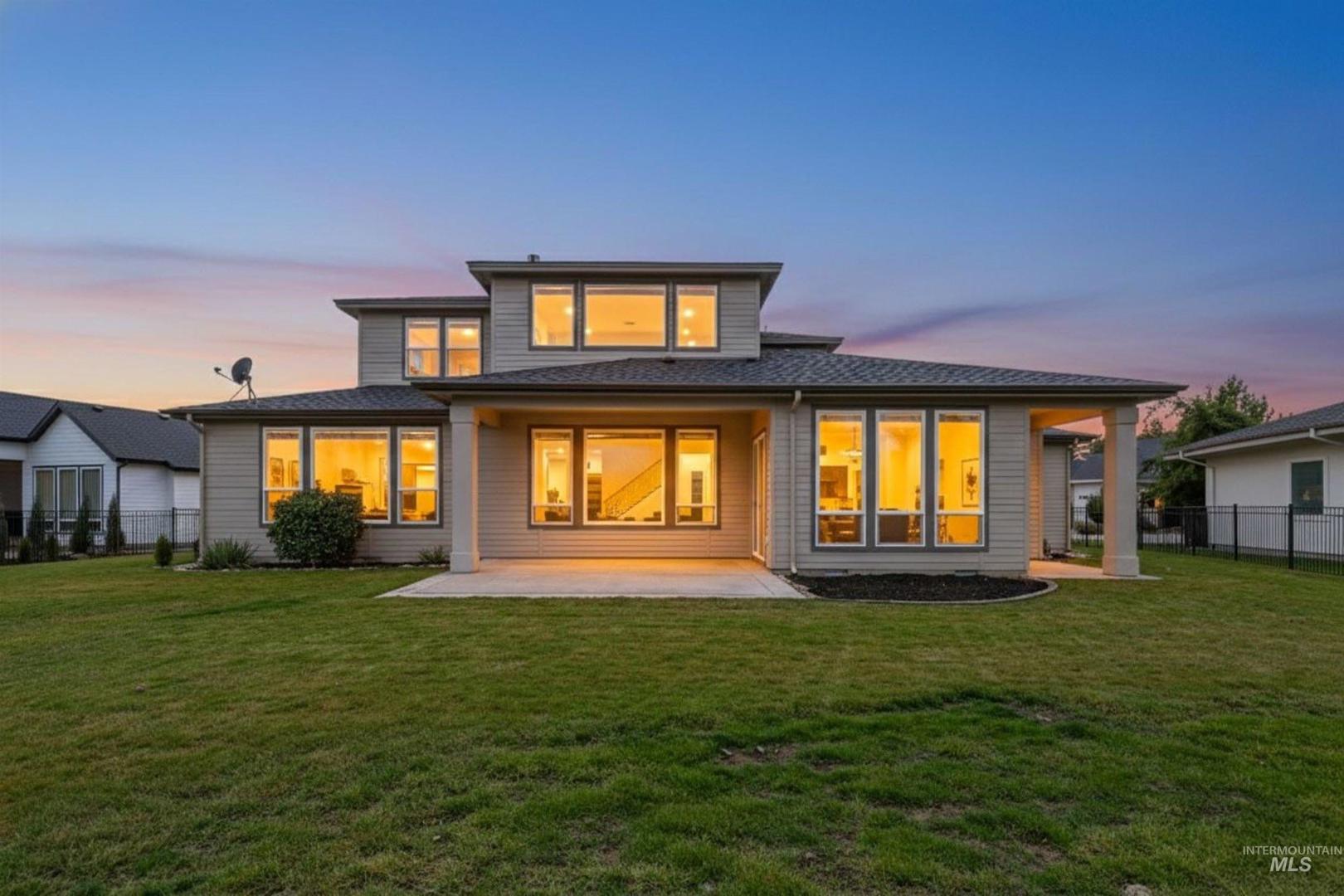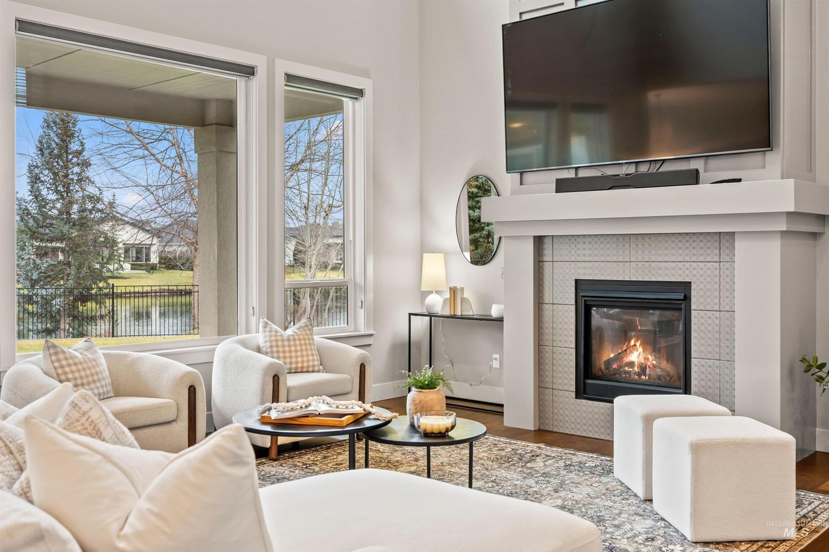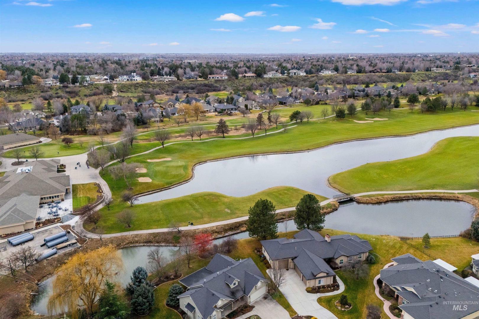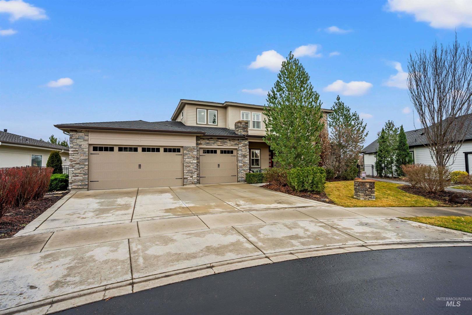 Tucked within a quiet cul-de-sac in the sought-after, gated Lakemoor community, this exceptional Eagle home offers privacy, comfort, and scenic beauty. Just over a mile from the Boise River and Greenbelt, and close to dining, entertainment, medical facilities, and downtown Eagle, the location is both peaceful and convenient. The bright, open kitchen and great room are filled with natural light and showcase stunning waterfront views through expansive windows. The main-level primary suite is a true retreat with his-and-hers closets and a luxurious bath. A second main-level bedroom with ensuite works perfectly as a guest suite or second primary, while a dedicated office provides ideal work-from-home space. Upstairs, three spacious bedrooms, two full baths, and a large loft/bonus room offer exceptional flexibility. The beautifully appointed kitchen features newly refinished hardwood floors, double ovens, new refrigerator and gas cooktop, granite countertops, soft-close cabinetry, and a large pantry. Outdoors, a covered patio overlooks mature landscaping and a serene pond, with wrought-iron fencing designed to preserve the views on a lot exceeding one-third of an acre.