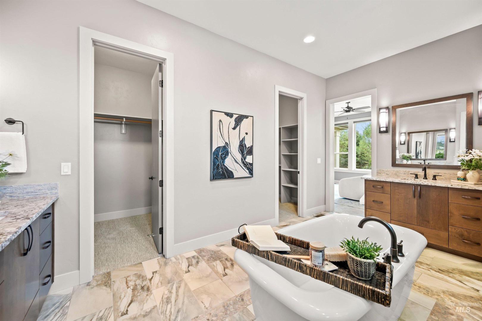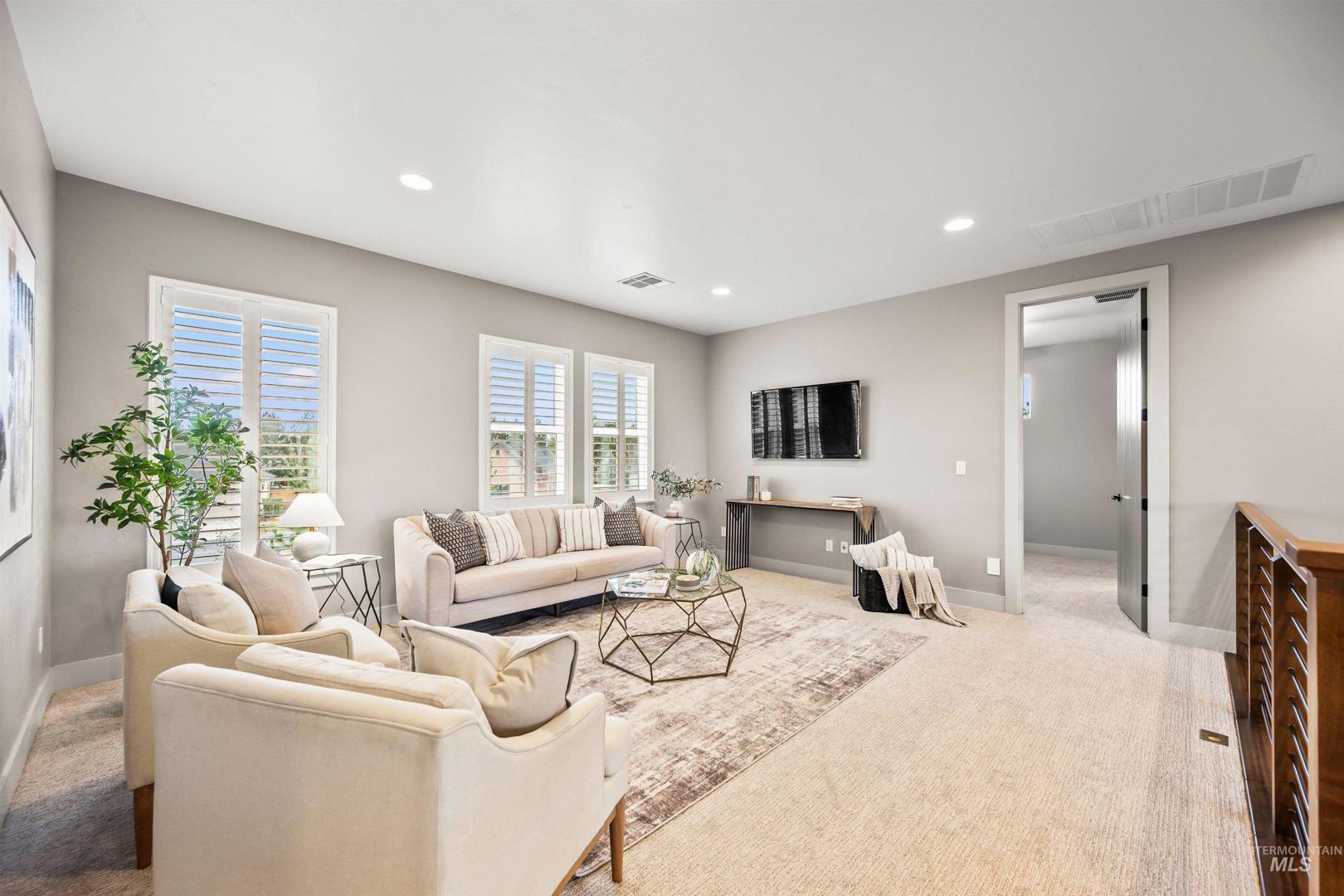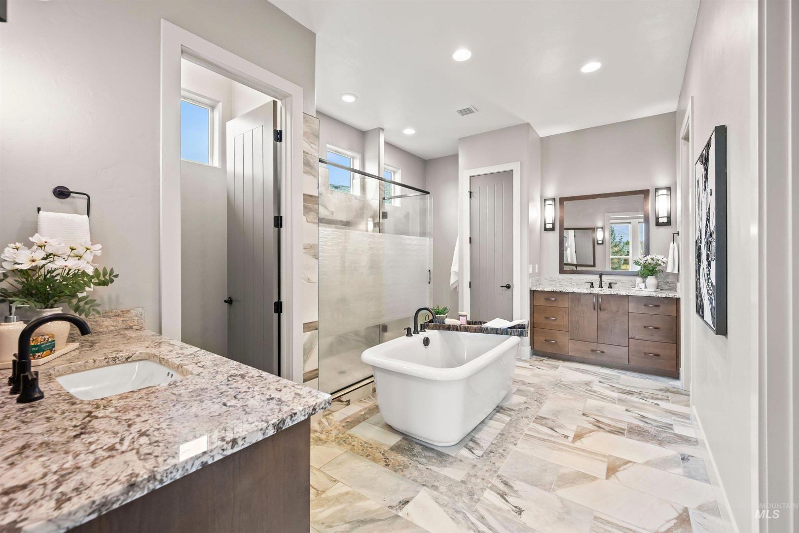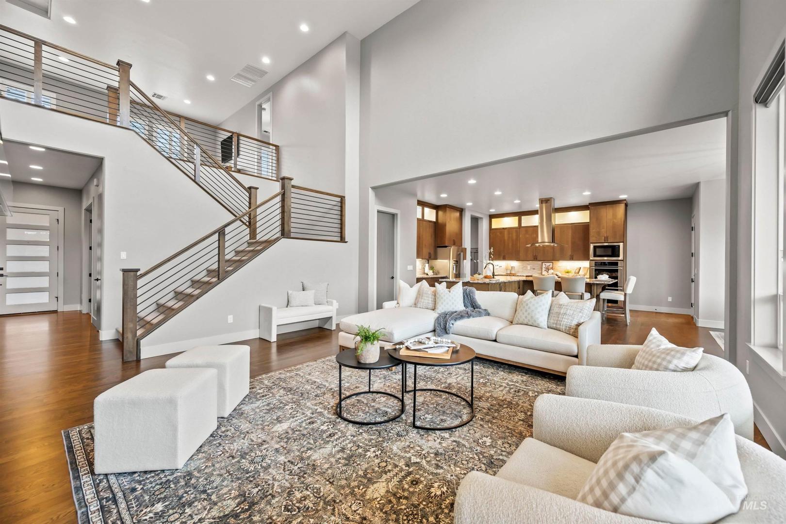 Tucked within a quiet cul-de-sac in the sought-after, gated Lakemoor community, this exceptional Eagle home offers privacy, comfort, and scenic beauty. Just over a mile from the Boise River and Greenbelt, and close to dining, entertainment, medical facilities, and downtown Eagle, the location is both peaceful and convenient. The bright, open kitchen and great room are filled with natural light and showcase stunning waterfront views through expansive windows. The main-level primary suite is a true retreat with his-and-hers closets and a luxurious bath. A second main-level bedroom with ensuite works perfectly as a guest suite or second primary, while a dedicated office provides ideal work-from-home space. Upstairs, three spacious bedrooms, two full baths, and a large loft/bonus room offer exceptional flexibility. The beautifully appointed kitchen features newly refinished hardwood floors, double ovens, new refrigerator and gas cooktop, granite countertops, soft-close cabinetry, and a large pantry. Outdoors, a covered patio overlooks mature landscaping and a serene pond, with wrought-iron fencing designed to preserve the views on a lot exceeding one-third of an acre.