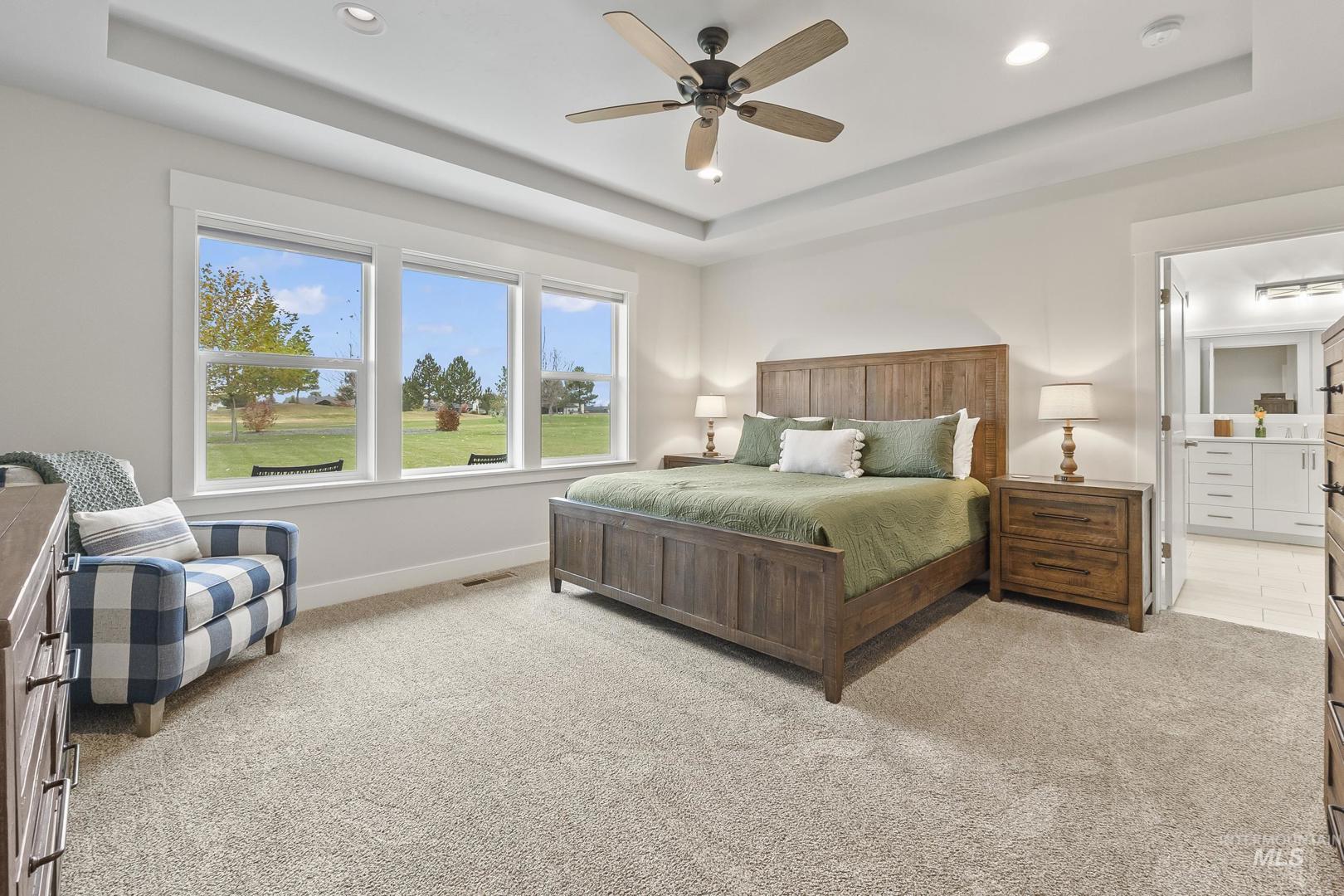 Welcome to your dream home on the golf course — a stunning single-level retreat that perfectly blends luxury and comfort. With 4 spacious bedrooms and 3.5 baths, this home was built for easy living and effortless entertaining. The modern open-concept layout flows seamlessly from the sleek kitchen — complete with double ovens and a large island — to the inviting living room with a cozy fireplace and expansive golf course views. The primary suite feels like a spa getaway with its large soaker tub and walk-in shower, while a junior master suite offers a private space for guests or multi-generational living. Car lovers and adventure seekers will love the massive RV bay, boat bay, and room for 5 cars total — plenty of space for all your toys. Outside, enjoy the quiet and peaceful surroundings of this golf course community, where every sunset feels like a vacation. Modern, serene, and designed for the good life — this home has it all.