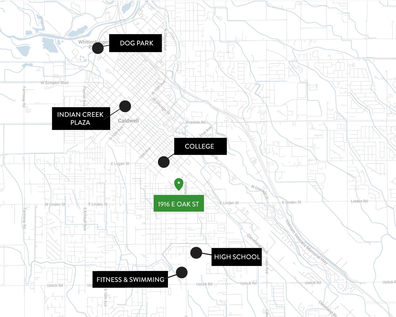 From I-84 Exit 29, W on Hwy 20/26, S on 21st Ave, E on Cleveland Blvd, S on Indiana, W on Oak to home.