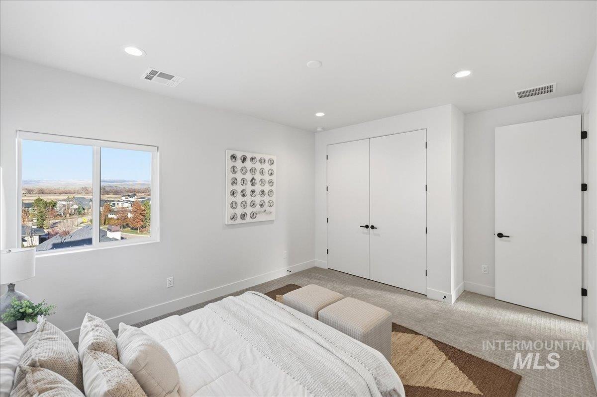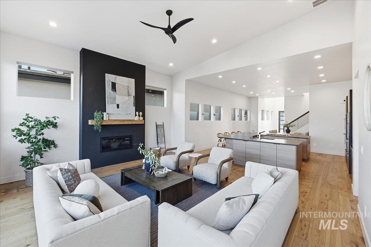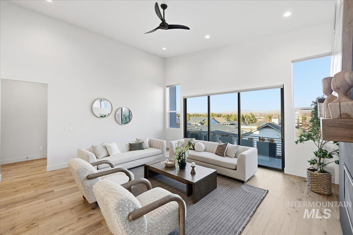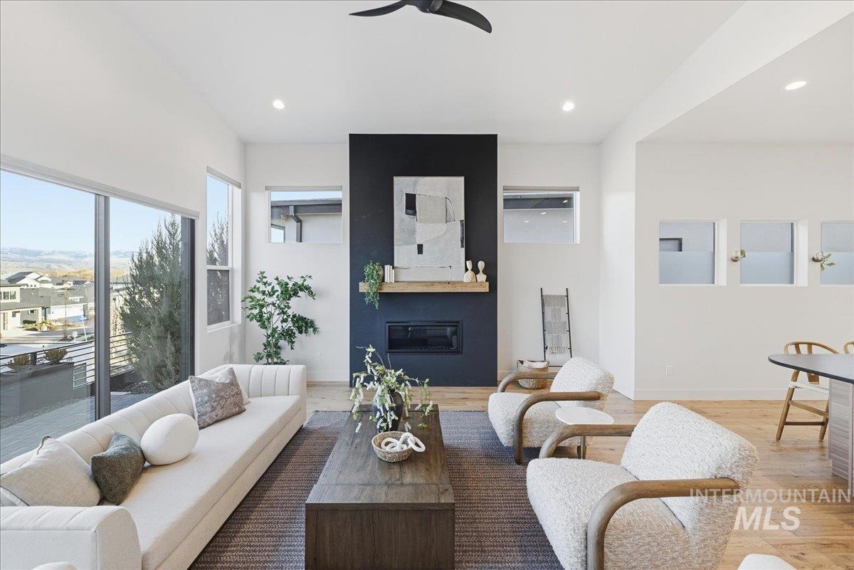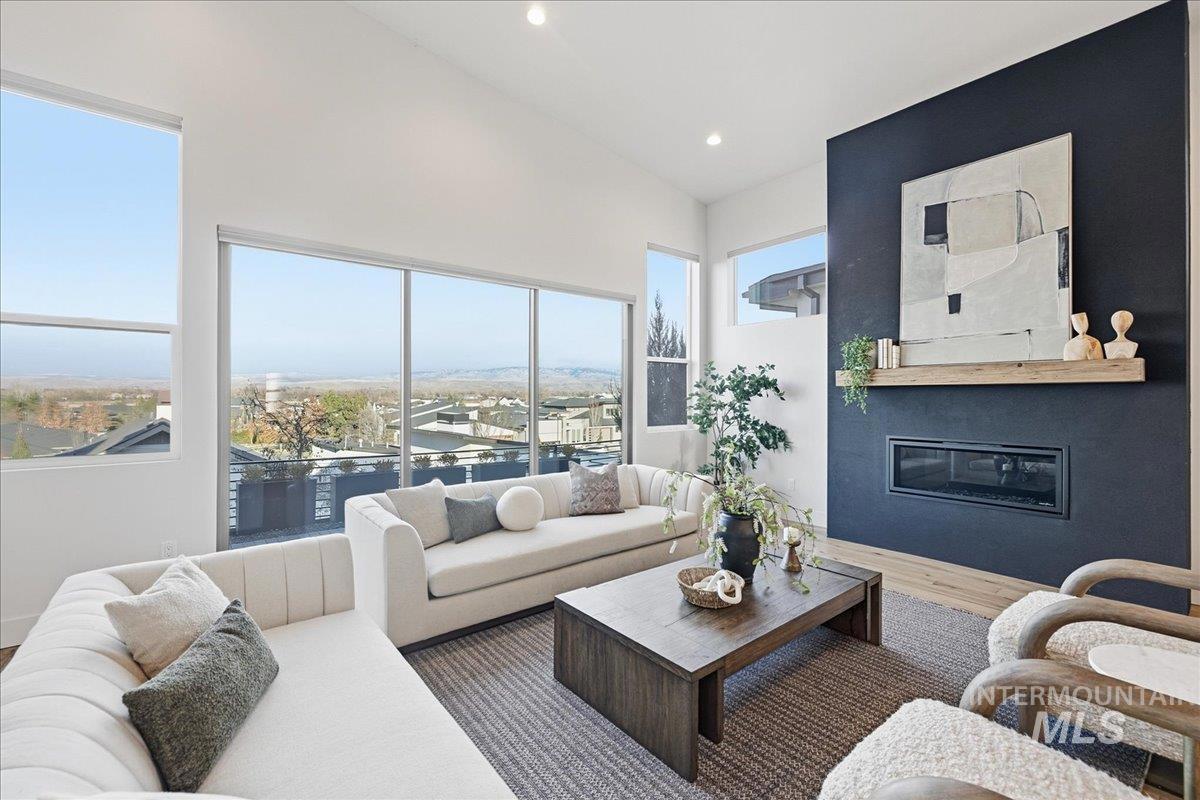 Introducing a stunning 2,835 sq. ft. high-end modern masterpiece offering the ultimate in luxury and convenience. This elegant home features 4 spacious bedrooms, 3.5 designer bathrooms, and a 3 garage with epoxy floors & a mini-split system, perfect for cars or projects. Perched atop a premier view lot, the home boasts breathtaking, uninterrupted views of Eagle and the Boise Foothills, ideal for enjoying serene sunsets. Open up the stacking slider out to the patio for seamless indoor/outdoor living, perfect for entertaining/gatherings. With a low-maintenance yard, you`ll enjoy luxurious living without the hassle of upkeep. The coveted Lakemoor Community also features Gated Privacy, Direct Greenbelt Access, Tennis/Pickleball courts, Basketball Court, 2 swimming pools, and walking distance to countless amenities! This is a rare opportunity to own a modern oasis with unbeatable views!