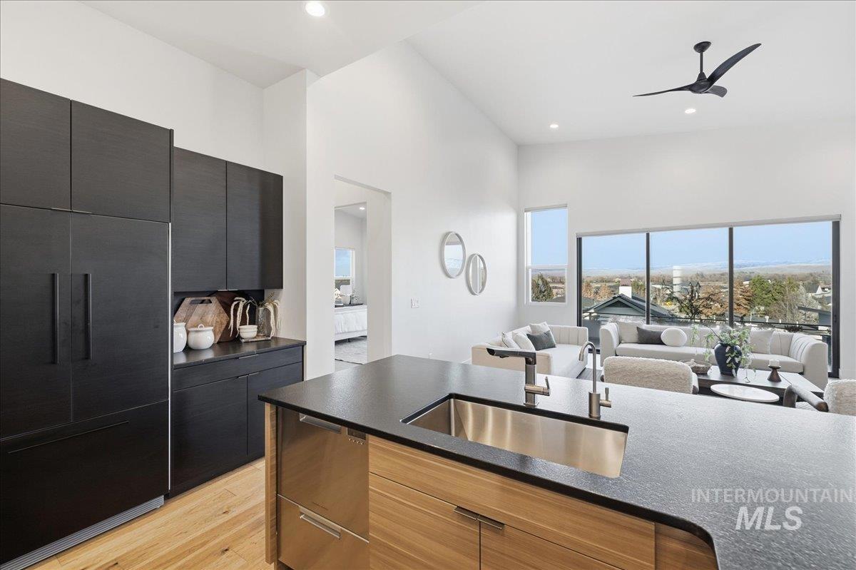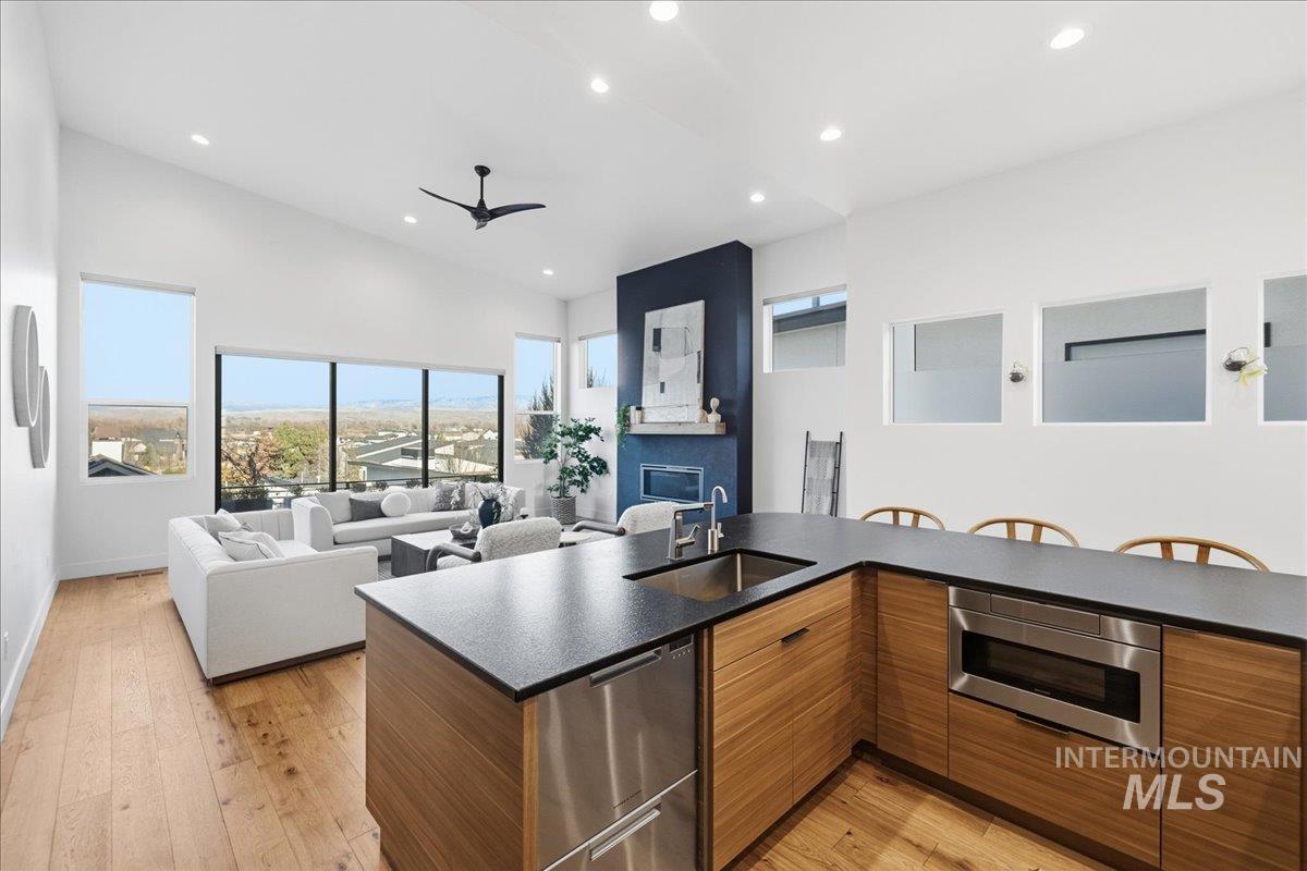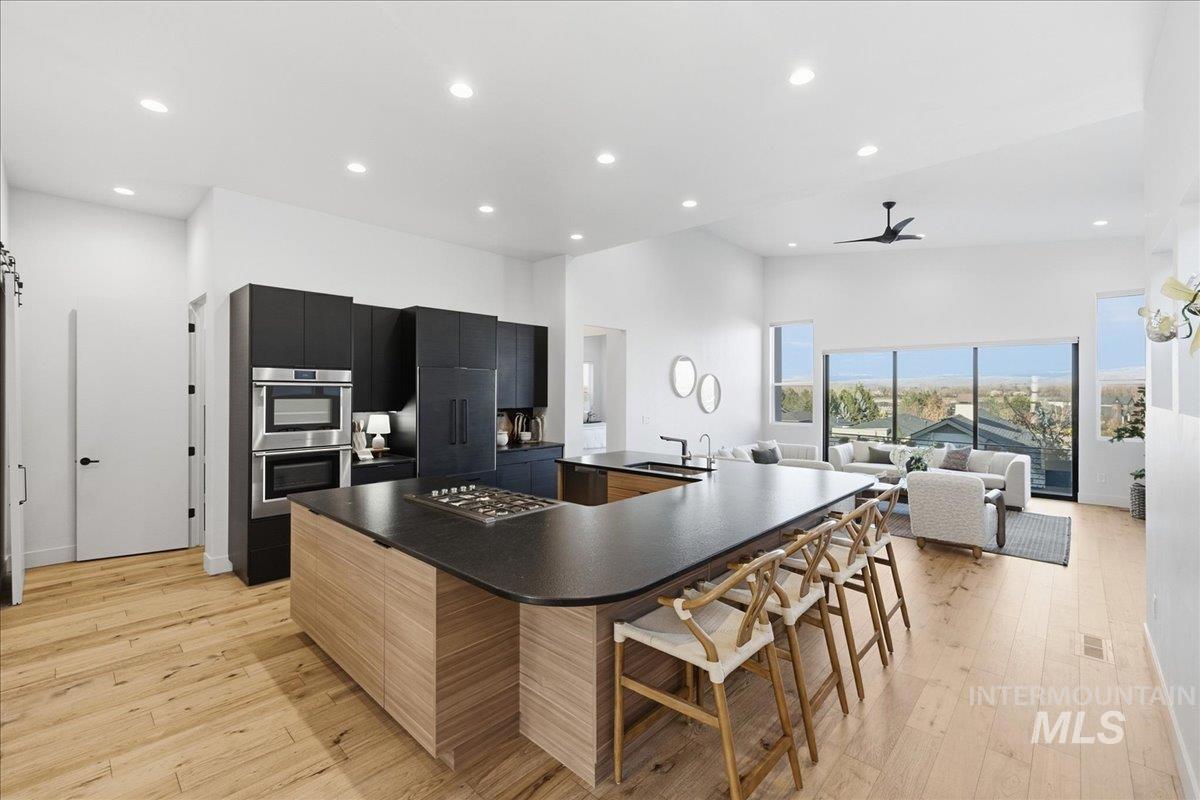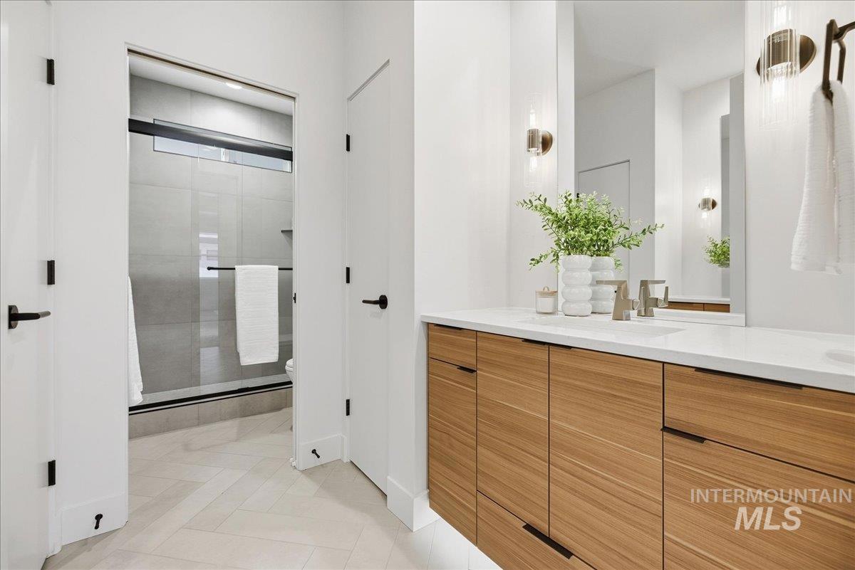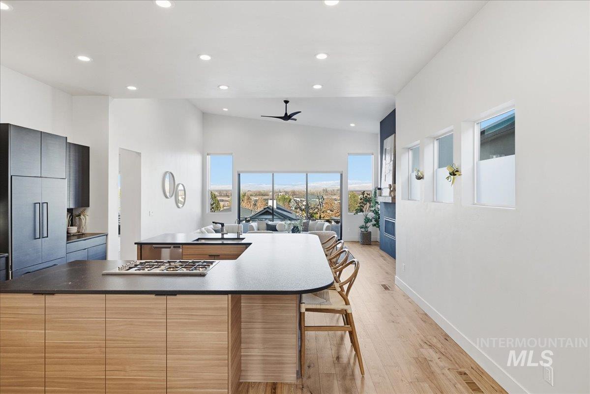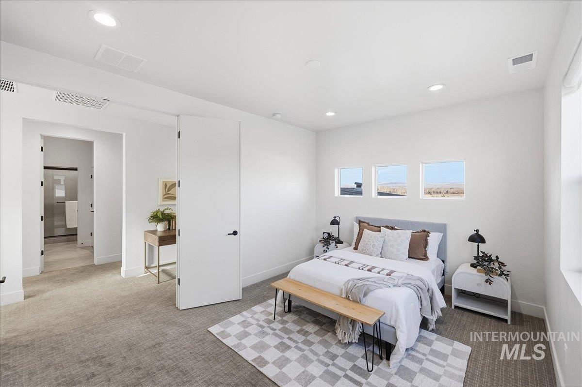 Introducing a stunning 2,835 sq. ft. high-end modern masterpiece offering the ultimate in luxury and convenience. This elegant home features 4 spacious bedrooms, 3.5 designer bathrooms, and a 3 garage with epoxy floors & a mini-split system, perfect for cars or projects. Perched atop a premier view lot, the home boasts breathtaking, uninterrupted views of Eagle and the Boise Foothills, ideal for enjoying serene sunsets. Open up the stacking slider out to the patio for seamless indoor/outdoor living, perfect for entertaining/gatherings. With a low-maintenance yard, you`ll enjoy luxurious living without the hassle of upkeep. The coveted Lakemoor Community also features Gated Privacy, Direct Greenbelt Access, Tennis/Pickleball courts, Basketball Court, 2 swimming pools, and walking distance to countless amenities! This is a rare opportunity to own a modern oasis with unbeatable views!