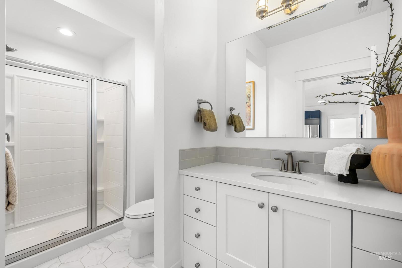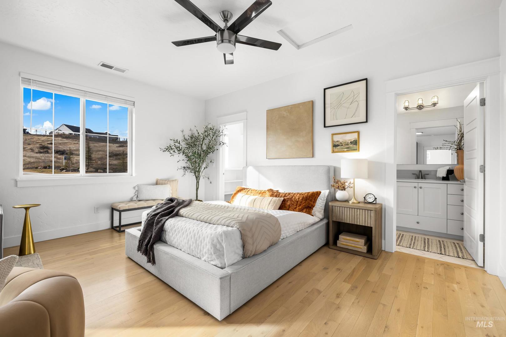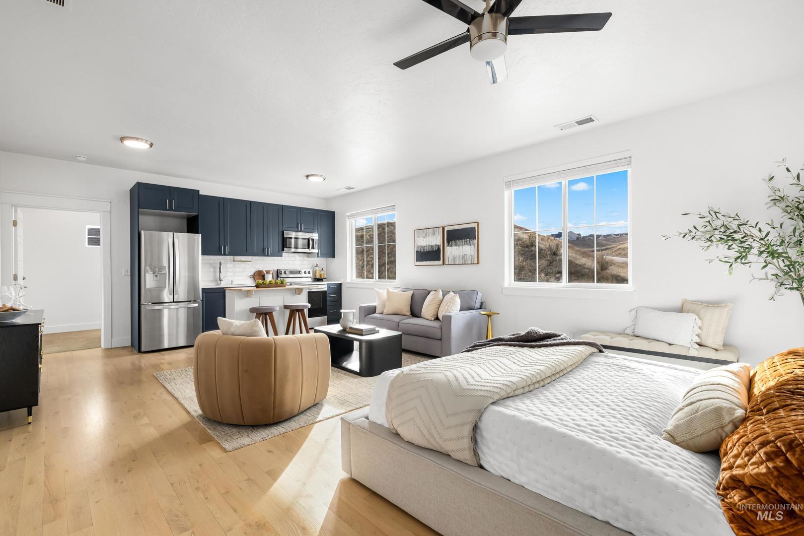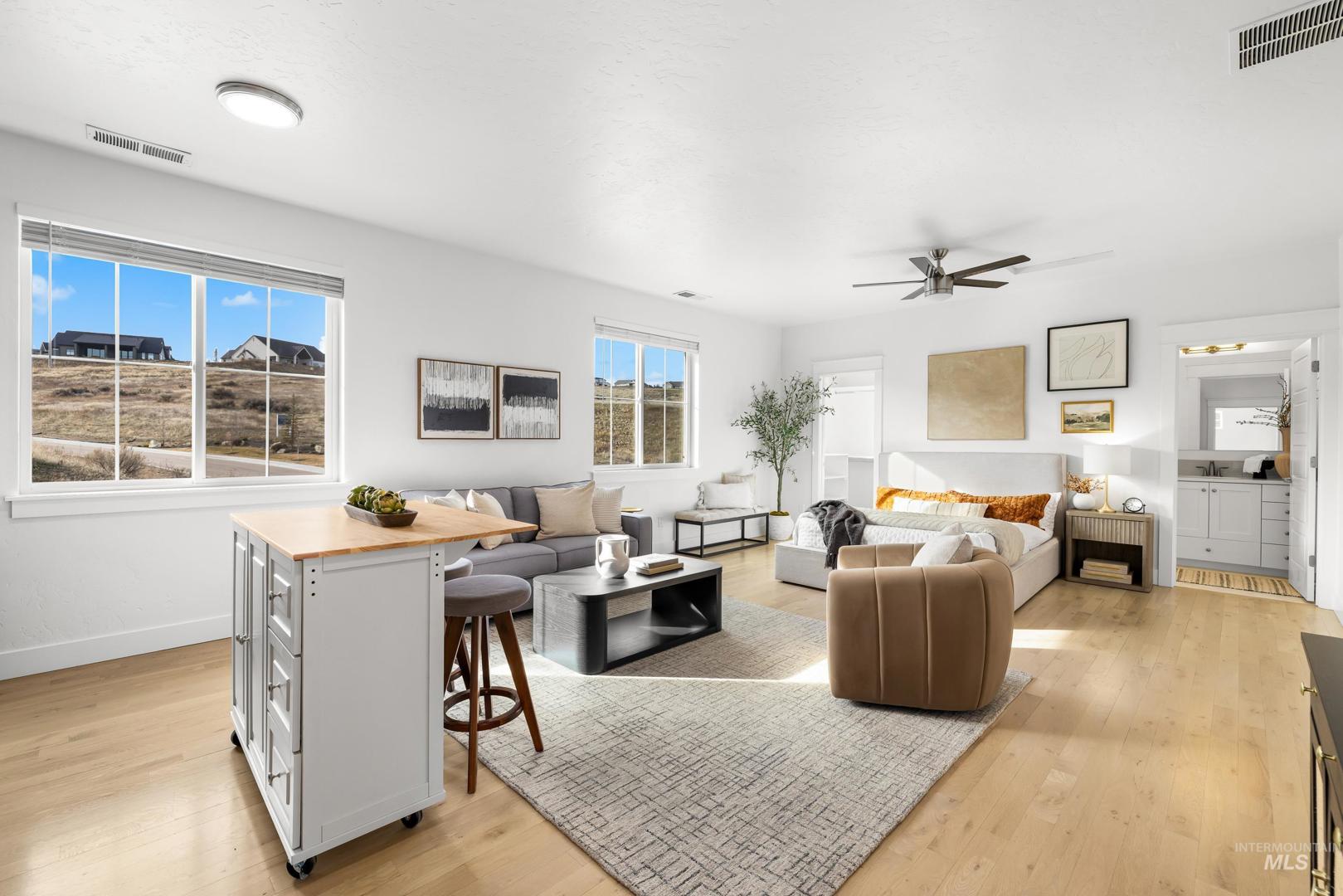 Thoughtfully customized and truly one-of-a-kind, this Brighton Homes home offers a flexible layout designed for real life, with expansive views that enhance the setting. The single-level main floor features a desirable primary suite, hardwood floors throughout most living areas + an open kitchen that flows seamlessly into the great room—anchored by a large island ideal for everyday living and entertaining. The home offers 3 bedrooms, 2.5 baths, and 2,515 sf, an expansive upstairs bonus apartment, and is impeccably clean! This private bonus space includes a full galley kitchen, bathroom, and large open living area and has been used as a yoga studio and extended living quarters. With a separate entrance and private courtyard, the apartment enjoys foothill views and offers excellent versatility for guests, multi-generational living, long-term visitors, a quiet work-from-home setup, or potential short-term vacation rental use, which is consistently in high demand within the community. Additional highlights include an oversized two-car garage with storage room, desirable corner lot, no backyard neighbors, common area in front, + foothill views that enhance both privacy and setting. Residents of Cartwright Ranch enjoy tree-lined streets, community pools, fitness facilities, miles of Ridge-to-Rivers trails, + the charm of nearby Hidden Springs—an inviting setting for an active lifestyle.