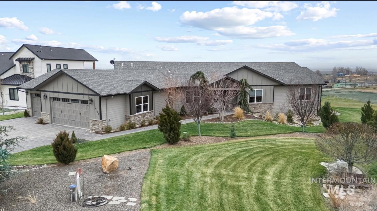 MOTIVATED SELLERS!! This home has a neighborhood community that makes you feel at peace. Whether you are enjoying a morning walk or a ride in a golf cart, you will enjoy the spectacular views this community has to offer. This Custom home features 3315 sq feet of living space offering 4 beds, 3.5 baths, and sits on 3.83 acres with panoramic views of the Owyhee Mountains and the Snake River. This home offers two on suites, an ensuite for two additional bedrooms, two large living rooms with a beautiful double fireplace, and the kitchen is a chef`s dream with a large bar counter top. The custom paver drive and walkway lead to a water feature by the front entry and a 3-car garage. Beautifully landscaped with plenty of grass to enjoy outdoor activities. The property has 2 tee boxes for the golf enthusiast and the change in elevation presents a unique challenge. Back covered patio has an inviting outdoor living room with TV wall mount, hookup for a propane fire pit, built-in BBQ and cooking area. Enjoy an evening in the stars with the open area where you can sit in the hot tub, and enjoy the breath-taking views of the Owyhee Mountains. Property has additional access off Charleston Rd- the perfect place to put a shop!