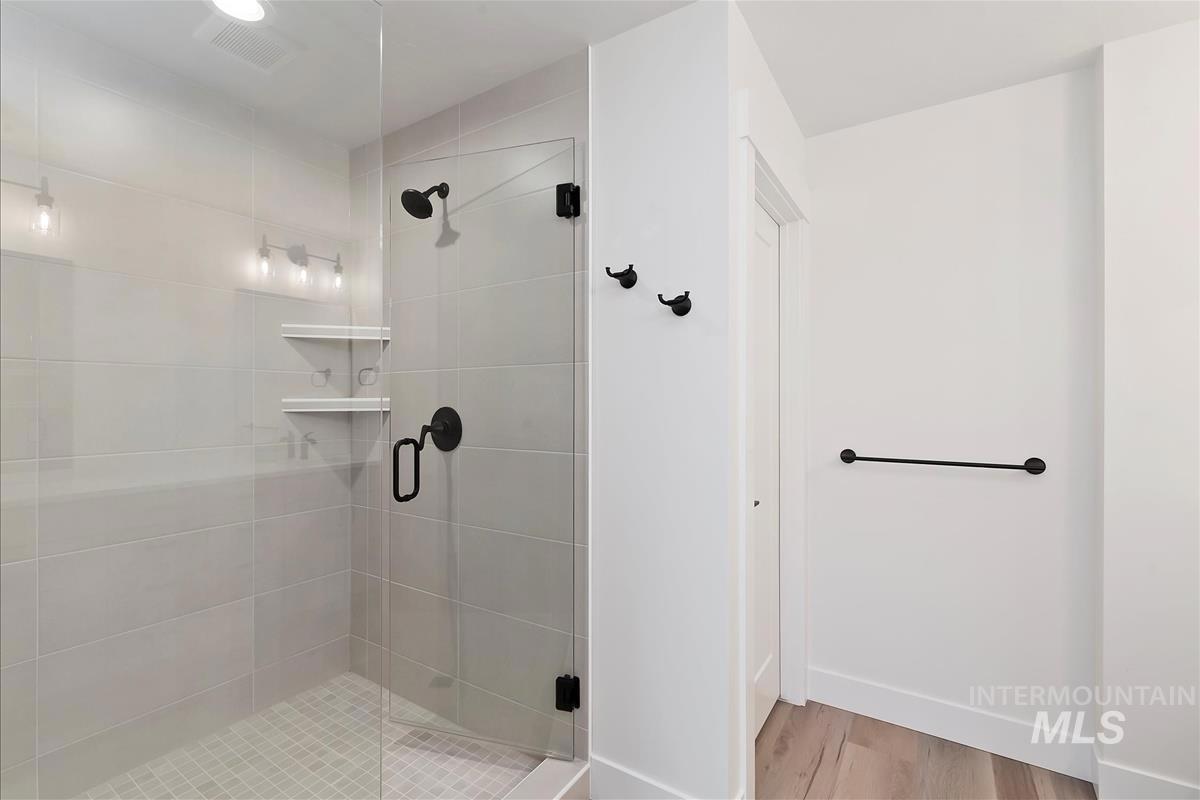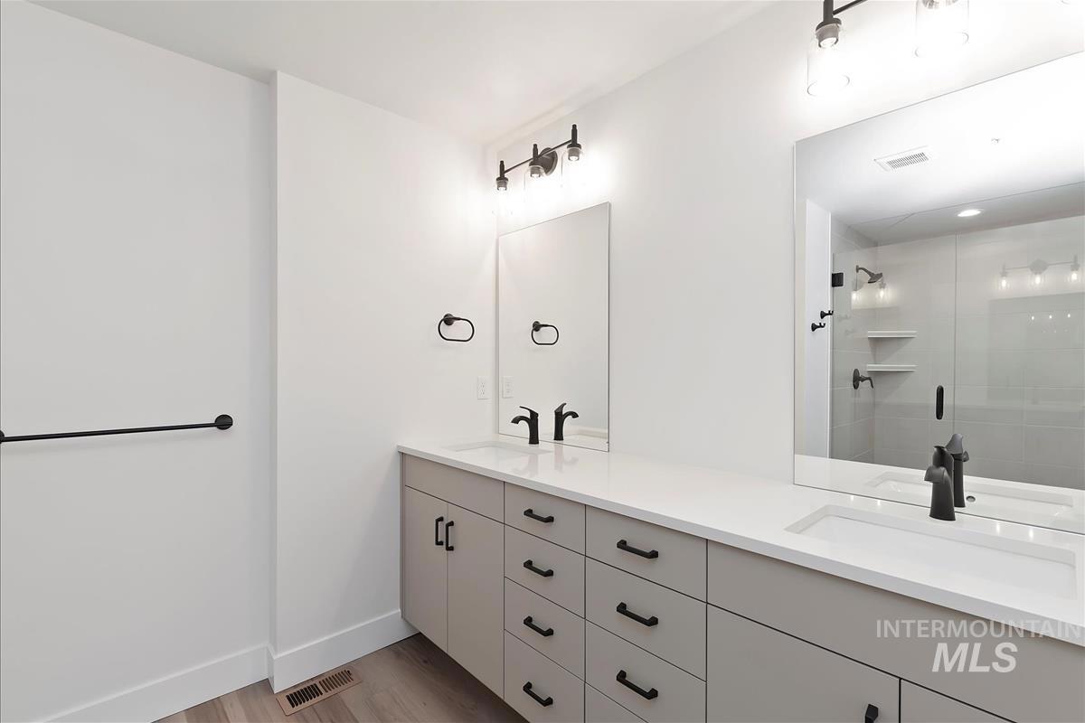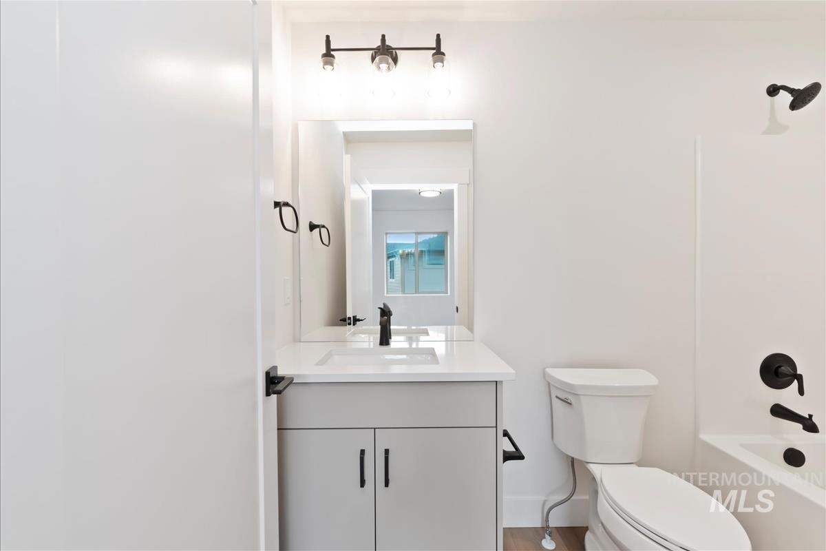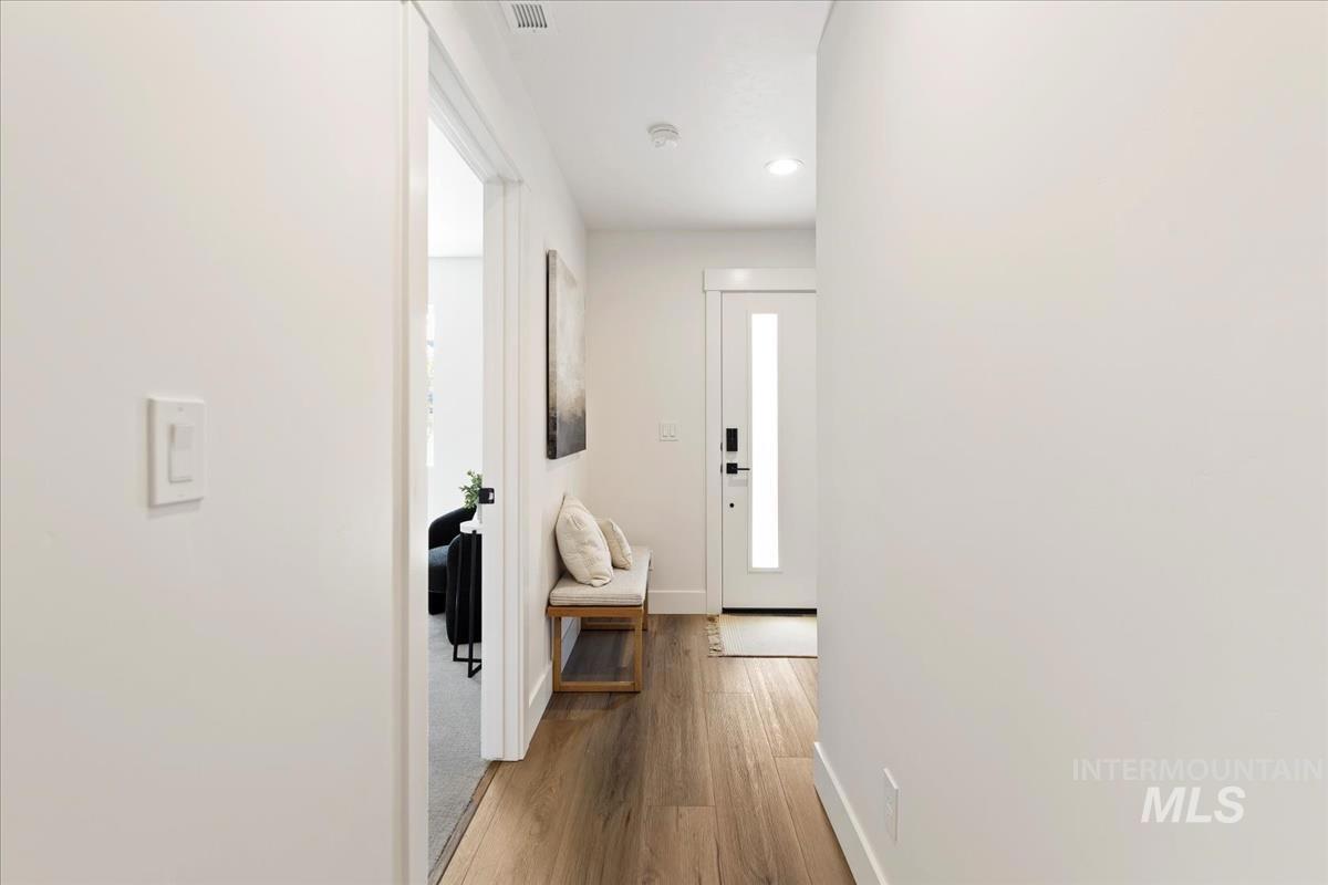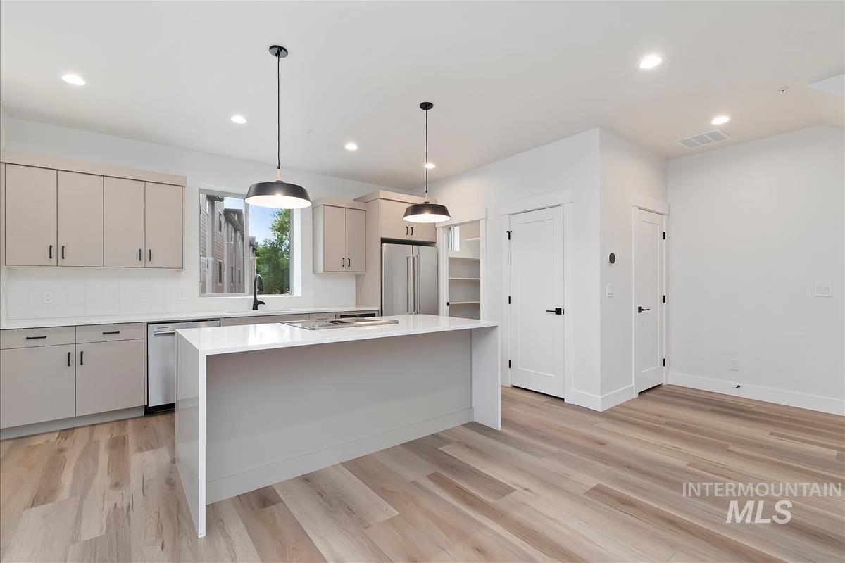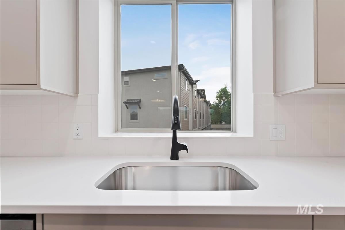 Welcome to this stylish, move-in-ready townhome offering a smart and versatile layout in a highly desirable location near the airport, freeway access, Downtown Boise, and Boise State University. The entry level features a private bedroom with a full bath, ideal for guests, a home office, or flexible living needs. The main living area showcases an open-concept design with durable luxury vinyl plank flooring, creating seamless flow for everyday living and entertaining. The modern kitchen features designer soft-close cabinetry with ample storage & a sleek, contemporary aesthetic, while the spacious Great Room provides a comfortable gathering space. Step outside to the covered patio,perfect for enjoying fresh air and low-maintenance outdoor living. The third floor offers two private bedroom suites, including the Primary Suite with dual vanities, quartz countertops, & elegant tile finishes, along with a secondary bedroom featuring its own ensuite bath, ideal for guests or roommates. Washer, dryer, blinds included