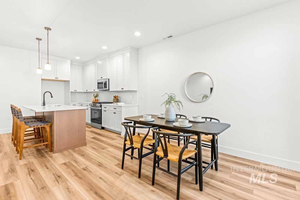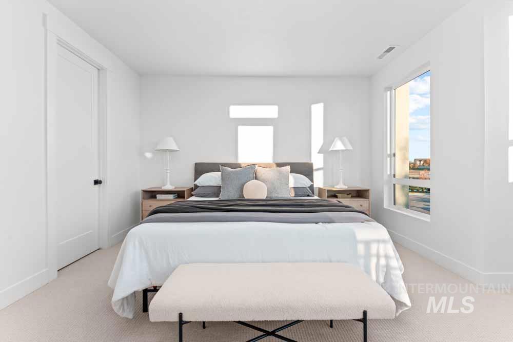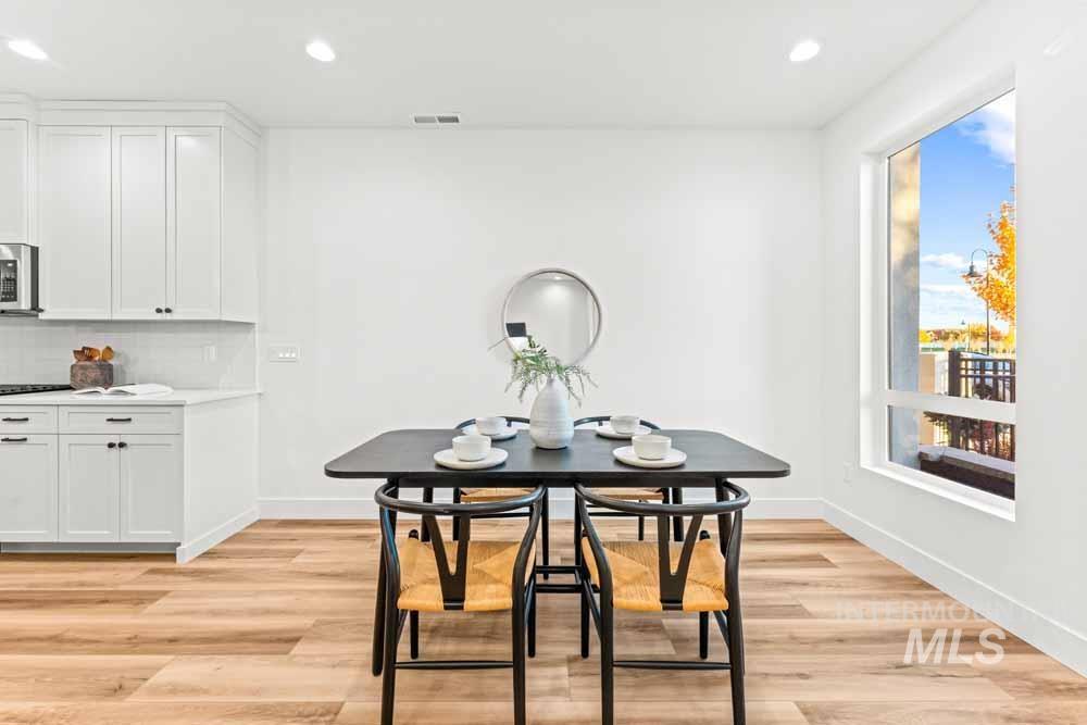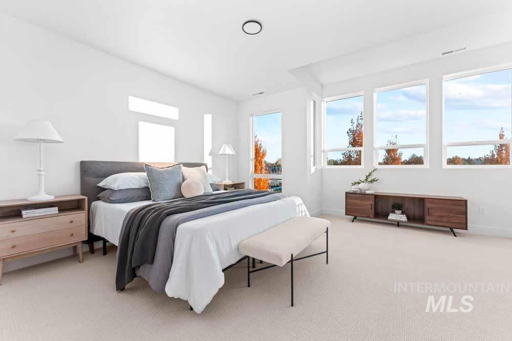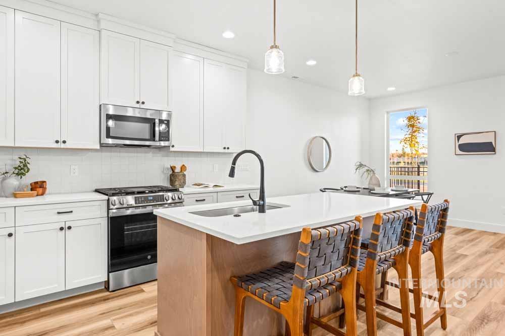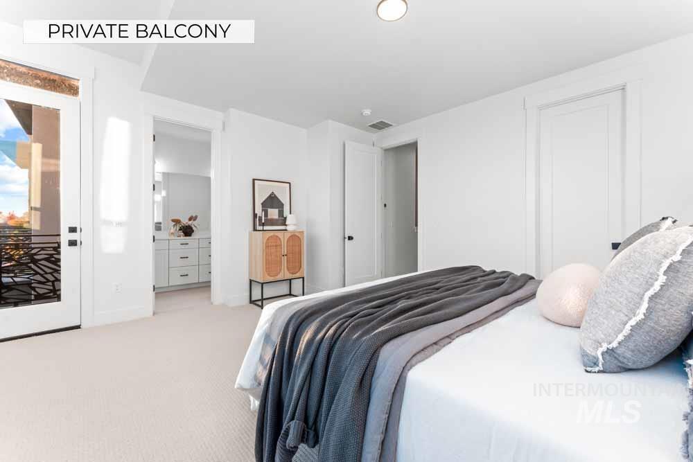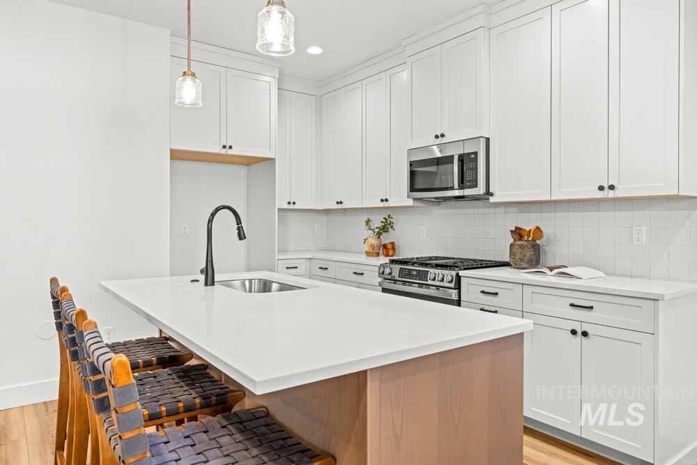 Introducing The Dayton at Molinari Park — a luxury townhome community set in the heart of downtown Eagle! Enjoy the ultimate walkable lifestyle just steps from Eagle’s premier dining, shopping, coffee shops, and nightlife. Thoughtfully designed with livability in mind, this home features 10-foot ceilings, wide-plank LVP flooring, and a spacious open-concept layout complimented with a warm, neutral palette. The kitchen features crisp white cabinetry, artisan square zellige tile backsplash, sparkling quartz countertops, and stainless steel appliances including a gas range. Upstairs, retreat to the private bedroom level. The master includes a private balcony, walk-in closet, and a beautifully finished en suite bath with a dual-sink vanity and frameless glass walk-in shower. Dedicated back entry 2-car garage. Live effortlessly at Molinari Park, where future on-site dining and coffee shops, lush landscaping, walking paths, a dog park, and an unbeatable location. Photo Similar.