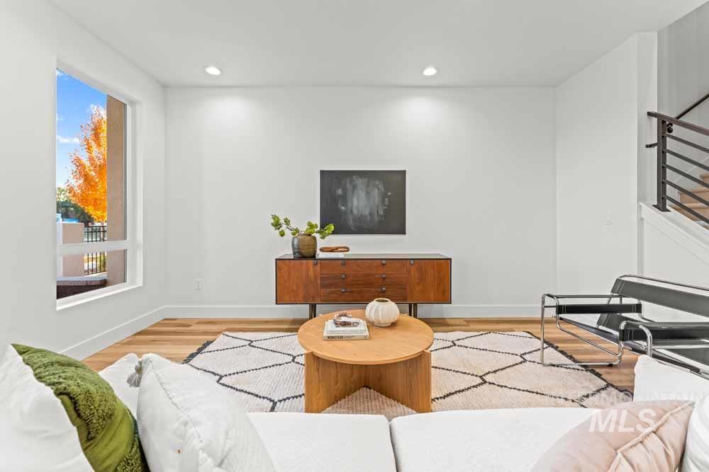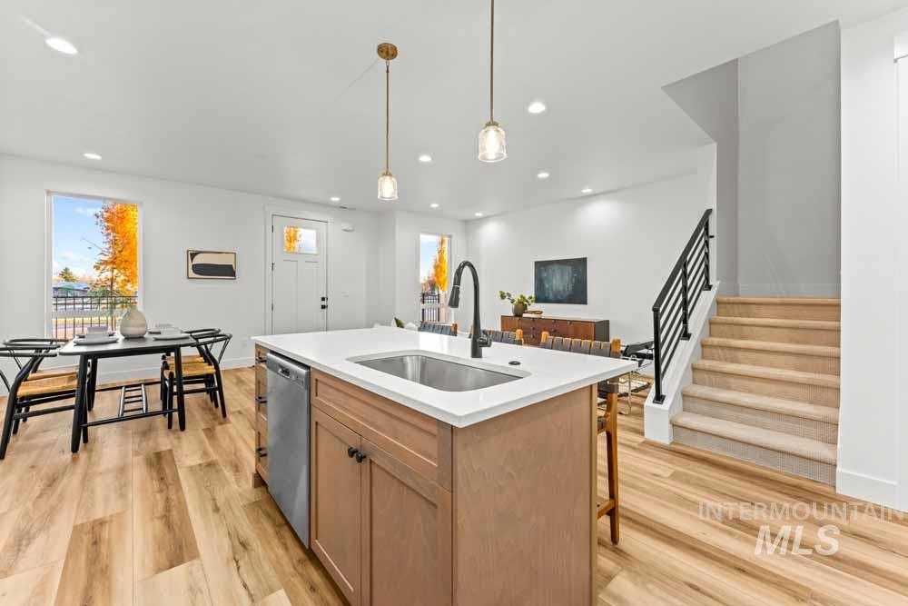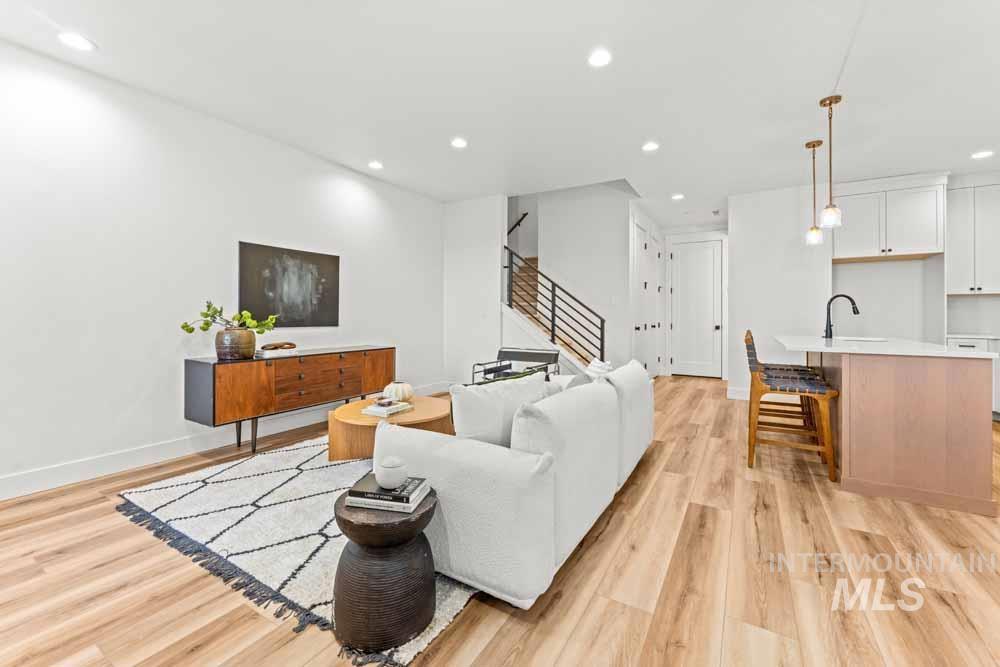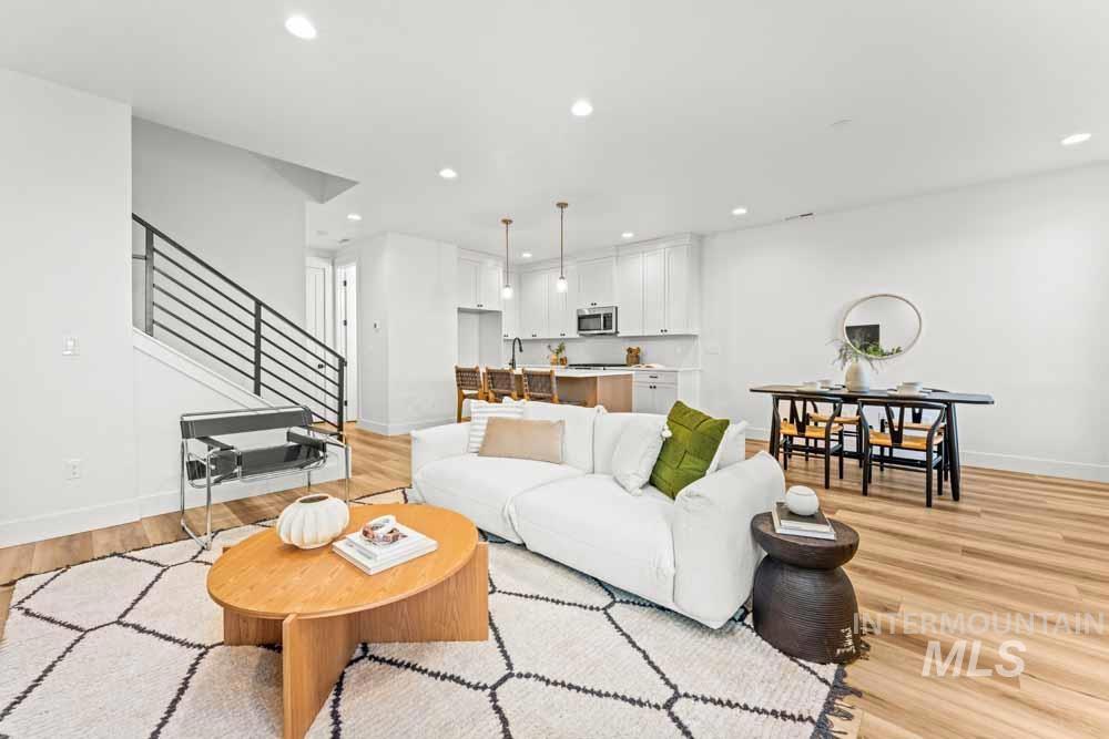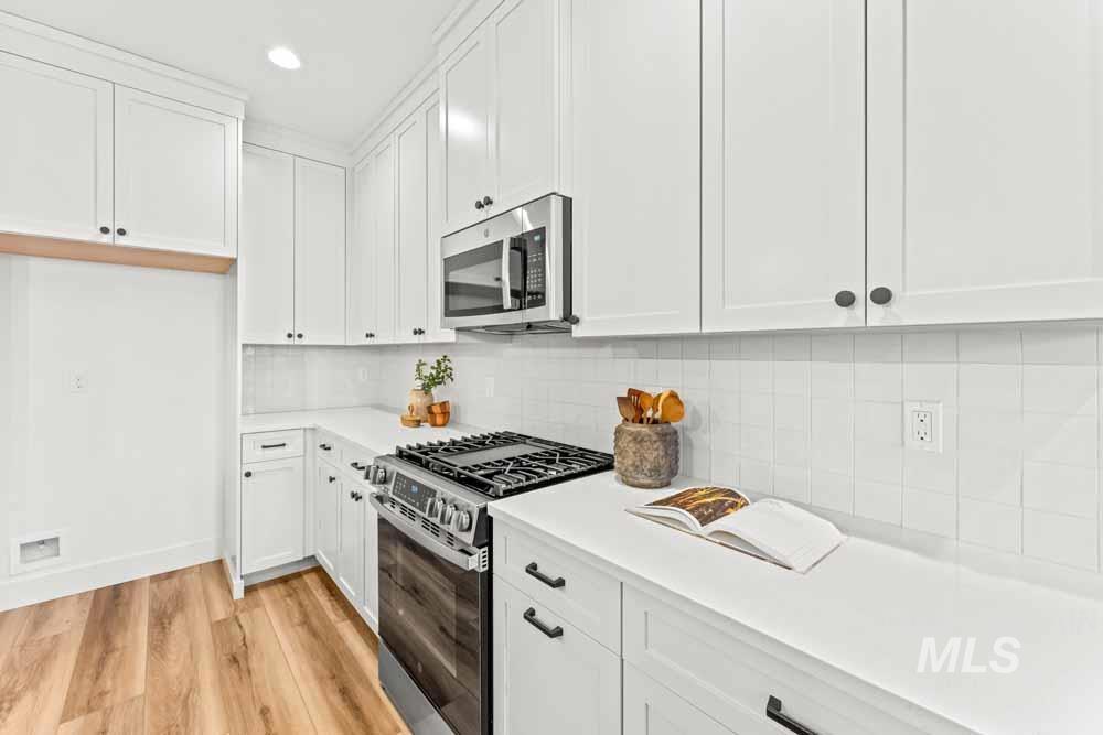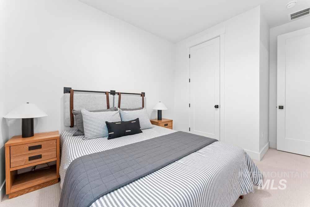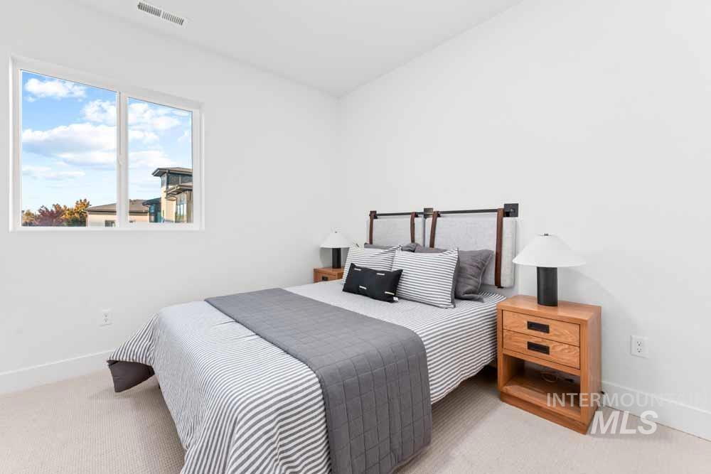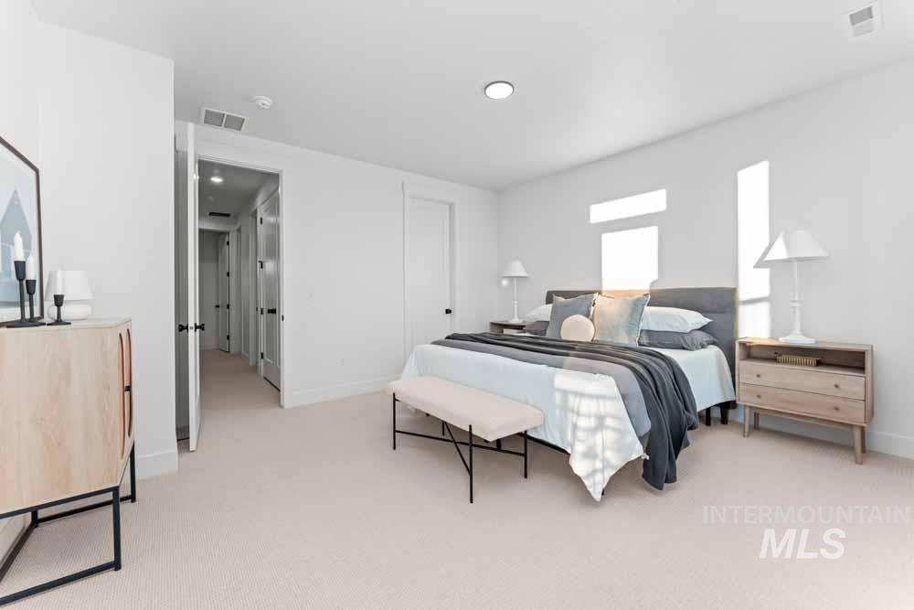 Introducing The Dayton at Molinari Park — a luxury townhome community set in the heart of downtown Eagle! Enjoy the ultimate walkable lifestyle just steps from Eagle’s premier dining, shopping, coffee shops, and nightlife. Thoughtfully designed with livability in mind, this home features 10-foot ceilings, wide-plank LVP flooring, and a spacious open-concept layout complimented with a warm, neutral palette. The kitchen features crisp white cabinetry, artisan square zellige tile backsplash, sparkling quartz countertops, and stainless steel appliances including a gas range. Upstairs, retreat to the private bedroom level. The master includes a private balcony, walk-in closet, and a beautifully finished en suite bath with a dual-sink vanity and frameless glass walk-in shower. Dedicated back entry 2-car garage. Live effortlessly at Molinari Park, where future on-site dining and coffee shops, lush landscaping, walking paths, a dog park, and an unbeatable location. Photo Similar.