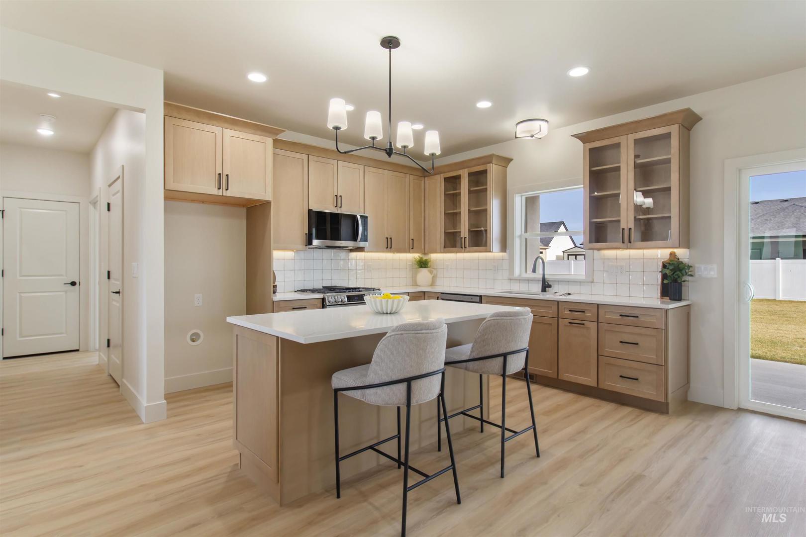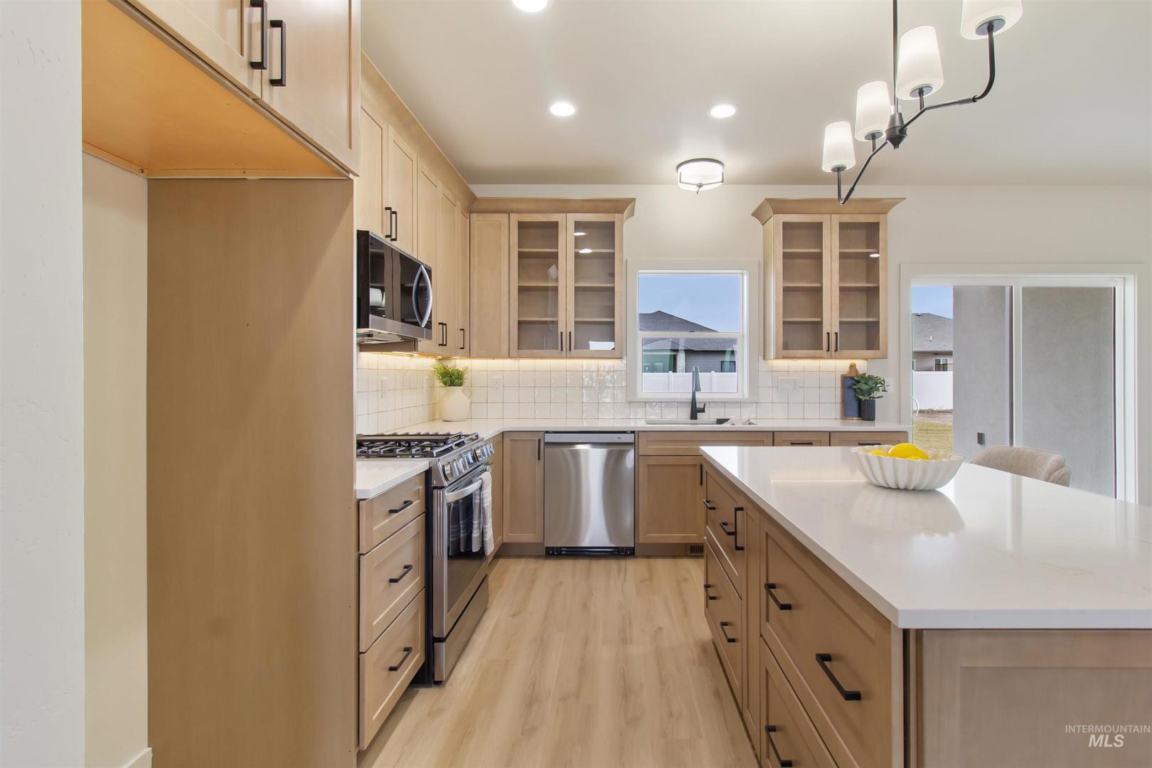 Beautiful new 4 BR / 2 BA home offering 1,770 sq. ft. of stylish, functional living in the desirable Ballard’s Way subdivision. The kitchen features upgraded wood cabinetry with glass-front accents, quartz countertops, tile backsplash, under-cabinet lighting, and LG stainless appliances, centered around a spacious island ideal for gathering and entertaining. The open living area is anchored by an upgraded electric fireplace with a custom-built Archistone hearth and floating shelves — creating a warm, elevated focal point filled with natural light. The primary suite offers a private retreat with a spa-inspired bath featuring a freestanding soaking tub, dual-head tiled shower with glass enclosure, matte black fixtures, and a double quartz vanity with LED light-up mirror. Three additional bedrooms are bright and spacious, complemented by a beautifully finished guest bath with quartz vanity, custom cabinetry, and a full tile surround with designer hex tile detail. A built-in mudroom bench, walk-in pantry, and generous storage throughout add both beauty and everyday practicality. Exterior upgrades include a striking blend of full stone, stucco, and painted siding, a stained front door, and upgraded wood-grain garage doors on a 3-car garage. The covered back patio and landscaped backyard offer excellent space for outdoor living and entertaining on the .275-acre lot.