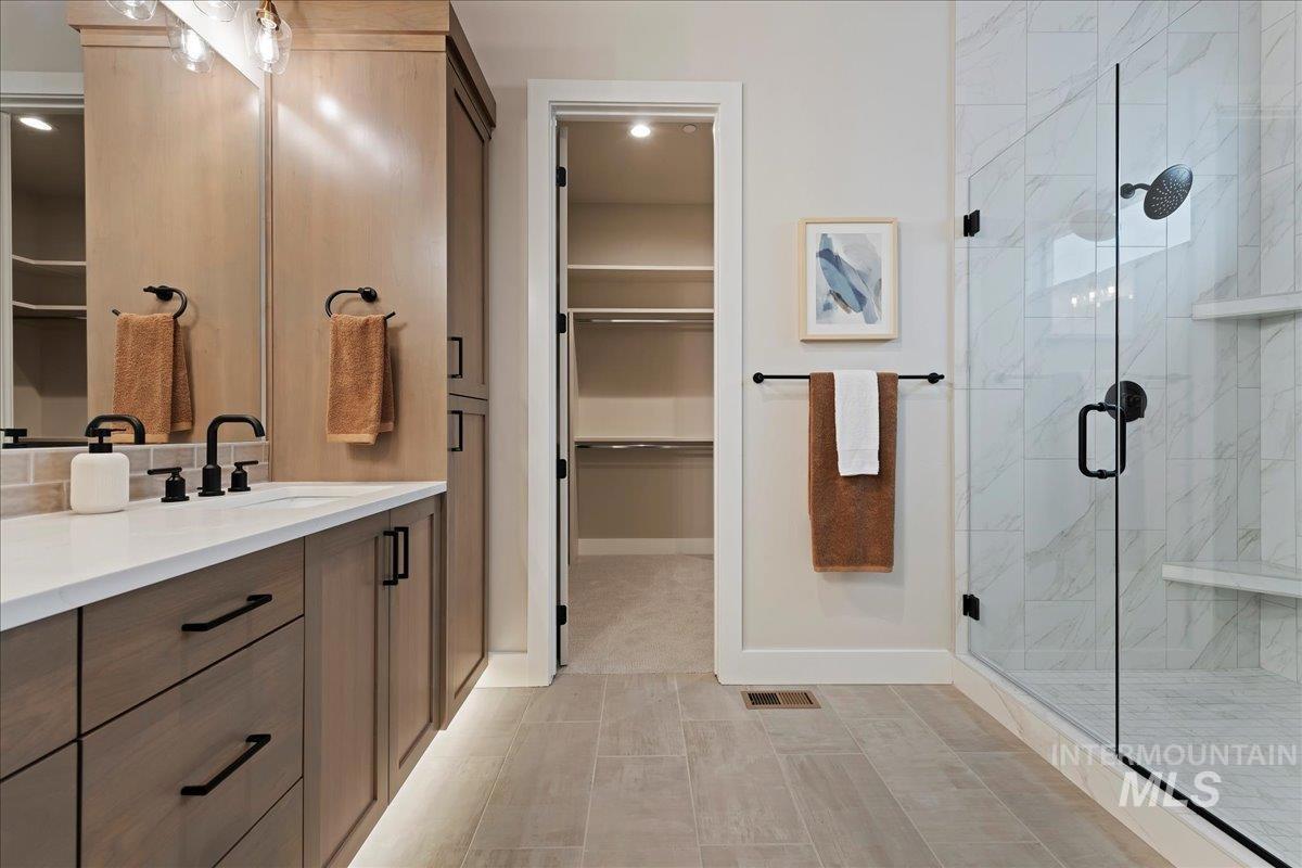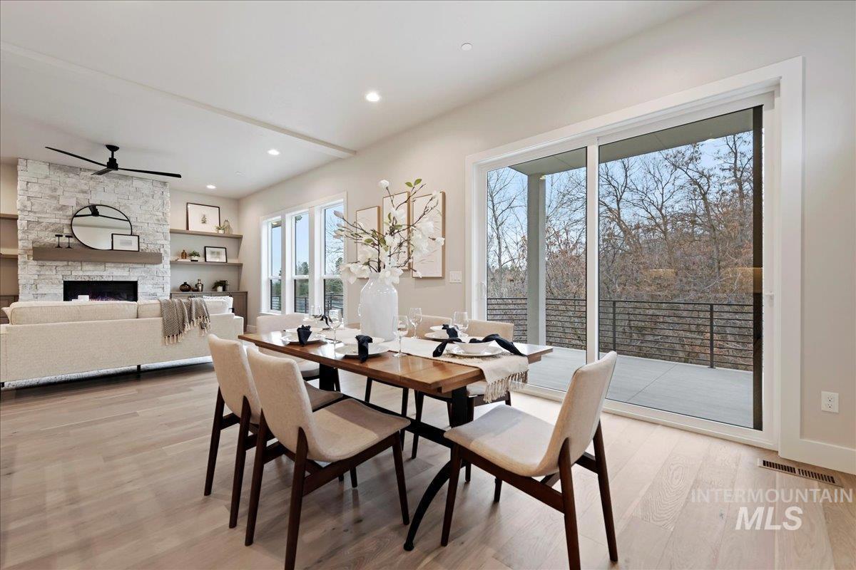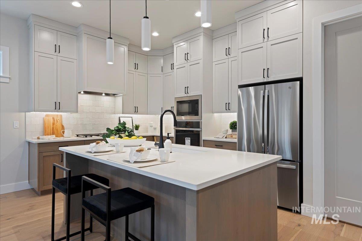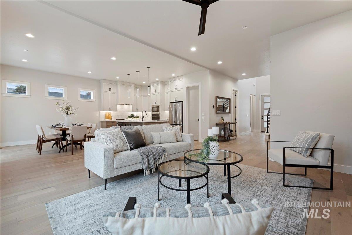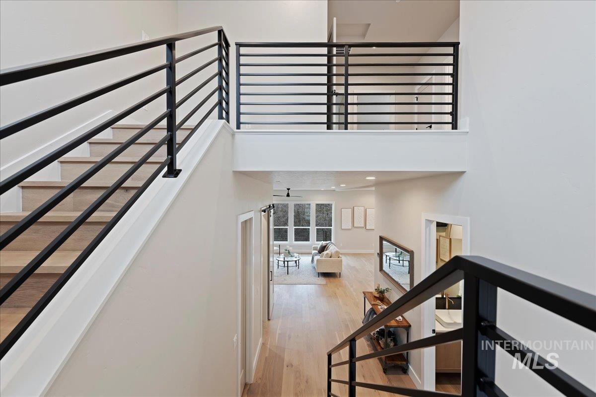 Brand-new custom home by Cameron Jayo Homes in the Somerset subdivision located in the heart of the North End. This exceptional residence offers a main level master suite, with walk-in shower with dual heads, walk-in closet with custom built ins. There are spacious living areas upstairs for added versatility and privacy. The great room features a welcoming gas fireplace for cozy gatherings, that can be viewed from the dining or living room. The kitchen showcases premium finishes and a contemporary design , complemented by engineered hardwood flooring throughout. The Fourth bedroom is flexible- perfect as a bonus room, theater, or adaptable space to fit you need. Separate office allows private space for the work from home person. This subdivision is associated with the 7 acres community park, two clubhouses, pool, soccer fields, pickleball courts, and a workout room . Two covered decks allow outdoor living to be combined with indoor living.You have city views from both levels of this custom home. Brand new homes are hard to come by in the North End. The cul-de-sac location ads privacy and low traffic living. Walking distance to the Hyde park area, the foothills, and the Boise schools. A signature Cameron Jayo home design, renowned for innovative layouts, premium finishes, and meticulous craftsmanship. Give us a call for a private showing and details about the amazing subdivision.