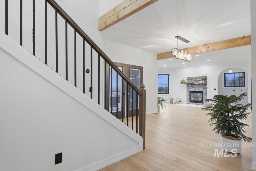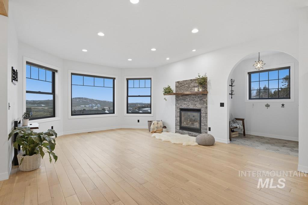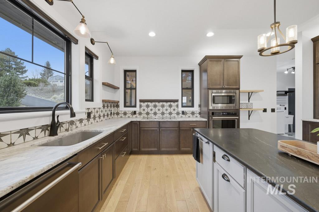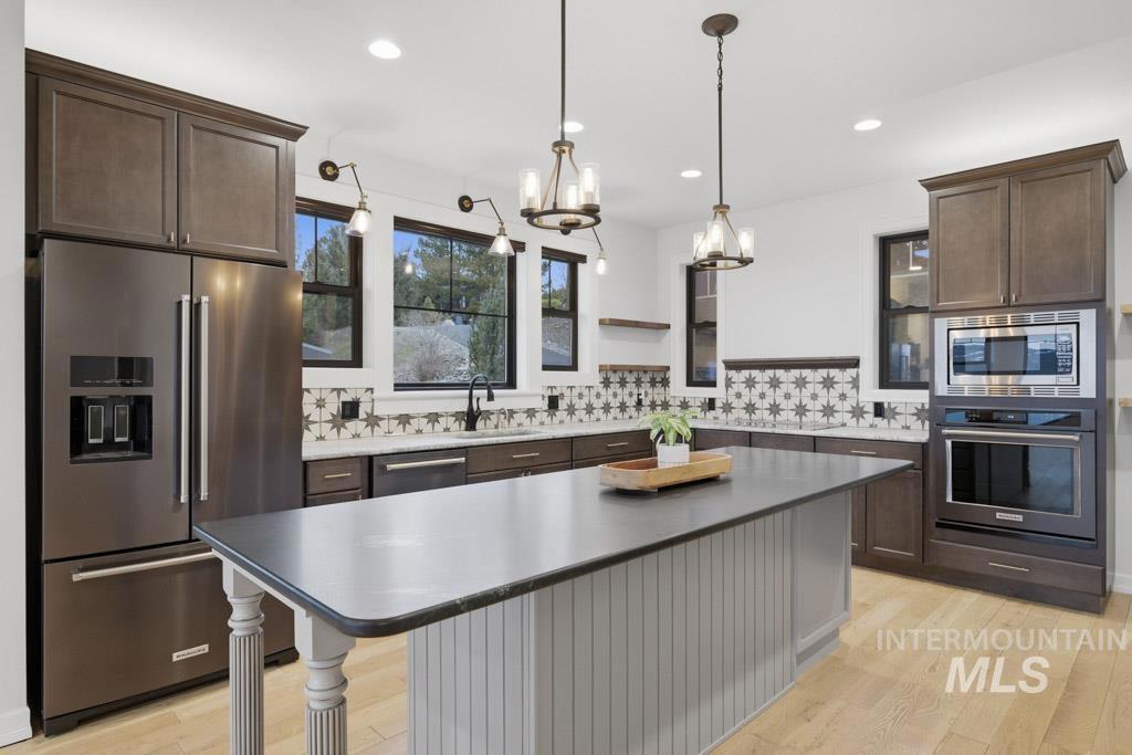 Experience effortless luxury in this spectacular custom home, strategically positioned on a third-acre in one of Moscow`s premier neighborhoods. Designed for seamless main-level living, this 4-bedroom, 3-bath residence features an open floor plan that flows from the garage and mudroom into a stunning interior defined by 9` ceilings, white oak floors, and cedar beams. The gourmet kitchen is a chef’s dream, featuring granite counters, high-end appliances including induction cooktop, wall oven & wall microwave and a large pantry with a charming antique barn door. The main level hosts the primary suite plus two additional bedrooms, including one with an ensuite bath. Upstairs, a bright stairwell illuminated by skylights leads to a generously sized 4th bedroom and a family/bonus room. High-quality Anderson windows throughout capture natural light and provide sweeping, unobstructed views of Paradise Ridge, making the great room and porch the ultimate spots to watch the sunset. The outdoor space is equally impressive with a covered patio and beautifully landscaped yard providing gardens with stone pathways, and quaint resting places to unwind from your day. A unique heated mini-shop with electricity attached to its own mini garage/door offers a versatile space for an office, studio, kids space, workshop. This property offers the perfect blend of artistic detail and functional design.
