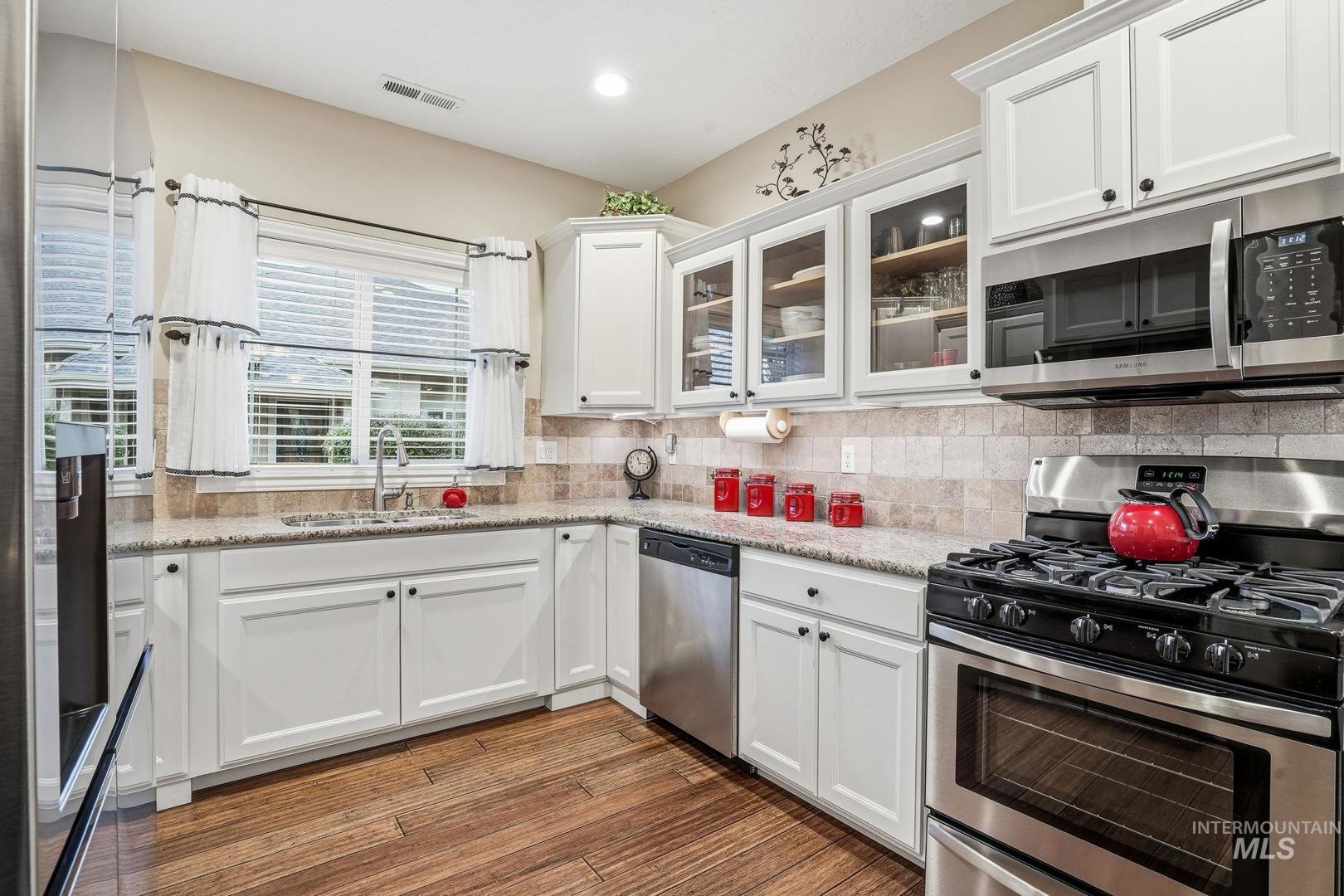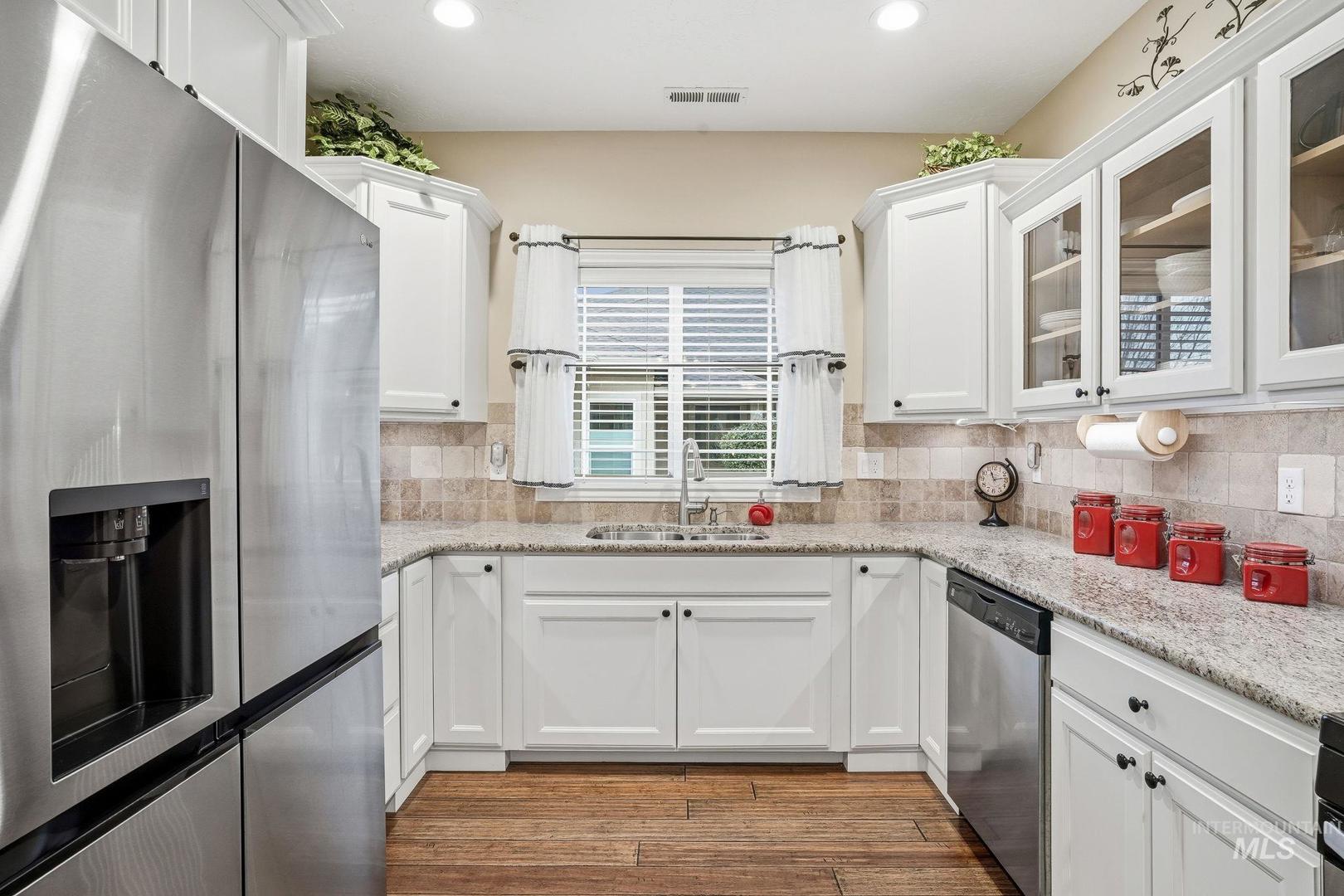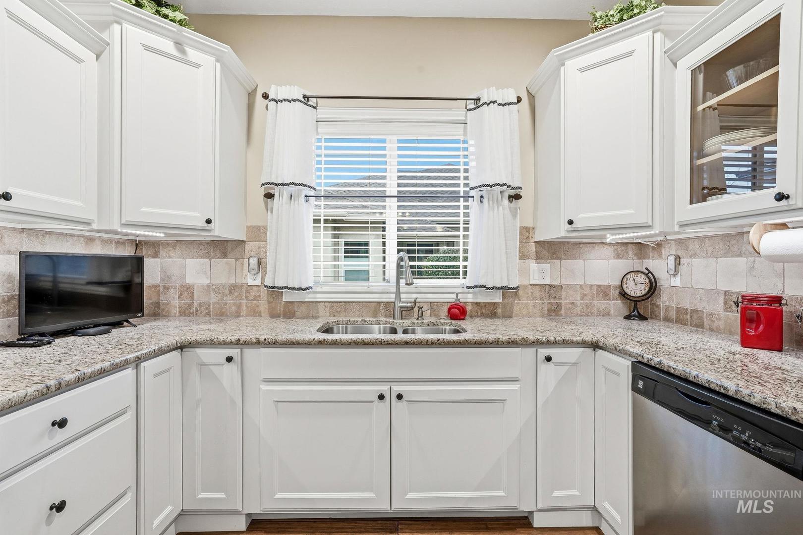 This impeccably maintained, single-level townhome is owned by its original resident and situated in one of Meridian`s most desirable areas. Enjoy a maintenance-free lifestyle, with the HOA providing care for common areas, lawn maintenance, tree upkeep, exterior water and sprinklers, snow removal, and landscaping. The thoughtfully designed layout offers over 1,600 square feet of living space and features numerous high-end upgrades, including granite countertops, engineered hardwood flooring, custom tile work and a beautiful stone fireplace. The spacious primary suite includes a walk-in closet and an en-suite bath with a tiled shower in excellent condition. A second bedroom also offers direct access to a full bathroom, allowing for flexible use as an additional suite. Recent updates include premium Low E glass storm doors installed at both entrances, a new water heater (2025), microwave (2024), conditioned crawlspace vent exhaust replacement (2023), resurfaced driveway, and updated carpeting. Hurry to secure this beautiful lock and leave home!