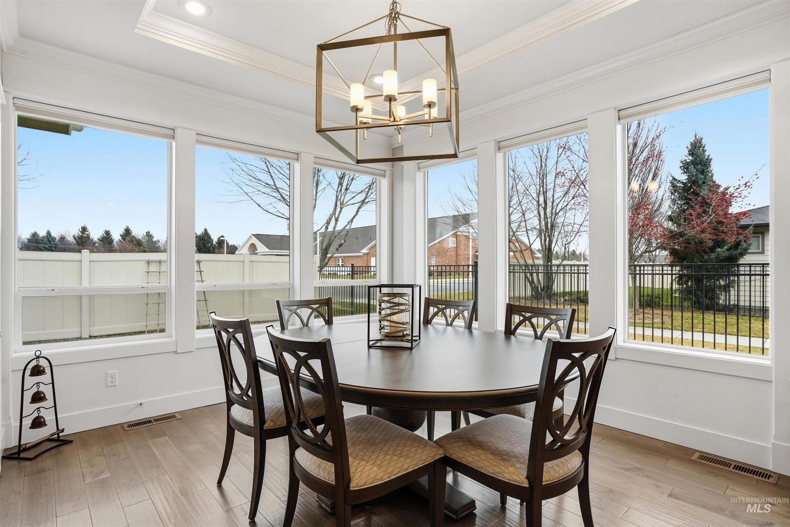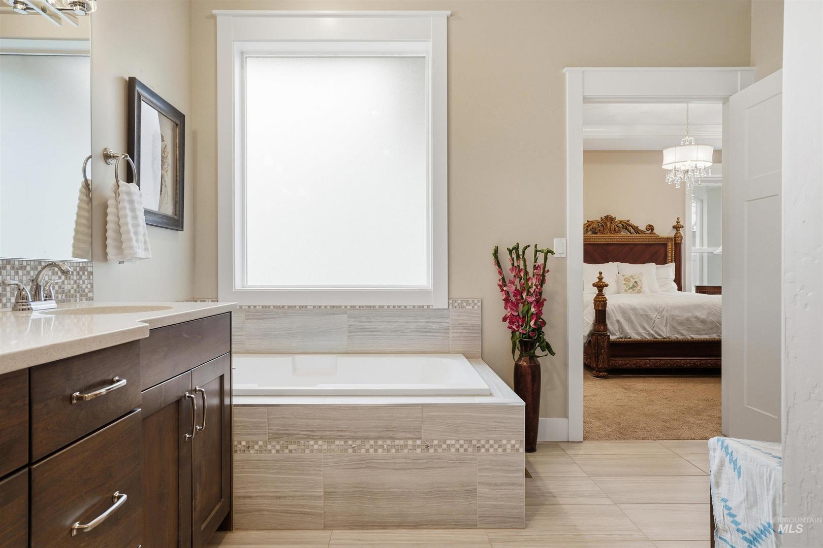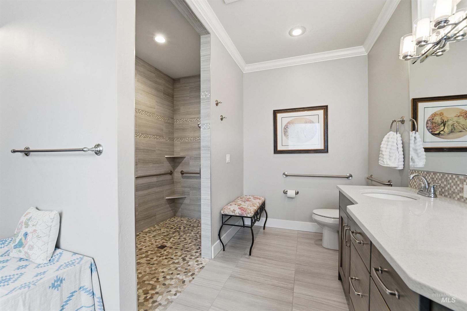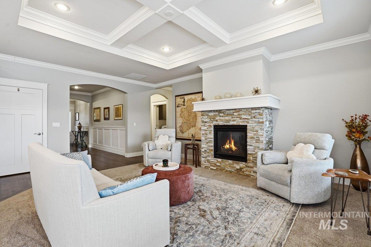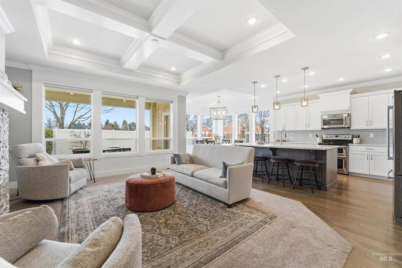 This single-level Todd Campbell home in coveted Ashbury offers elegant ambiance and architectural detail. A gracious gallery-style entry leads to a spacious light-filled open concept living area with custom coffered ceiling and gas fireplace. Three custom millwork window walls with luxe motorized top-down/bottom-up light-filtering honeycomb shades frame peaceful eastern views like artwork in the living and adjoining tray-ceiling dining area. The roomy chef’s kitchen, with pre-installed gas line, dual oven electric-convection range, quartz counters, tile backsplash, crowned cabinetry and large curved island provides effortless circulation and ample prep, serving, and gathering space. Upscale finishes extend throughout this move-in-ready retreat. The private spa-like primary suite has dual vanities, soaker tub, large zero-threshold shower, custom walk-in closet. Two additional bedrooms share an updated bath with a pristine tiled glass-door shower. Other highlights:1-yr old upscale HVAC adding to home’s energy efficiency, accessible living low-profile thresholds—wide passages—36” doors, beautiful hardwood floors, office nook, pantry, mudroom, laundry, oversized epoxy-floor garage, conditioned crawl, and covered patio. Close to top public and private schools, Costco, The Village. Enjoy Ashbury’s scenic walking paths, amenities, and a peaceful, elevated, and undeniably special home.