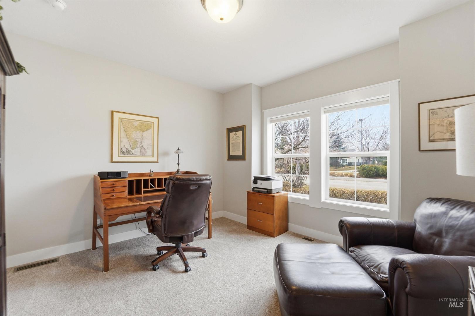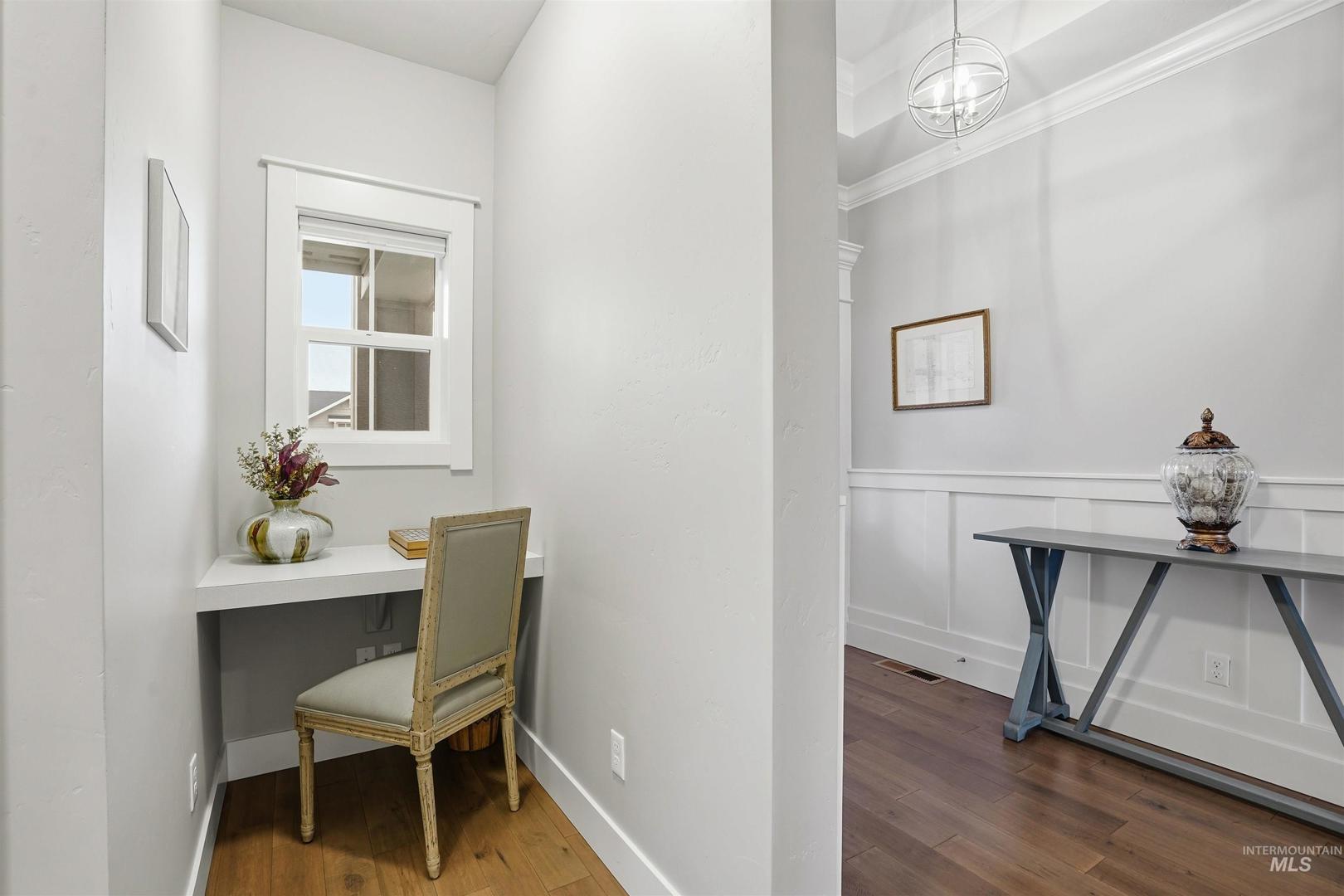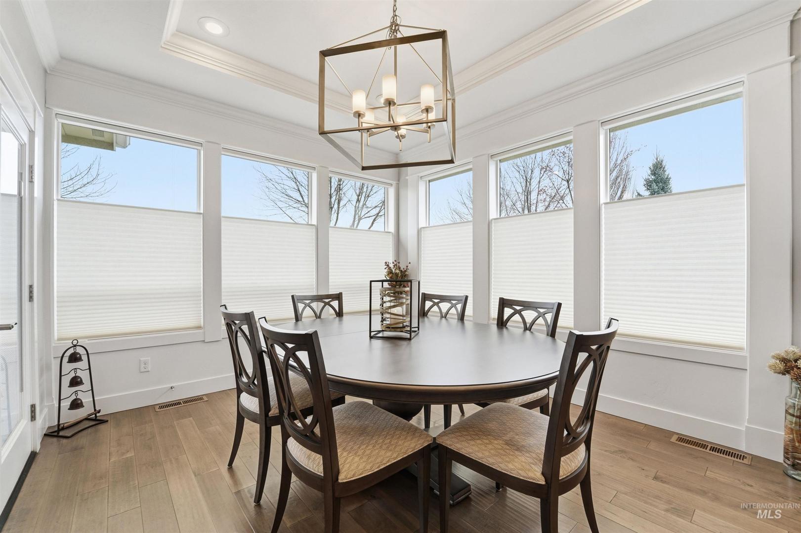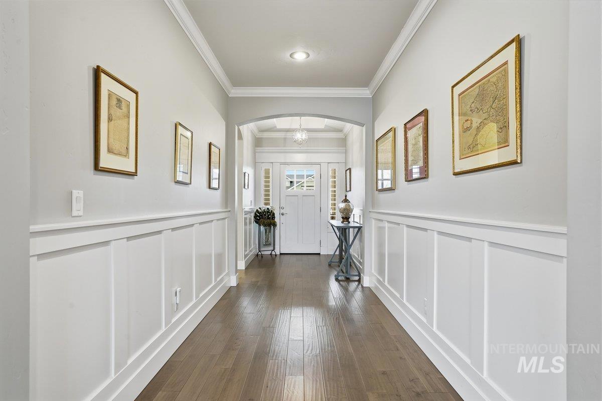This single-level Todd Campbell home in coveted Ashbury offers elegant ambiance and architectural detail. A gracious gallery-style entry leads to a spacious light-filled open concept living area with custom coffered ceiling and gas fireplace. Three custom millwork window walls with luxe motorized top-down/bottom-up light-filtering honeycomb shades frame peaceful eastern views like artwork in the living and adjoining tray-ceiling dining area. The roomy chef’s kitchen, with pre-installed gas line, dual oven electric-convection range, quartz counters, tile backsplash, crowned cabinetry and large curved island provides effortless circulation and ample prep, serving, and gathering space. Upscale finishes extend throughout this move-in-ready retreat. The private spa-like primary suite has dual vanities, soaker tub, large zero-threshold shower, custom walk-in closet. Two additional bedrooms share an updated bath with a pristine tiled glass-door shower. Other highlights:1-yr old upscale HVAC adding to home’s energy efficiency, accessible living low-profile thresholds—wide passages—36” doors, beautiful hardwood floors, office nook, pantry, mudroom, laundry, oversized epoxy-floor garage, conditioned crawl, and covered patio. Close to top public and private schools, Costco, The Village. Enjoy Ashbury’s scenic walking paths, amenities, and a peaceful, elevated, and undeniably special home.