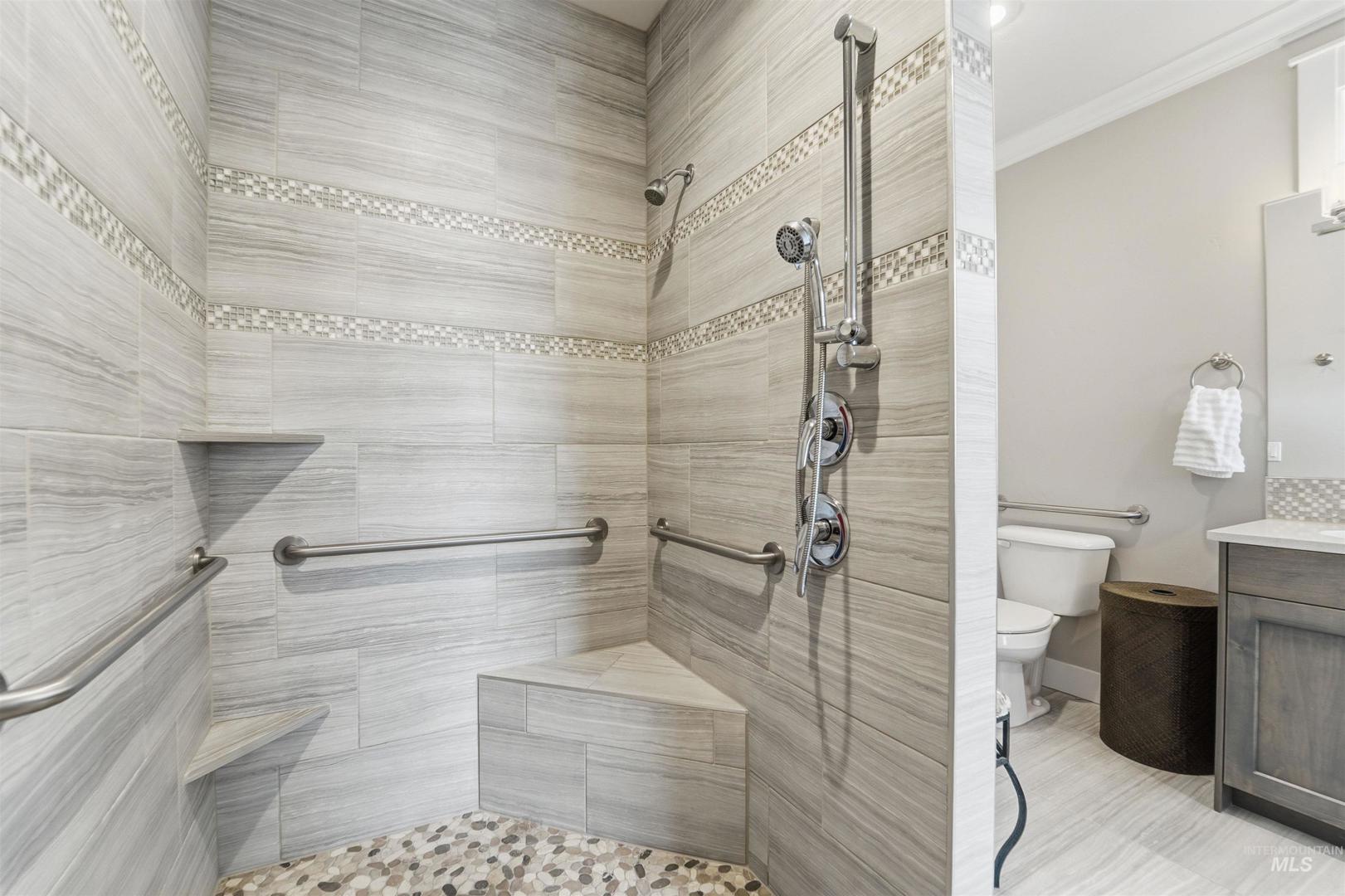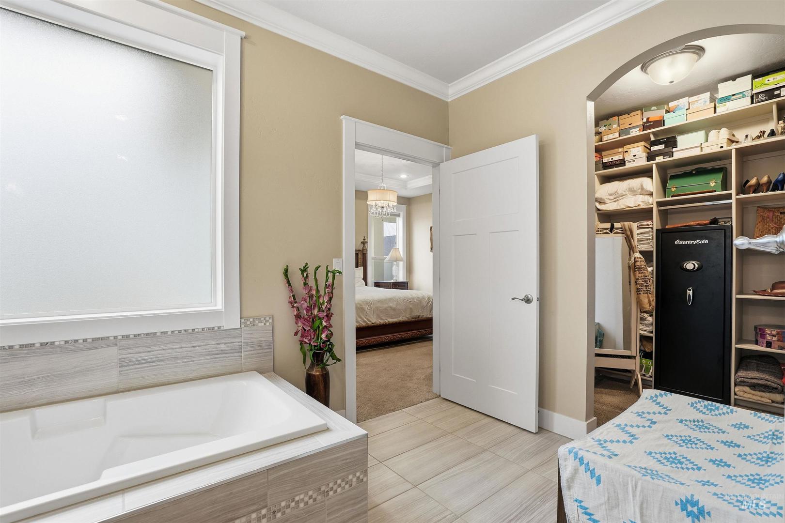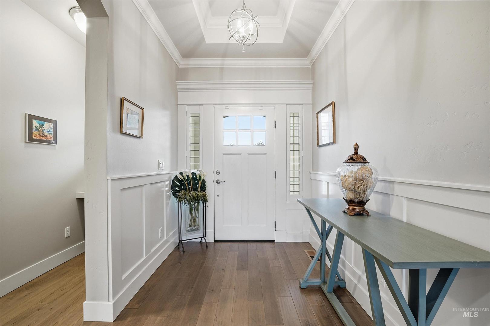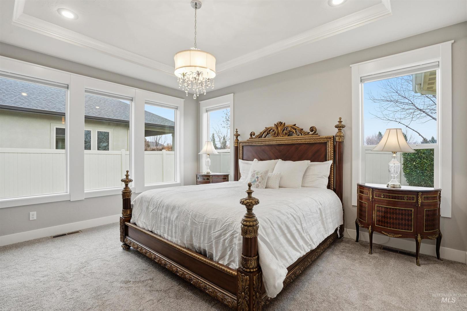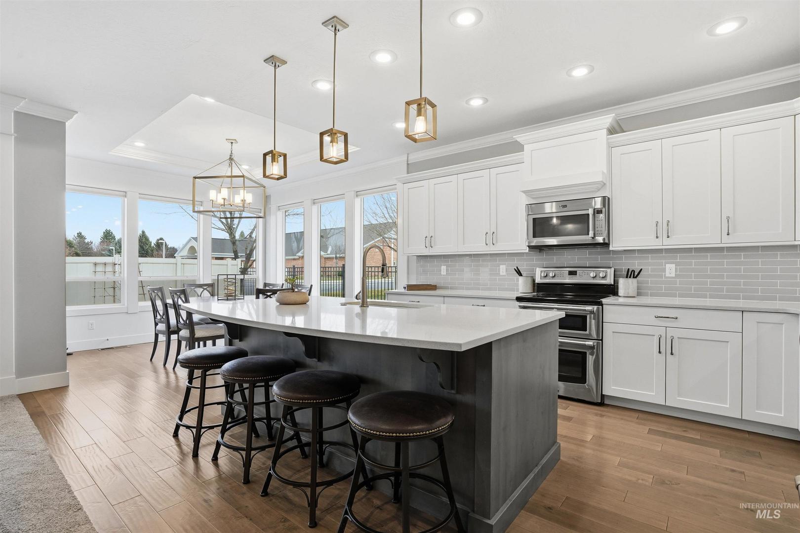 This single-level Todd Campbell home in coveted Ashbury offers elegant ambiance and architectural detail. A gracious gallery-style entry leads to a spacious light-filled open concept living area with custom coffered ceiling and gas fireplace. Three custom millwork window walls with luxe motorized top-down/bottom-up light-filtering honeycomb shades frame peaceful eastern views like artwork in the living and adjoining tray-ceiling dining area. The roomy chef’s kitchen, with pre-installed gas line, dual oven electric-convection range, quartz counters, tile backsplash, crowned cabinetry and large curved island provides effortless circulation and ample prep, serving, and gathering space. Upscale finishes extend throughout this move-in-ready retreat. The private spa-like primary suite has dual vanities, soaker tub, large zero-threshold shower, custom walk-in closet. Two additional bedrooms share an updated bath with a pristine tiled glass-door shower. Other highlights:1-yr old upscale HVAC adding to home’s energy efficiency, accessible living low-profile thresholds—wide passages—36” doors, beautiful hardwood floors, office nook, pantry, mudroom, laundry, oversized epoxy-floor garage, conditioned crawl, and covered patio. Close to top public and private schools, Costco, The Village. Enjoy Ashbury’s scenic walking paths, amenities, and a peaceful, elevated, and undeniably special home.