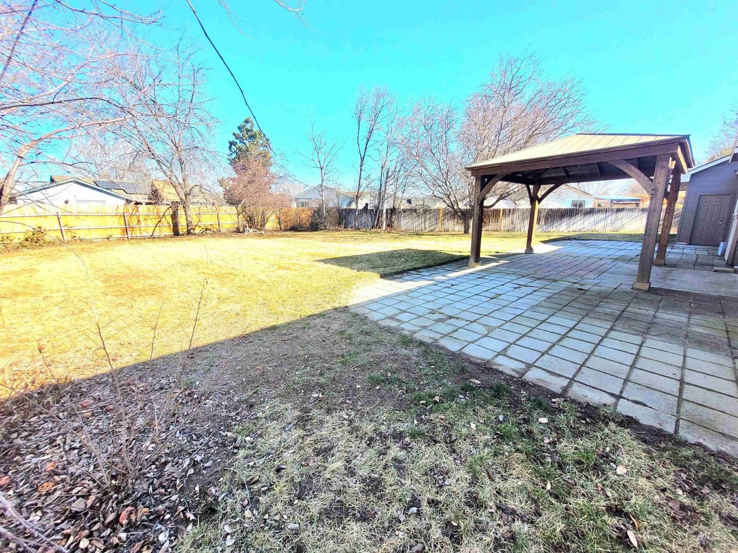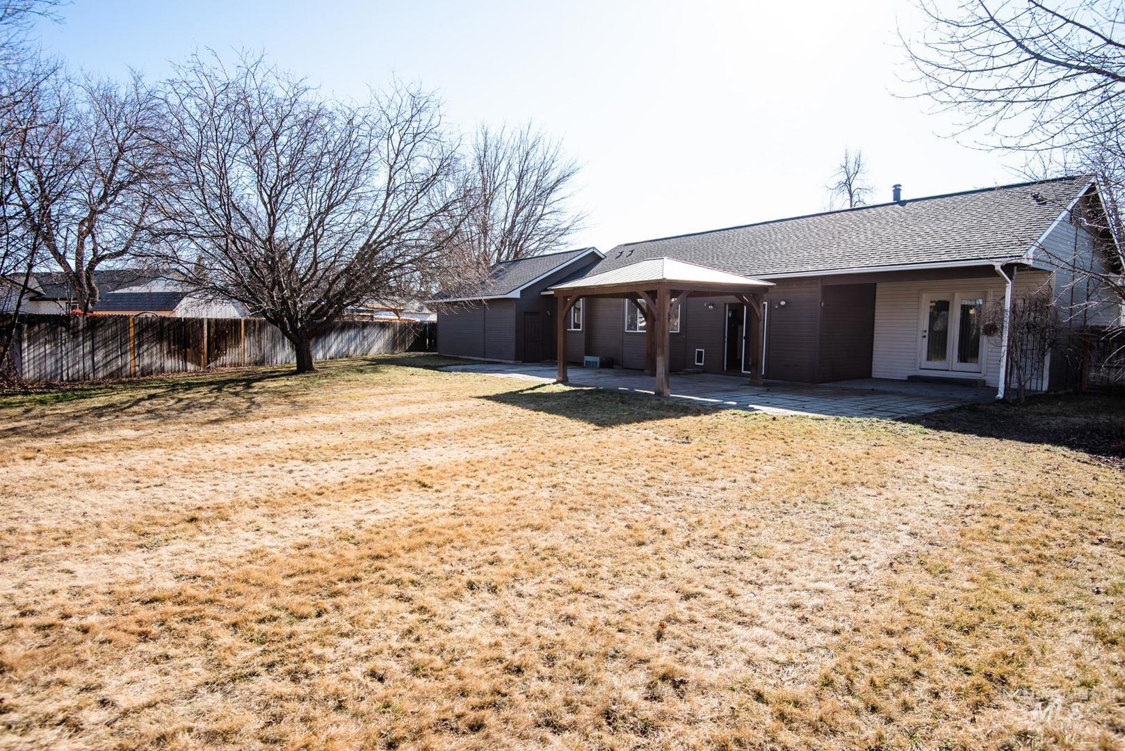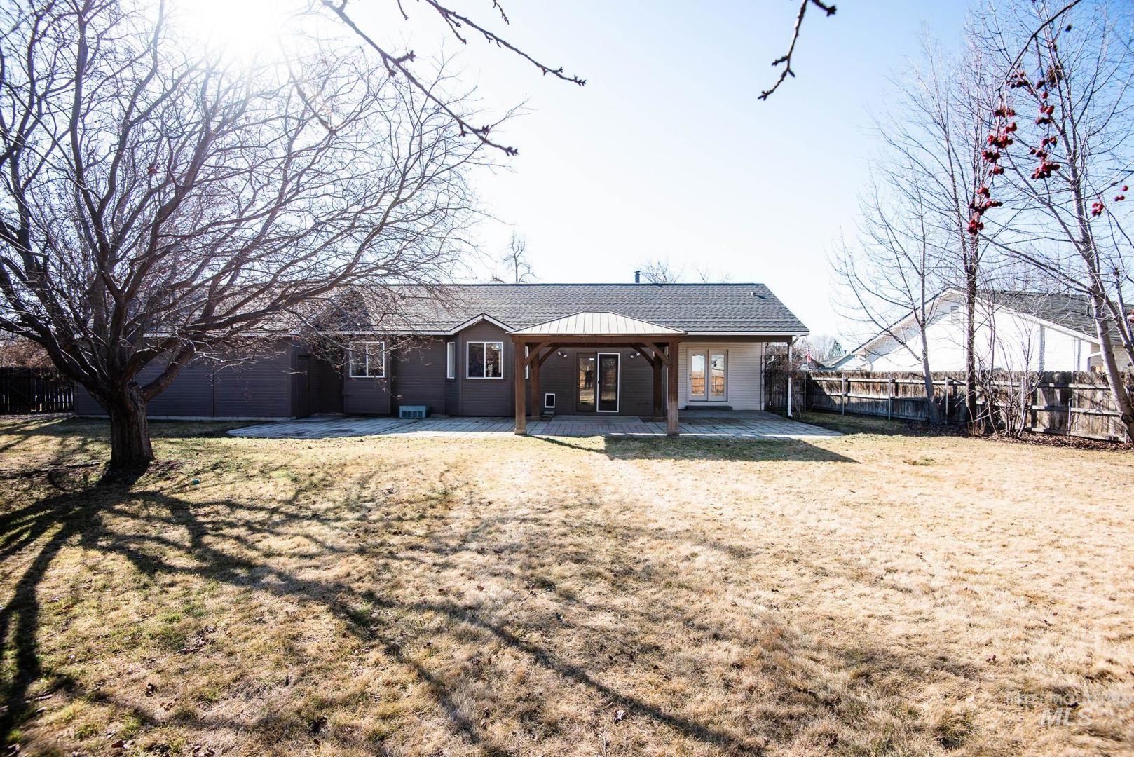 Beautifully remodeled single level home on a great lot in the heart of Meridian. You are minutes away from every amenity you could need and zoned for the best schools in West Ada! Tons of natural light. Cozy gas fireplace in the living room. New laminate flooring and carpet throughout. All new paint throughout the interior. Split bedroom floorplan. Primary suite with large walk-in closet. The exterior lot is where the property shines. Huge backyard with covered gazebo and patio. Fully fenced with possible RV parking should new owners want to trim a tree. Roof & exterior paint are all new within the past couple years. Wonderful opportunity to have an updated home close in and worry free!