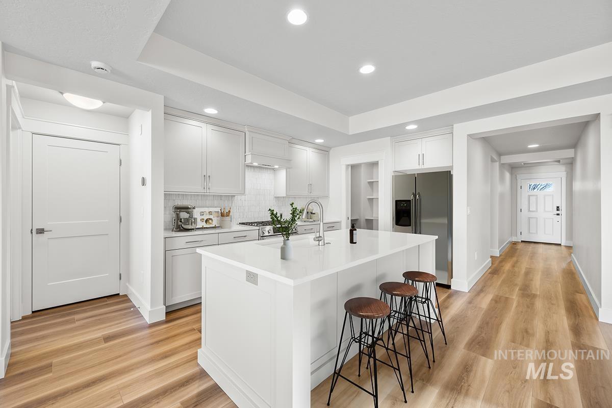 The HAVASU- SHOP MODEL| Blackrock Homes. Located on corner next to walking path & limited rear neighbors. Enjoy COMMUNITY POOL, pickle ball courts, walking paths, community dog parks & playground. Located in the gated neighborhood: The District at Skybreak Estates w/private pickle ball court, dog park & private streets. Featuring elevated finishes; upgraded cabinets, Bosch appliances, upgraded lighting plumbing & flooring. Baths feature tile floors, tile showers & under mount sinks. Generous sized great room, kitchen & dining room perfect for entertaining. Private guest suite & 3rd bdrm or office space gives you everything you need and nothing you don`t. Oversized garage w/additional 16` x5` shop space in garage- perfect for storage, work bench, home gym, etc. INCLUDES FULL VINYL FENCING & FRONT & REAR YARD SPRINKLERS & LANDSCAPING. Just Blocks away from Discovery park. Easy access to YMCA, the interstate, Meridian, shopping, dining, & entertainment.