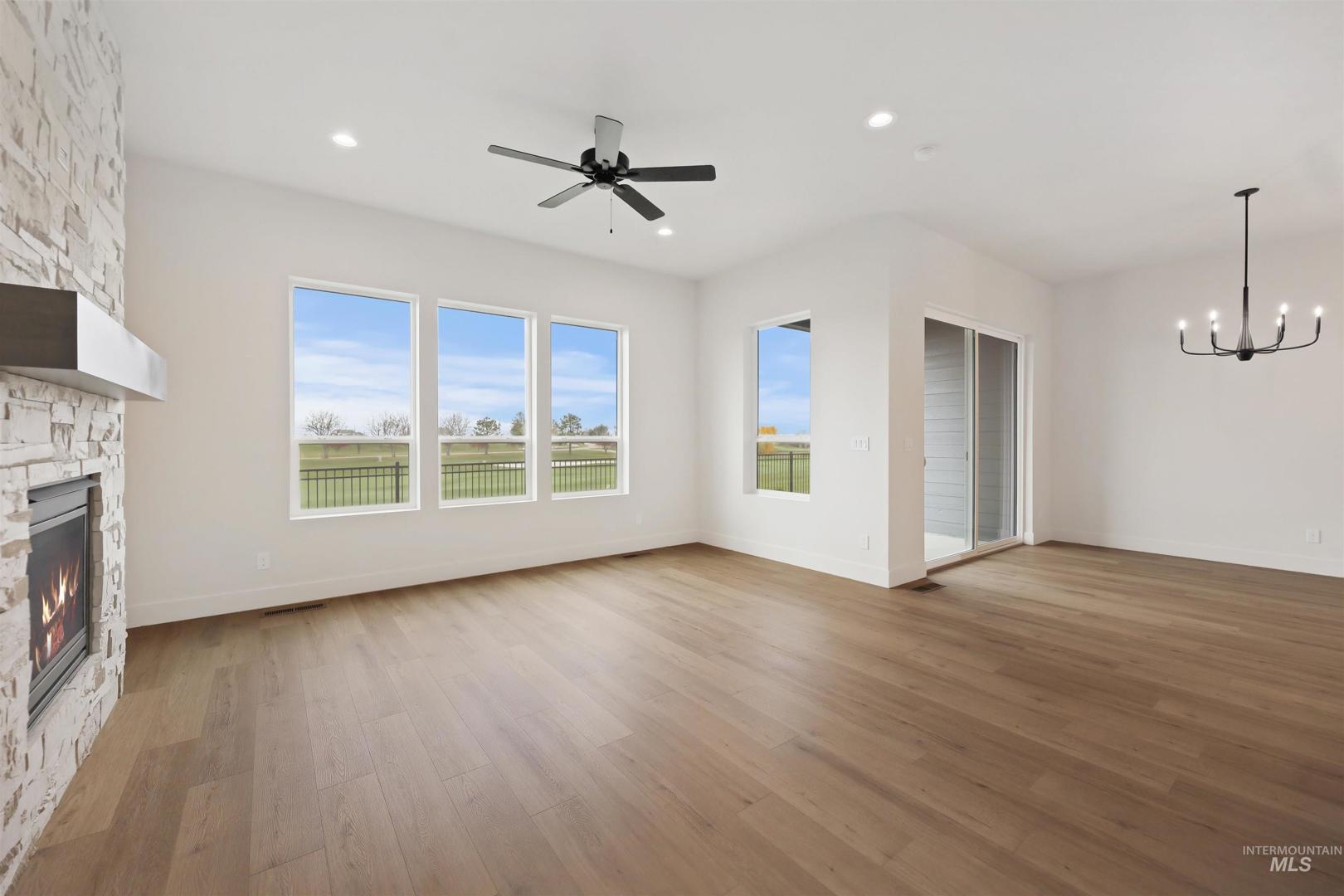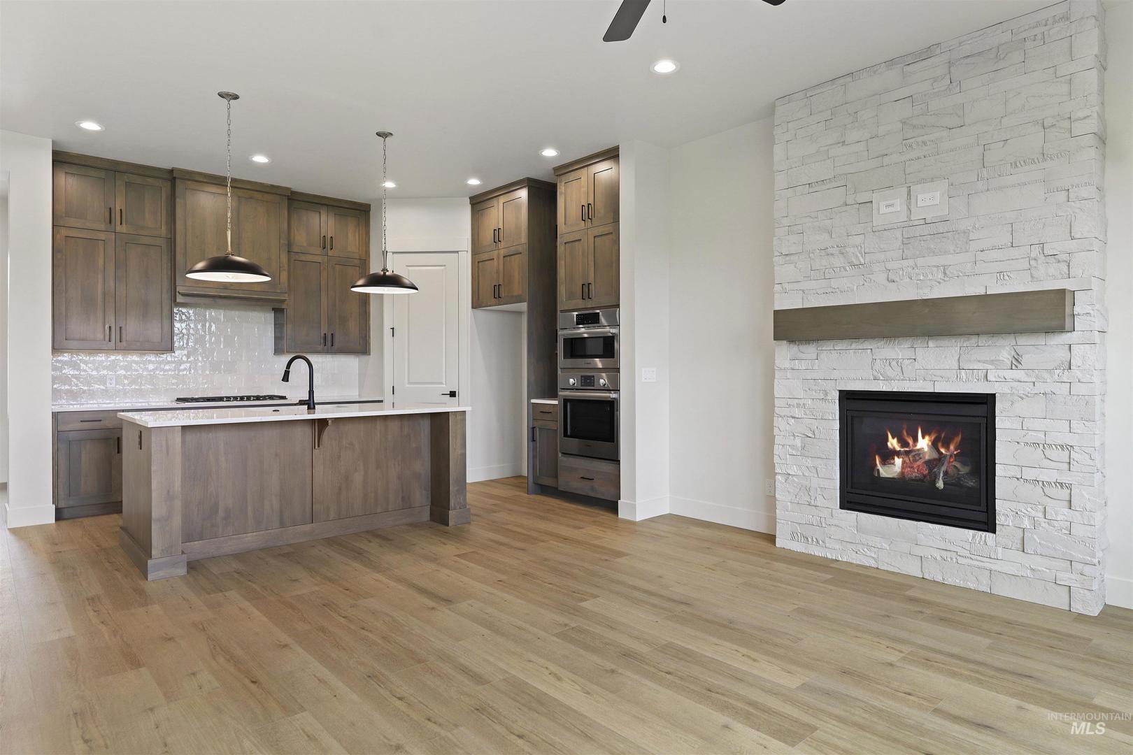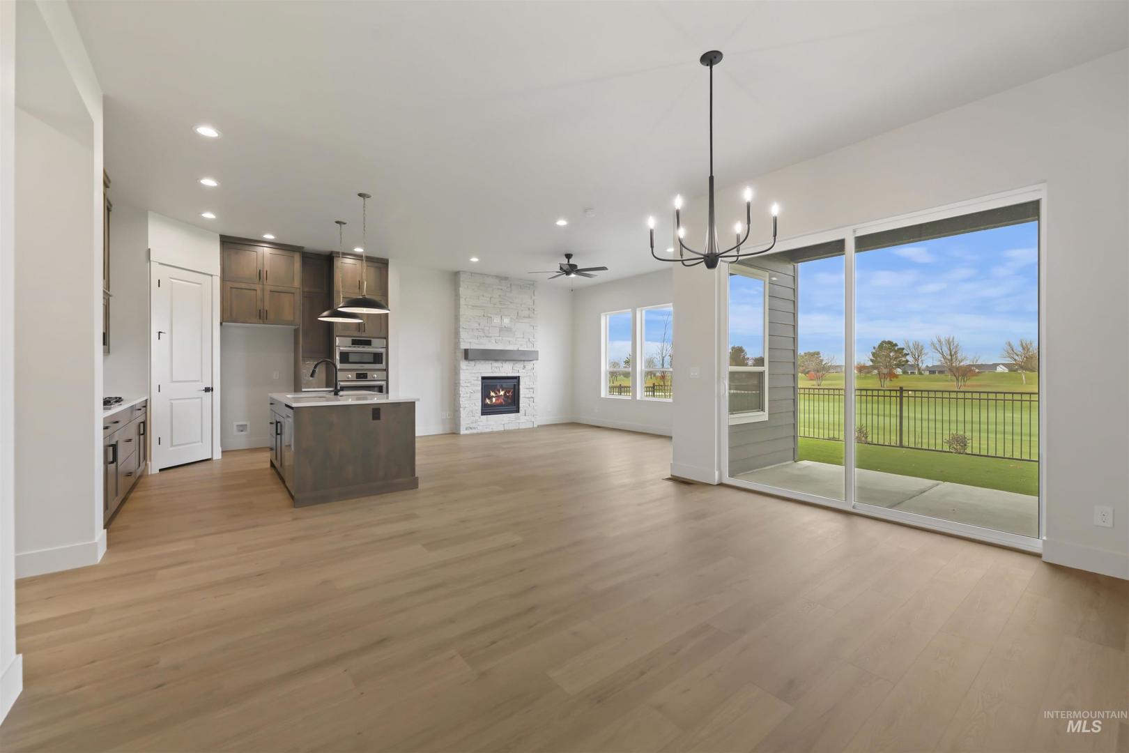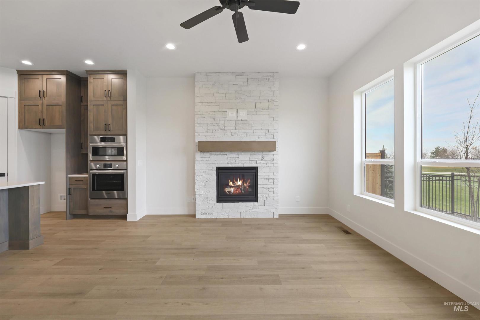 Welcome to The Alder at Valor, where modern design meets the ultimate golfer’s paradise. This elegant single-level home overlooks the pristine fairways of the Falcon Crest Golf Course, offering stunning views. With 3 spacious bedrooms, a dedicated office, and 2 designer bathrooms, every detail has been crafted for comfort and sophistication. Enjoy an open-concept layout highlighted by hardwood flooring, soaring ceilings, and a dramatic floor-to-ceiling stone fireplace, perfect for relaxing after a round or hosting friends for dinner. The kitchen impresses with gorgeous stained cabinetry to the ceiling, quartz countertops, and premium Bosch appliances, blending beauty and function seamlessly. The spa-inspired primary suite features a standalone soaking tub, dual vanities, and a fully tiled walk-in shower. Outside, unwind in your private, low-maintenance backyard with turf and sweeping golf course views—ideal for morning coffee or watching the sunset over the greens. Located in Valor’s prestigious gated Medallion Greens community, residents enjoy resort-style amenities including pools, fitness centers, indoor golf simulators, pickleball, tennis, a clubhouse restaurant, and an 18-hole putting course. The Alder at Valor—where every day feels like a day on the course.