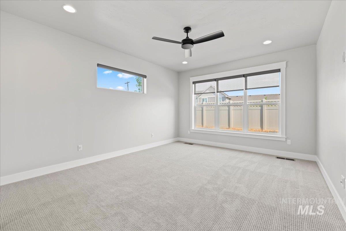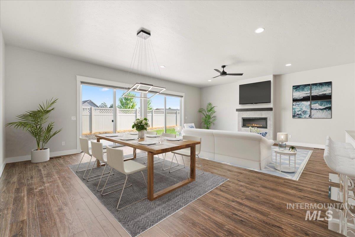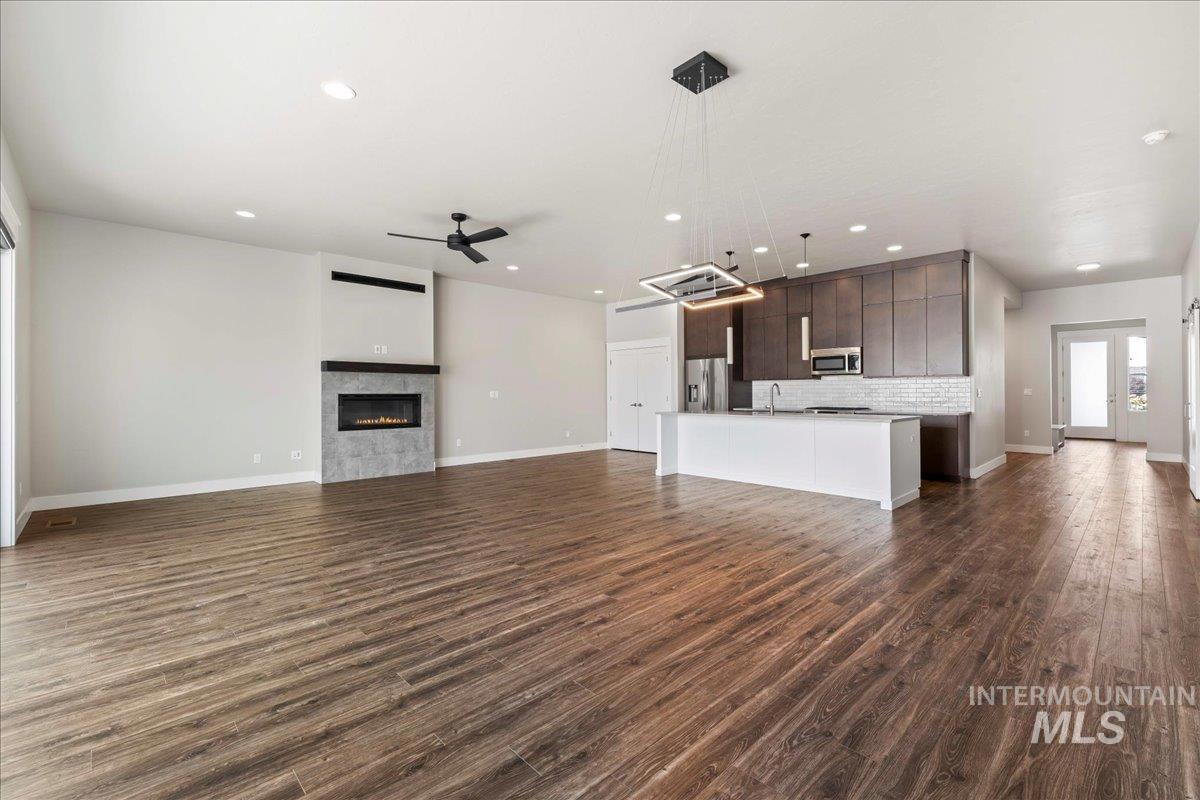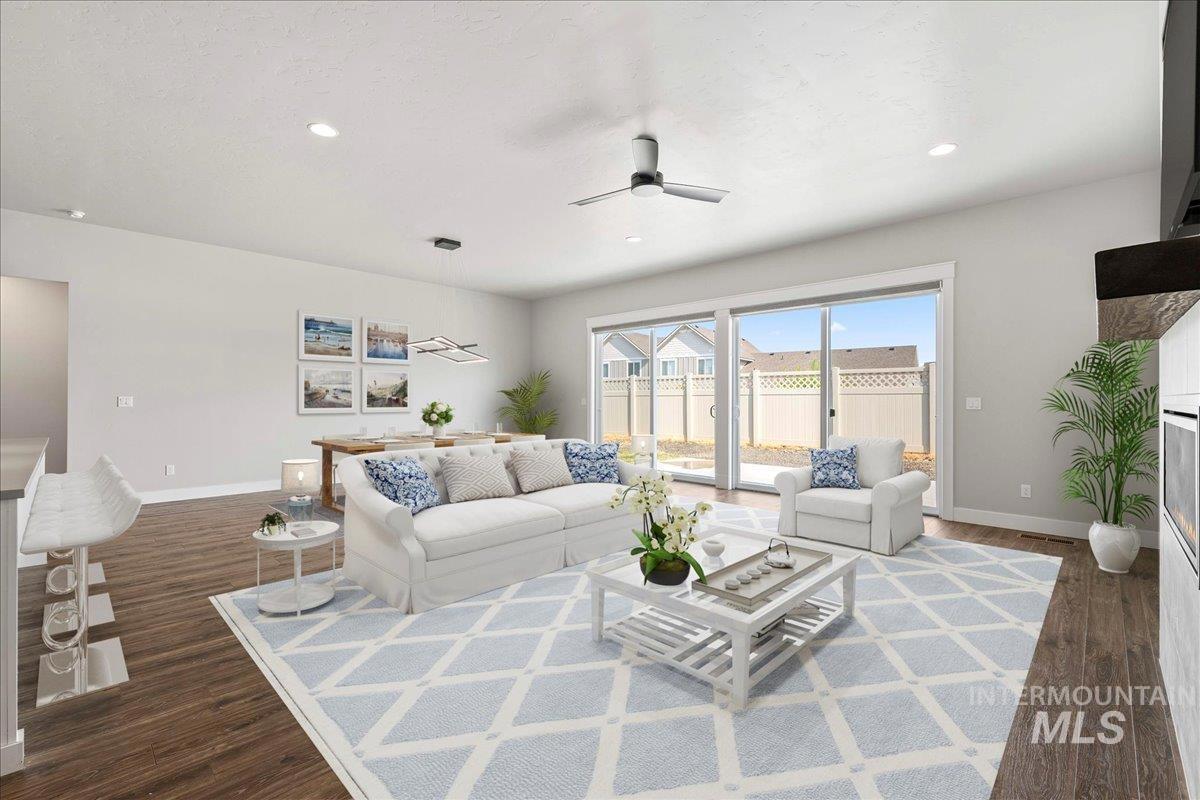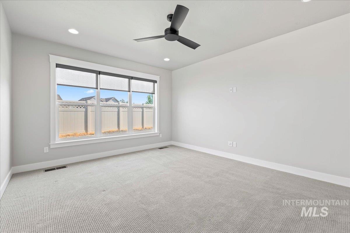 Must see this beautiful single level, open floor plan home. The Harding Homes Butterfly RV Bay plan is a very well thought out design to maximize the ease of living. Located on the Estate side of the sought-after Cazador neighborhood, offering larger lots for a more spacious feel. The home is close to the neighborhood pool and close proximity to schools, parks and popular Indian Creek for summertime floating, swimming or fishing. Kuna offers the charm of small-town living with summertime festivals, parades and the scenic greenbelt. This 3 bed, 2 bath, + office, 2137 sq ft home is looking for new owners. Have toys? Bring them home with you to a massive 49` RV bay, with power, and 3 car tandem garage. The kitchen is designed for entertaining with a large island, huge dining area, and spacious living room that all open up to 2 massive sliding glass doors. Built in office area offers ample room for home office. Enjoy evenings on the back patio with no backyard neighbors right up against your house.
