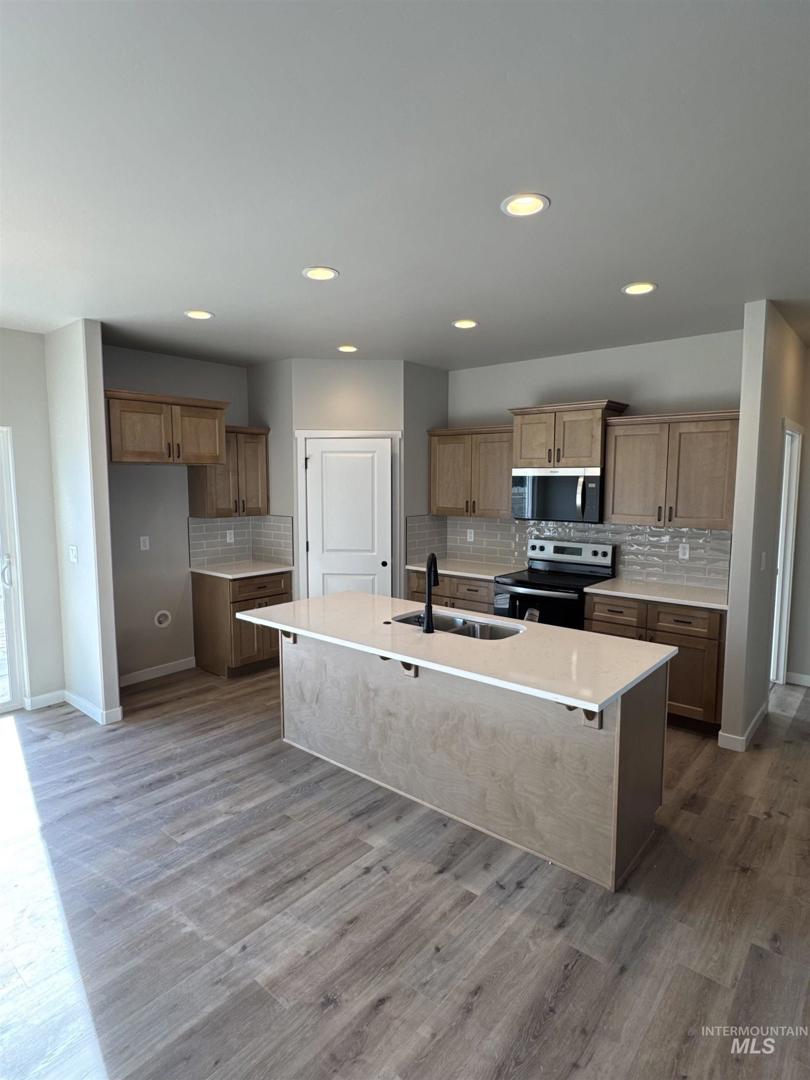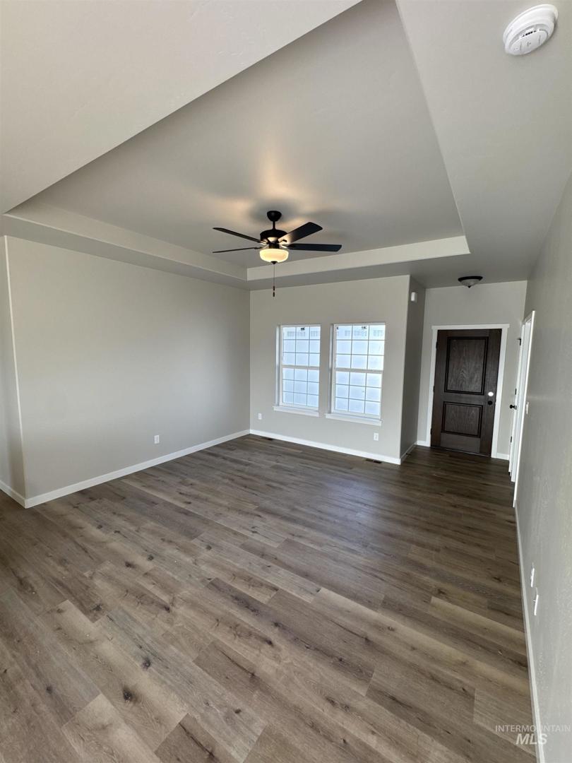 Located at 939 Quartz Street in Kimberly, Idaho, this 4 bedroom, 2 bathroom home offers approximately 1,454 square feet of living space with a 2-car garage. The open-concept layout connects the living area, dining space, and kitchen, which features a center island with sink, stainless steel appliances, solid surface countertops, and tile backsplash. The primary suite includes an en-suite bath with dual vanities. Additional features include a tray ceiling in the living room, ceiling fans, recessed lighting, vinyl plank flooring in main areas, carpeted bedrooms, and a covered entry. The home offers modern finishes and functional design throughout. Buyer to verify all information.