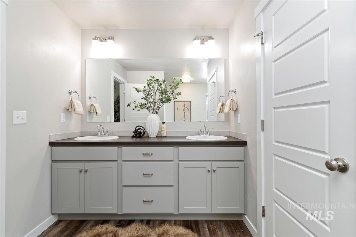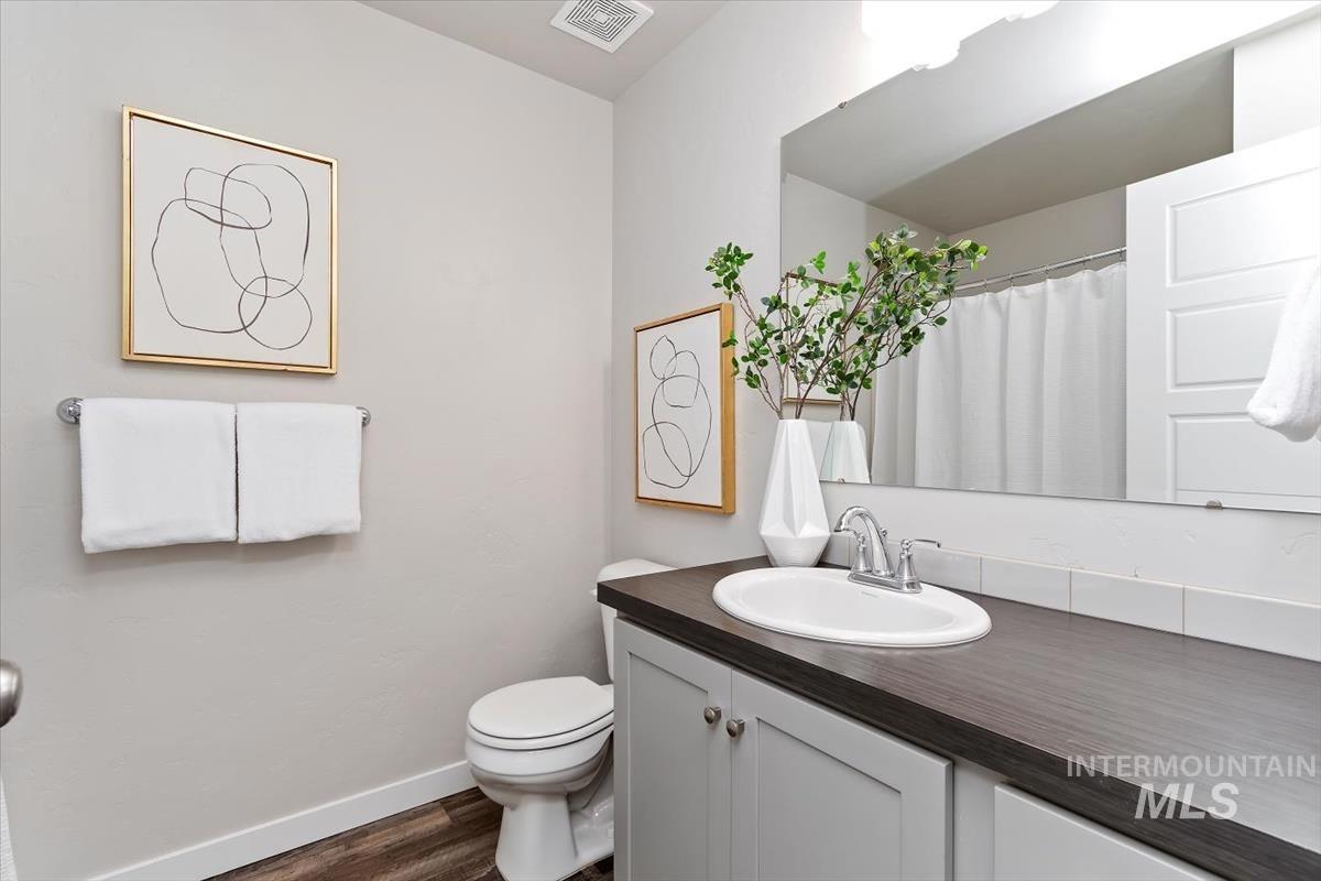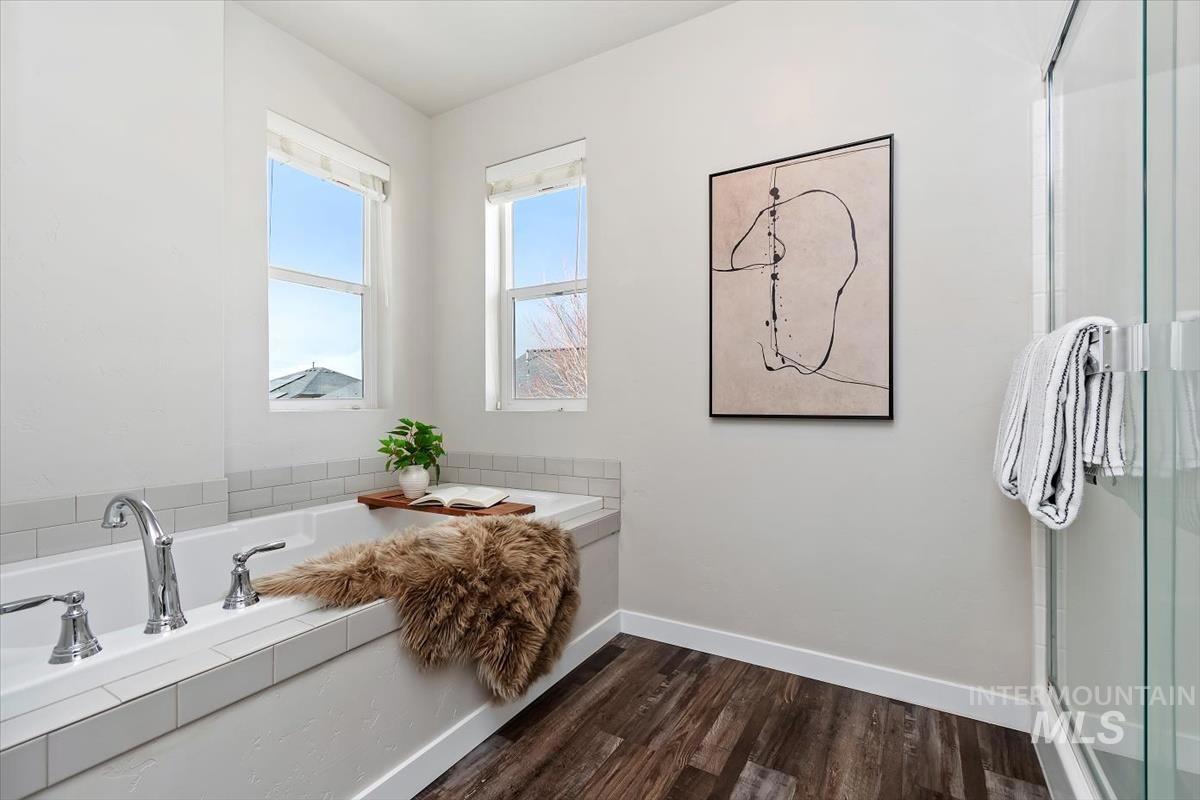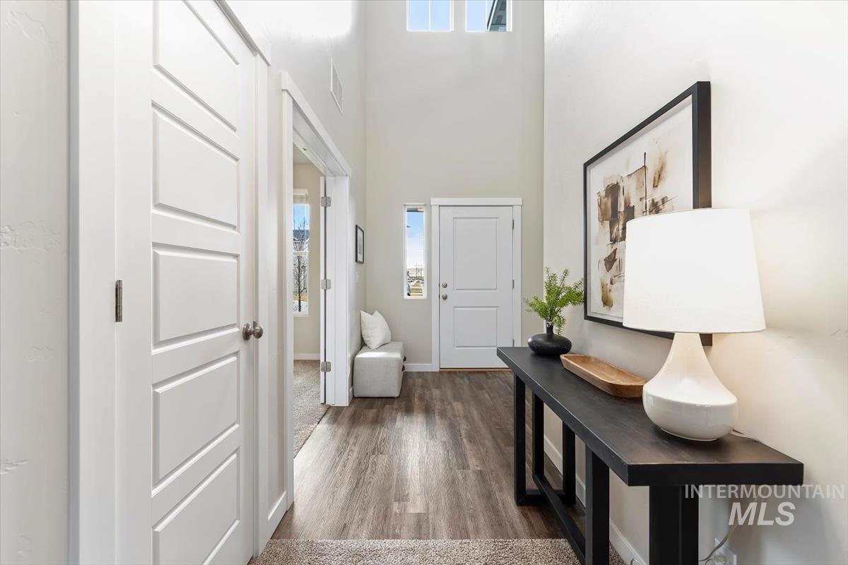 Nestled in desirable SE Boise at the crossroads of outdoor adventure and top-rated dining and entertainment, this move-in-ready home offers function and convenience with valuable upgrades including window coverings, built-ins added to each closet and epoxy flooring in the garage. A gracious two-story entry welcomes you inside, leading to an ideally located main-level office tucked behind double doors—perfect for working from home. Neutral tones flow throughout, creating an elegant yet comfortable ambiance. The light-filled family room opens seamlessly to the well-appointed kitchen featuring quartz countertops, breakfast bar seating, gas range, and a walk-in pantry. Upstairs, unwind in the spacious master with an ensuite bath showcasing dual sinks, a relaxing tub, and a generous walk-in closet. Two additional bedrooms, a large bonus room, and a full bath complete the versatile second-story layout, offering space for play, guests, or movie nights. Foothill views are the perfect backdrop for summer BBQs and seasonal entertaining from the covered patio surrounded by lush, green grass in the fully fenced backyard.