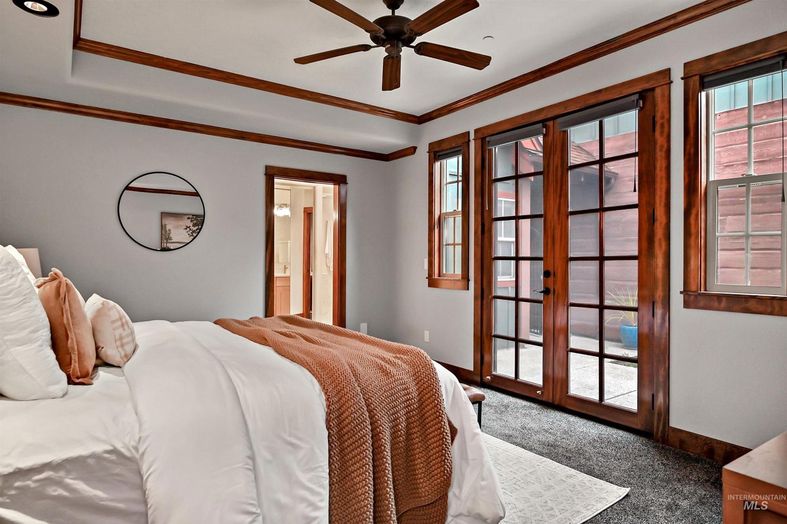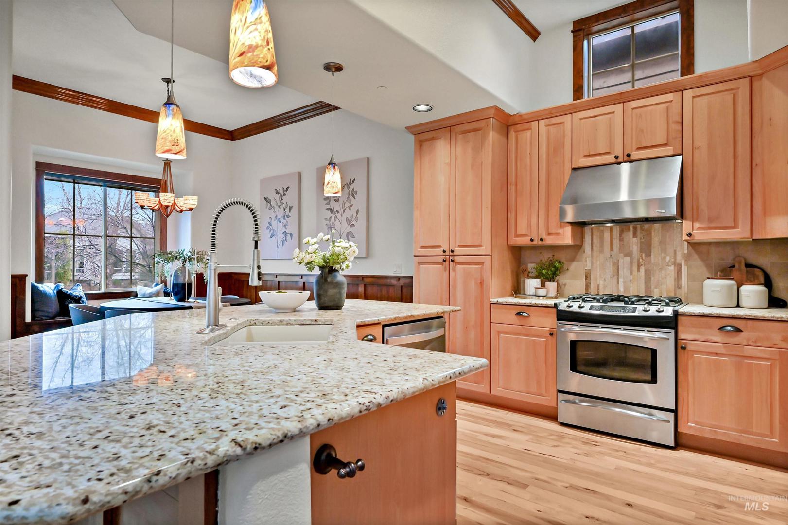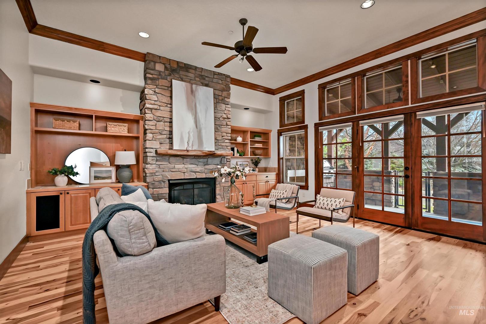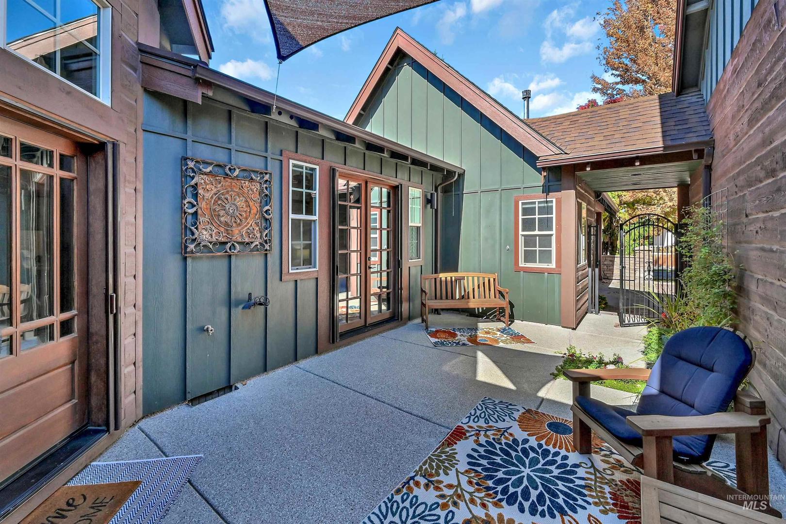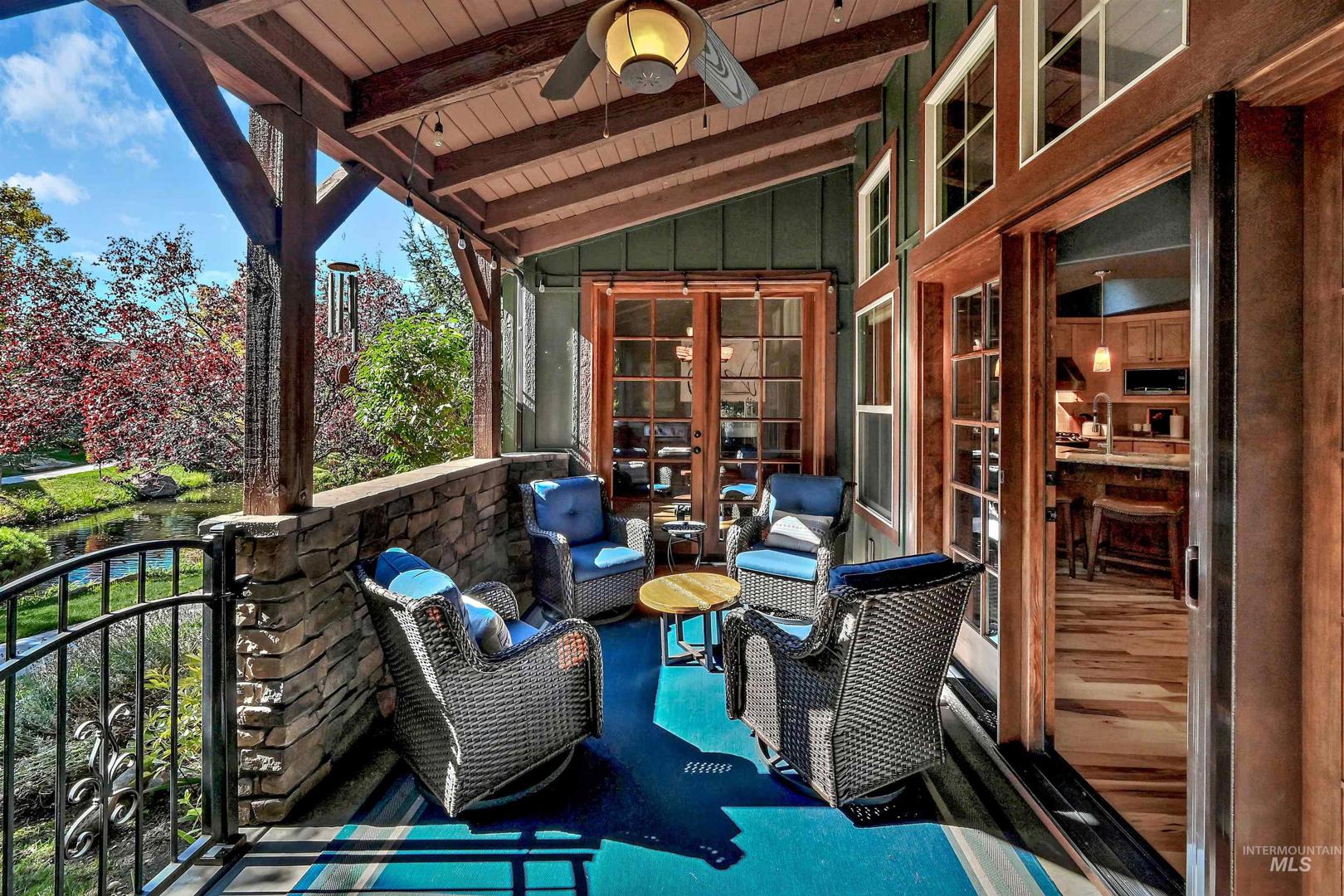 A stunning townhome built by Roth Homes perfectly situated near the Boise River and lush greenbelt, creating a serene, private retreat that feels worlds away yet just moments from city conveniences. This nature-inspired, rustic-modern haven boasts mature landscaping and tranquil pond views that evoke a true outdoor oasis. Inside, refined elegance fills every room with rich wood accents, stone details, and beautiful newly-refinished hardwood floors. Entertain on the covered terrace featuring a cozy built-in fireplace and BBQ grill or unwind in the private front courtyard. A gourmet kitchen features a large center island with slab granite and custom cabinets while the office and primary suite feature French doors opening to the peaceful courtyard. The recently renovated primary bath is a spa-like escape with crisp quartz countertops, new tile flooring and shower. This exceptional home blends breathtaking natural beauty with everyday convenience blending a perfect escape and sophisticated living.
