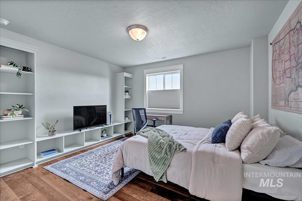 Beautifully upgraded and thoughtfully designed, this home blends comfort, craftsmanship, and modern refinement. A covered front patio and low-maintenance landscaping create welcoming curb appeal. Inside, engineered hardwood floors extend throughout all living areas and bedrooms, complemented by plantation shutters, detailed trim moldings, and a beautiful floor-to-ceiling brick gas fireplace.The kitchen is both elegant and functional, featuring quartz countertops, tile backsplash, custom full-height cabinetry, under and upper cabinet lighting, and a large island with storage and seating. Sleek stainless steel appliances include a NEW gas stove, oven and dishwasher, plus a statement vent hood and farmhouse sink. A spacious walk-in baker’s pantry adds exceptional storage. The expansive primary suite offers tray ceilings, dual vanities, a soaker tub, fully tiled walk-in shower, and an oversized custom walk-in closet. Flexible living spaces include a main-level fourth bedroom or office, bonus loft, mudroom with built-ins, and convenient laundry room with cabinetry & counter-space. Additional highlights include a central vacuum system, water softener, and extra-deep garage bay (3 car). Enjoy a covered rear patio, fully fenced yard with garden space, and no rear neighbors—all just minutes from the Boise Foothills, the Boise River, Greenbelt, Lucky Peak, shopping, dining, and recreation.
