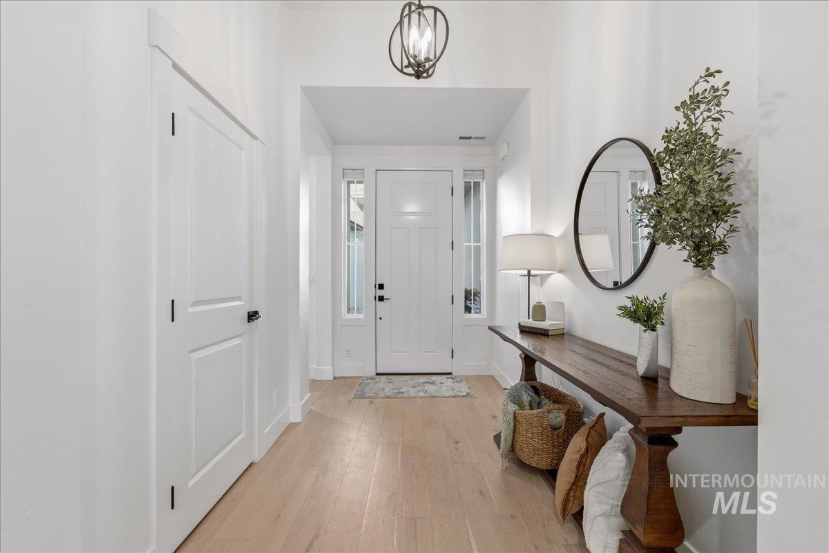 This beautifully cared-for, hard to find single-level home offers a 41’ deep RV garage with 14’ tall overhead door and epoxy coated floors with 4 bedrooms, including a multi-gen suite. Featuring a private courtyard entry, large covered rear patio and great separation of spaces. The primary suite is tucked away for privacy, while a guest bedroom has its own en-suite bath making it perfect for visitors or multi-gen living. The open kitchen, dining, and living areas are filled with natural light thanks to expansive windows, giving the home a bright, welcoming feel. Engineered hardwood floors, quartz countertops, and tile walk-in shower, along with the quality finishes throughout that make this home feel welcoming and luxurious. The back yard has been designed like a park, with mature trees and plants, perennial flowers that are just beautiful in the spring and summer. Easy to care for and makes outdoor living that much better! Located in the popular Summit Ridge community, this HERS-rated home offers energy efficiency and a great Nampa location close to Lake Lowell, RedHawk Golf Course, and shopping and dining. A pre-listing home inspection has been completed and this home is truly move-in ready!