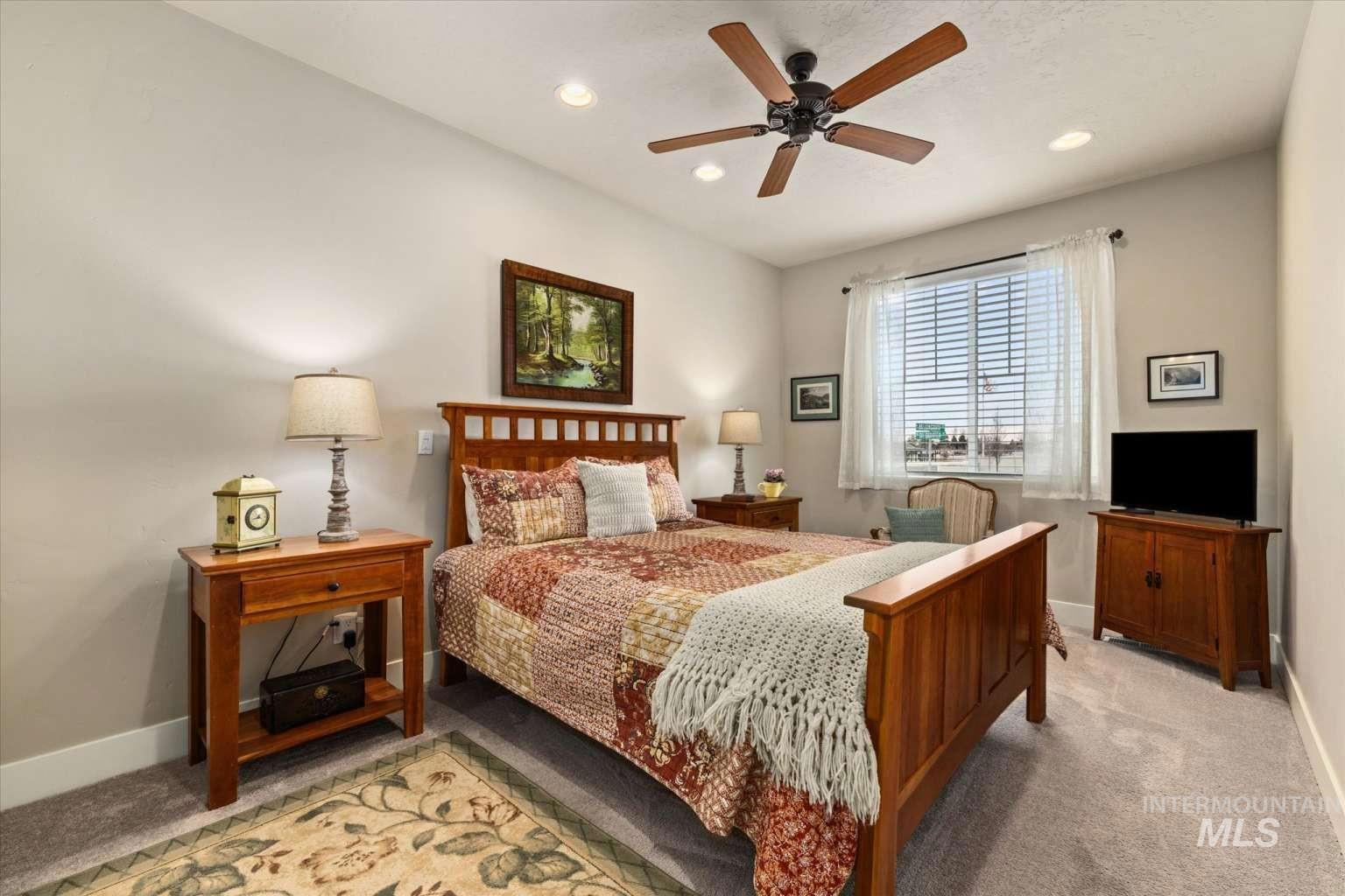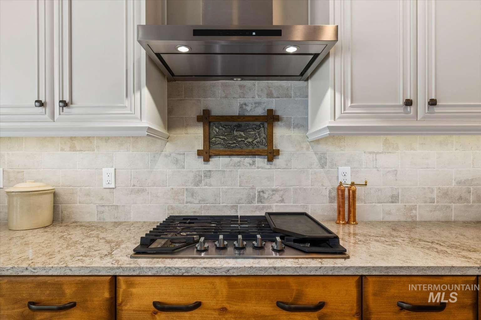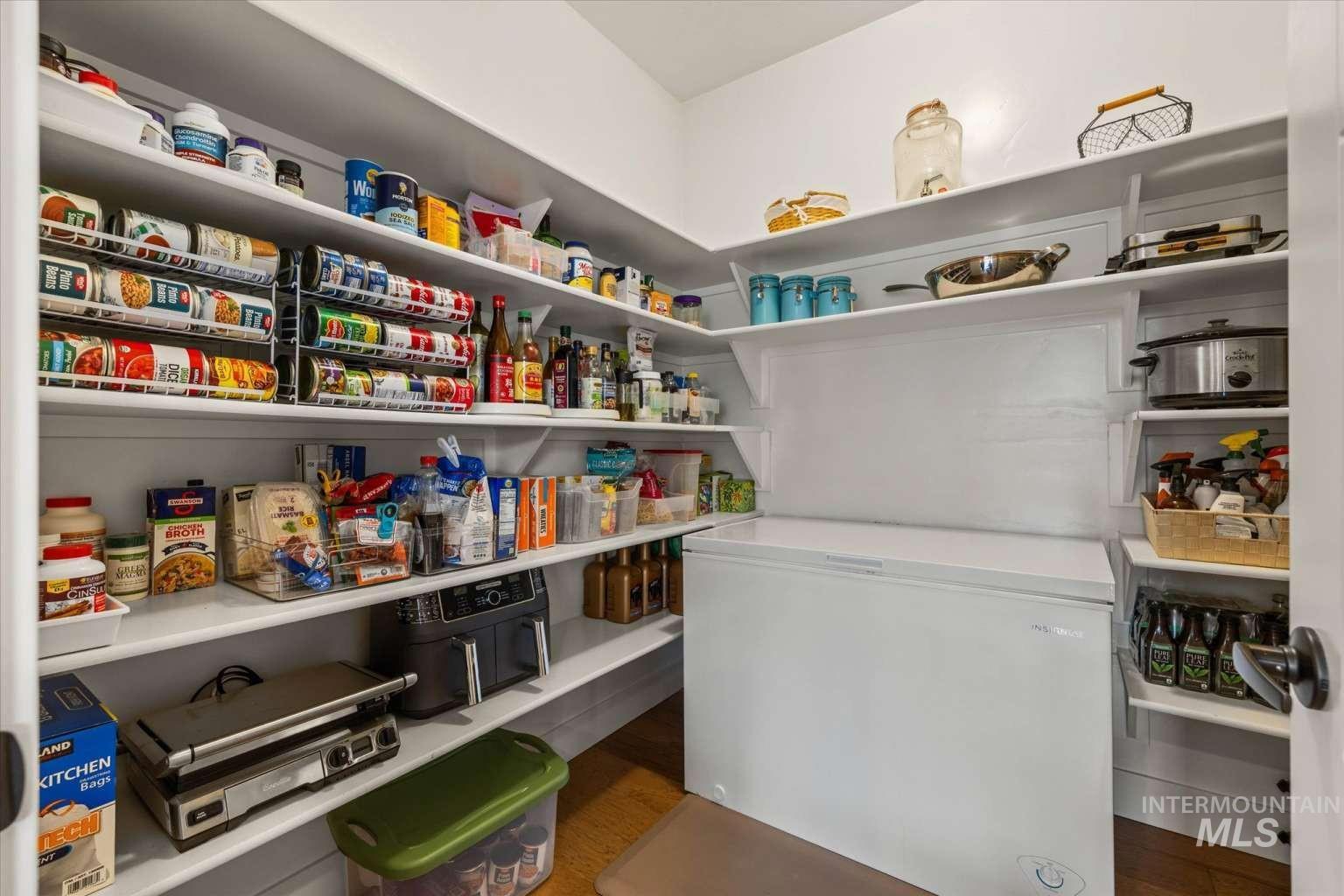 This lovely single-level home, situated on a generous 1/3 acre, offers high-end finishes in a well-designed floor plan. An inviting foyer greets you with hickory wood floors and opens to an expansive great room with natural light. A stone gas fireplace, with a raised hearth and knotty alder mantel, brings warmth and charm to this spacious living area. The kitchen has knotty alder cabinets, a tumbled marble backsplash, a gourmet range, a large island with a front apron farm sink, and an oversized pantry. Gaze through the 3-door slider to a stunning water feature, lush trees and plants, and a custom-built gazebo with power, all connected by a paver patio and walkways. Enjoy privacy and comfort with a split-bedroom layout and dual-zone heat. A convenient flex room off the main living area has multiple options. The primary bedroom views the impressive backyard through a sliding glass door with motorized shades. The primary bath has tiled floors, a walk-in tiled shower, a large tub, and a walk-in closet with a custom-built organizer. The secondary bedroom has a walk-in closet with a built-in custom organizer and is steps away from the main bath, with a walk-in tiled shower. A large 3-car garage with 4 extra feet in depth has custom storage cabinets, wall storage units, and a polyurea floor coating. A large side yard includes RV parking and a 12x14 shed with power.