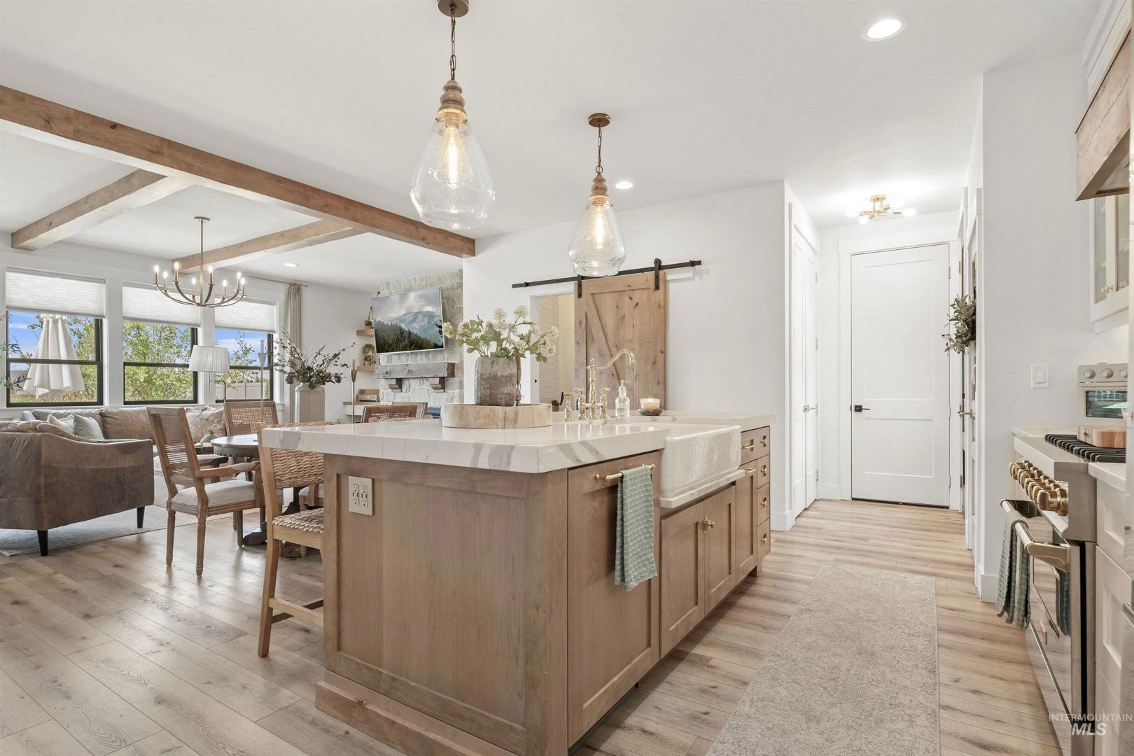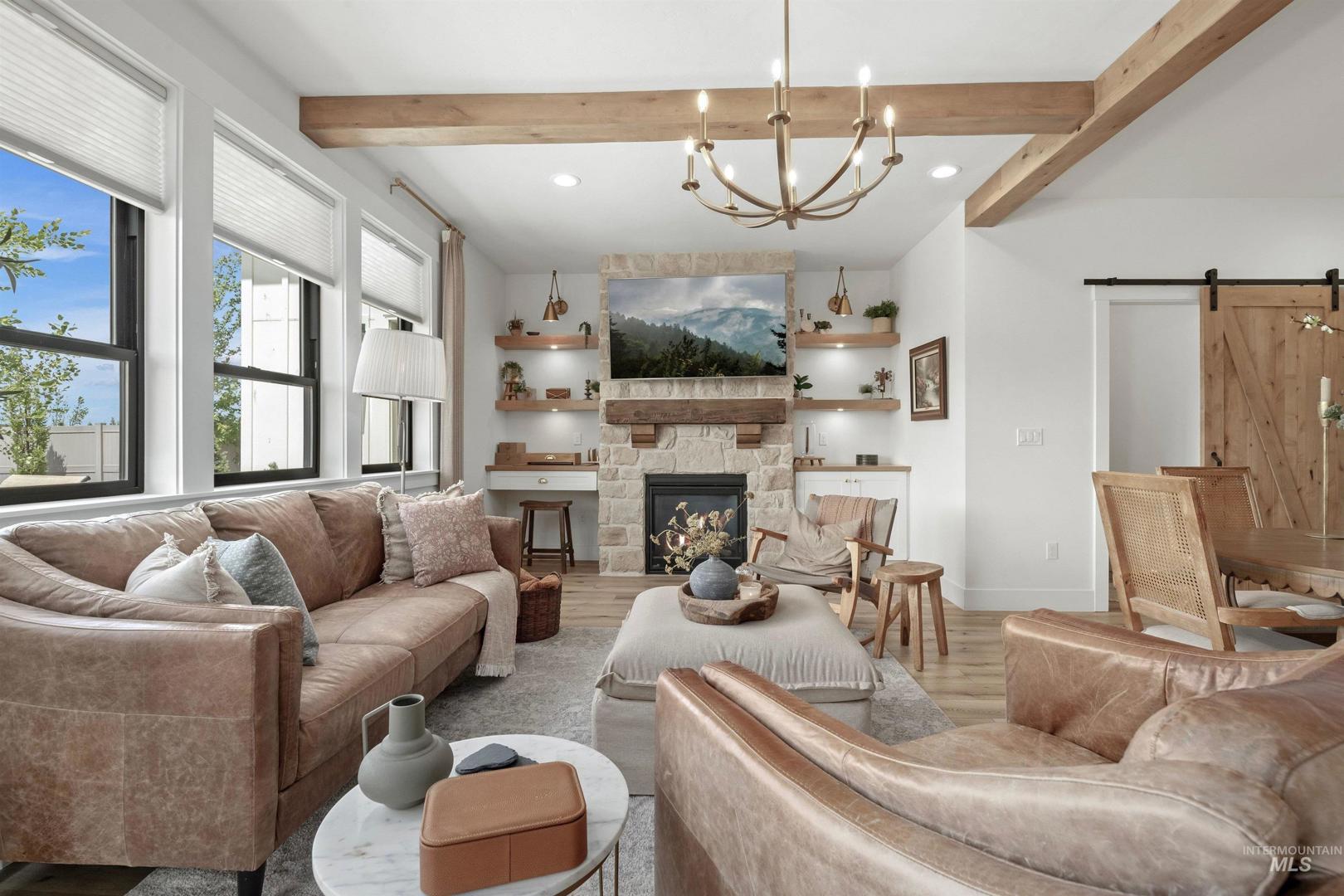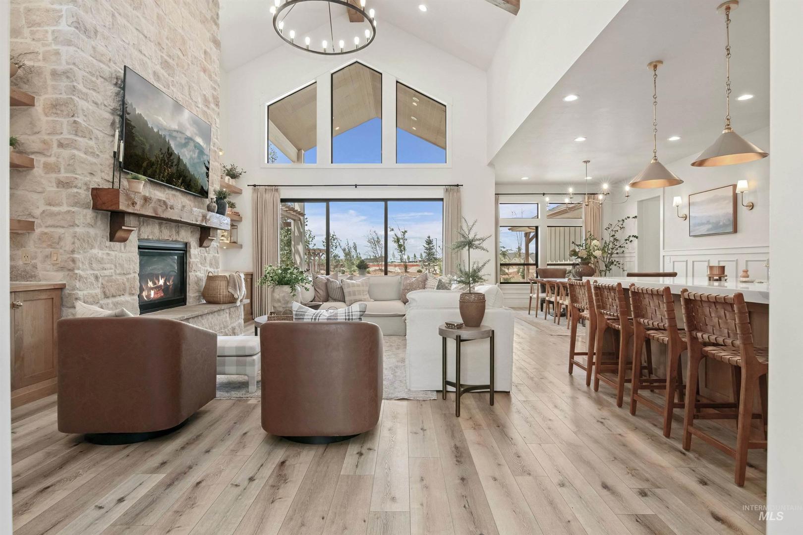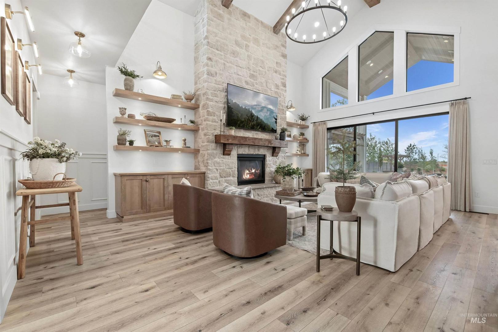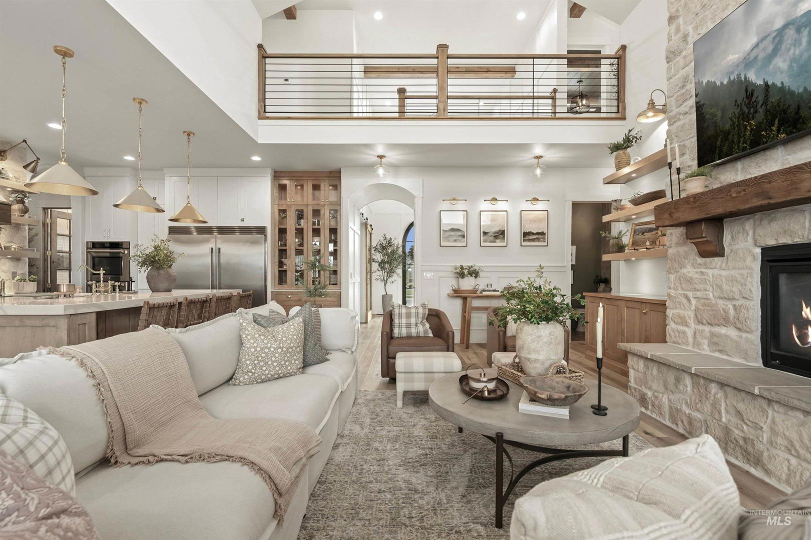 Step into a life where every moment feels elevated. This exceptional Custom Luxury Residence—set within the prestigious enclave of The Keep—blends Modern French Country inspiration with the kind of comfort, warmth, and effortless sophistication that turns a house into a sanctuary. Resting on over half an acre, it includes a private-entry Casita that creates the perfect haven for guests, extended family, or quiet weekend retreats. From the very first step inside, the home sets a tone of refined living. Grand arched glass-and-iron doors, framed by softly glowing gas lanterns, open to cathedral ceilings that invite light and air to flow freely. Throughout this full custom home, curated details tell a story: artisan tilework, custom millwork, brass accents, and reclaimed wood from the historic Simplot Barn infuse each space with authenticity and soul. Designed for those who love to gather, cook, and celebrate, the home features alder cabinetry, mitered-edge quartz countertops, striking limestone fireplaces, and two chef-worthy kitchens—each equipped with 6-burner ZLINE gas ranges, premium appliances, and a butler’s pantry that keeps entertaining effortless. A main-level office, an upstairs bonus room, a flexible additional living space, and a hidden tech nook offer room for creativity, productivity, and play. The 40` RV bay ensures that adventure is always within reach.