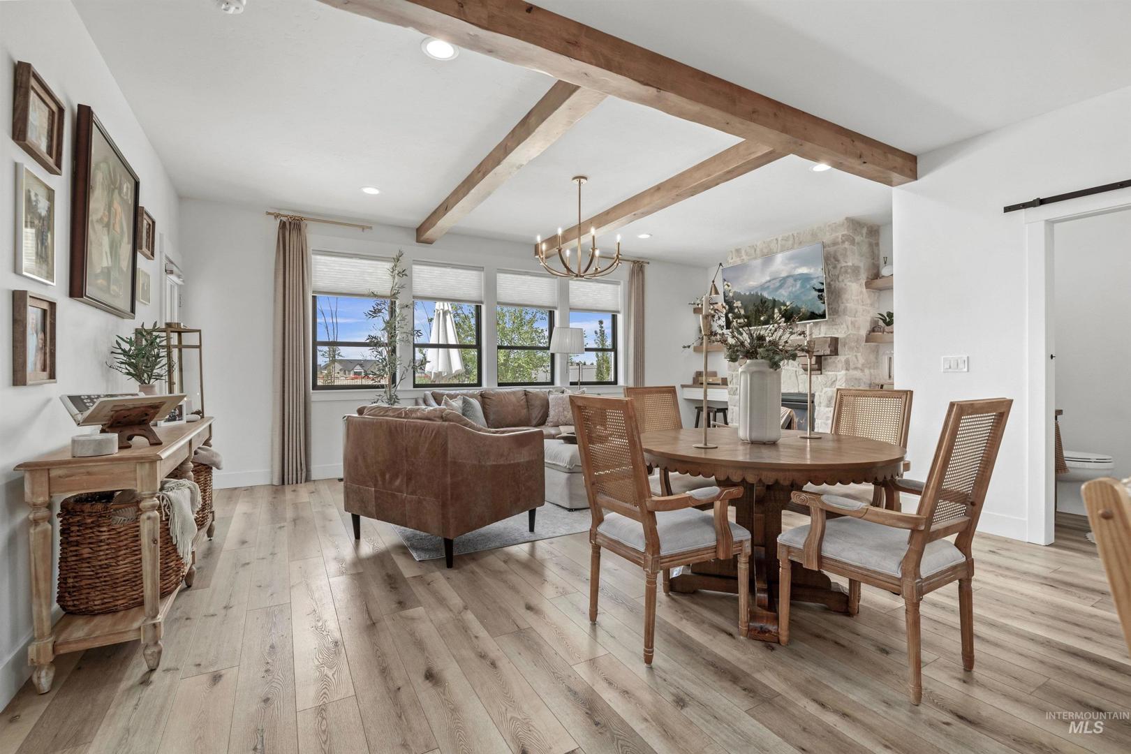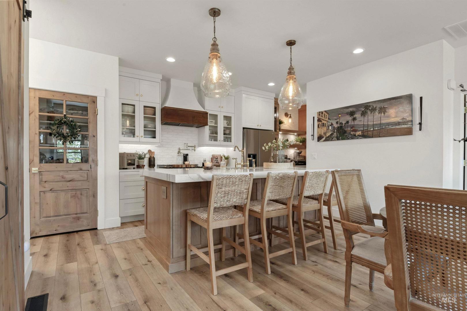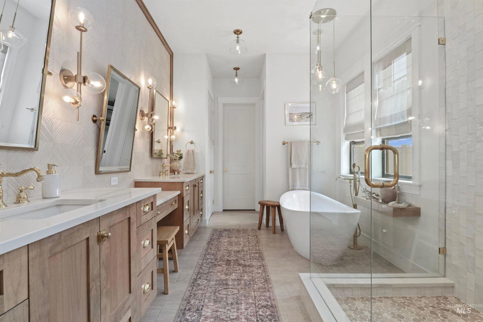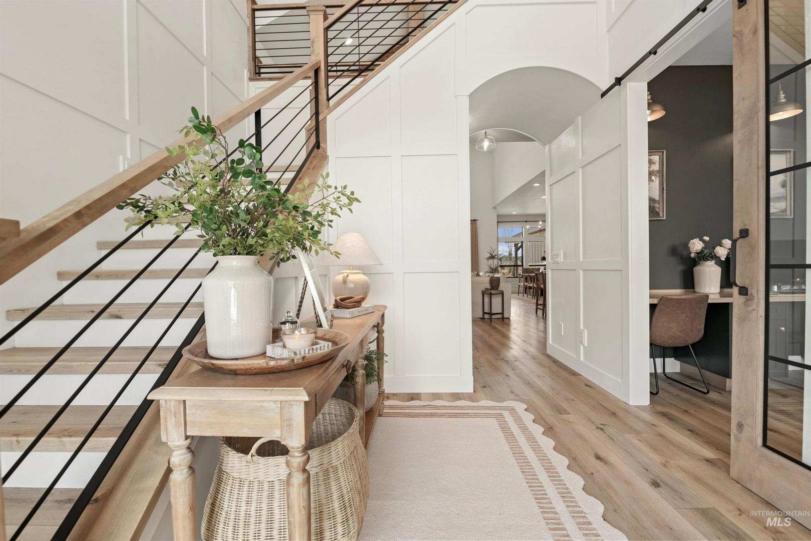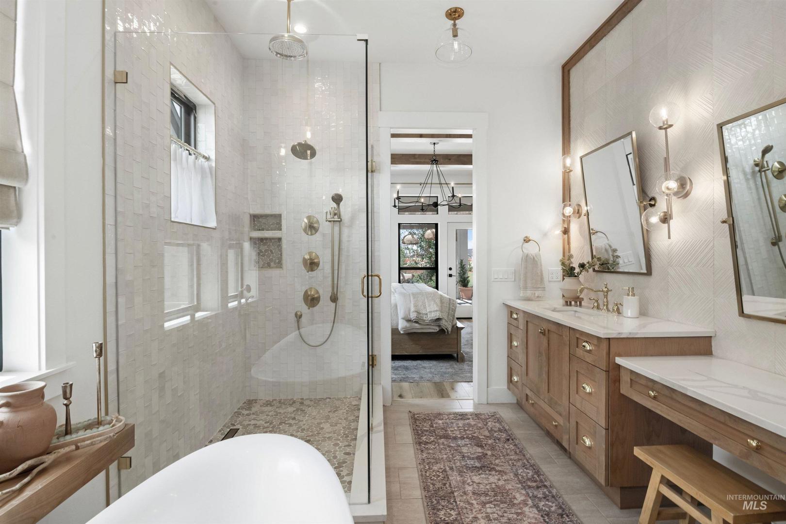 Step into a life where every moment feels elevated. This exceptional Custom Luxury Residence—set within the prestigious enclave of The Keep—blends Modern French Country inspiration with the kind of comfort, warmth, and effortless sophistication that turns a house into a sanctuary. Resting on over half an acre, it includes a private-entry Casita that creates the perfect haven for guests, extended family, or quiet weekend retreats. From the very first step inside, the home sets a tone of refined living. Grand arched glass-and-iron doors, framed by softly glowing gas lanterns, open to cathedral ceilings that invite light and air to flow freely. Throughout this full custom home, curated details tell a story: artisan tilework, custom millwork, brass accents, and reclaimed wood from the historic Simplot Barn infuse each space with authenticity and soul. Designed for those who love to gather, cook, and celebrate, the home features alder cabinetry, mitered-edge quartz countertops, striking limestone fireplaces, and two chef-worthy kitchens—each equipped with 6-burner ZLINE gas ranges, premium appliances, and a butler’s pantry that keeps entertaining effortless. A main-level office, an upstairs bonus room, a flexible additional living space, and a hidden tech nook offer room for creativity, productivity, and play. The 40` RV bay ensures that adventure is always within reach.