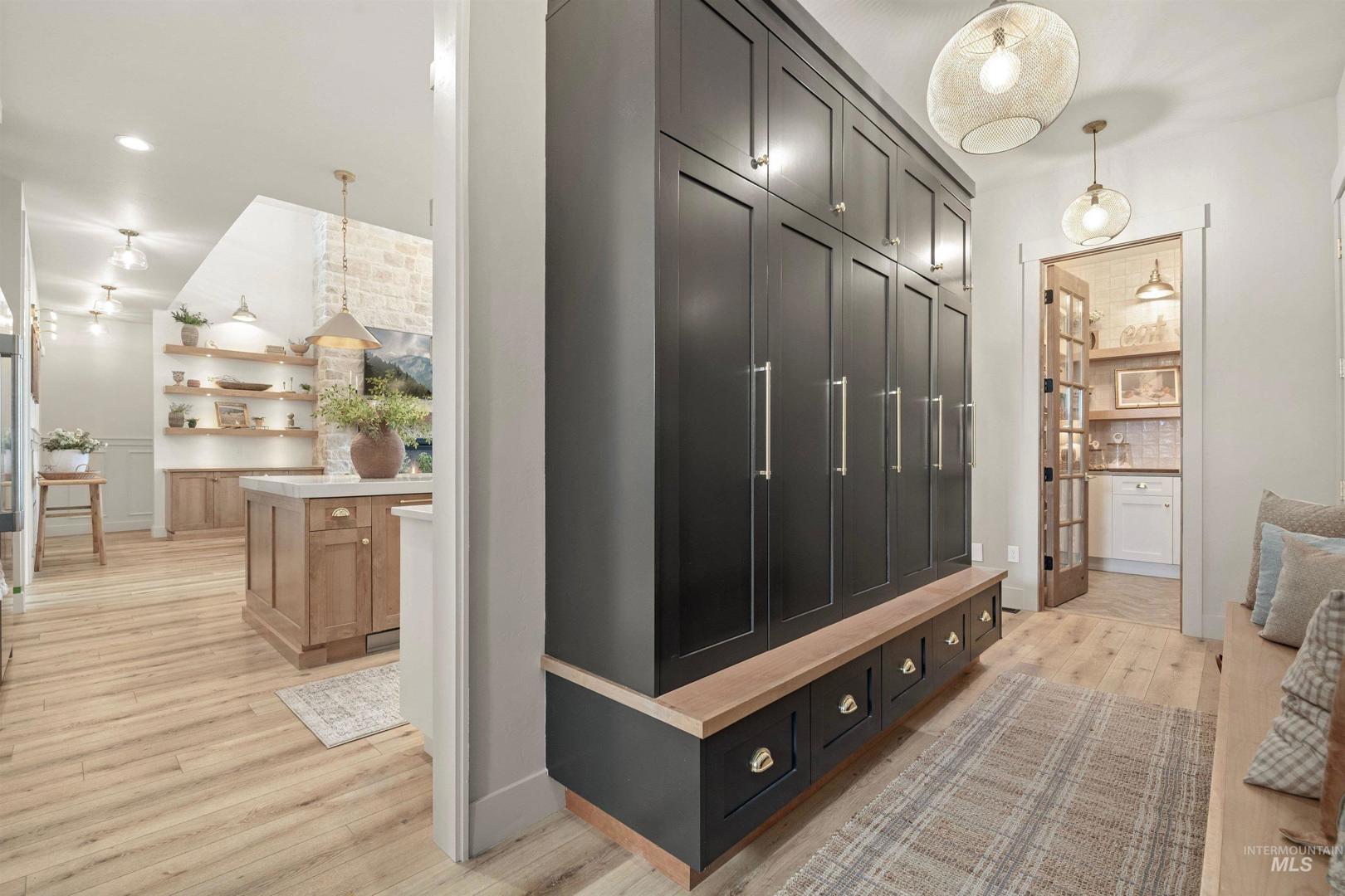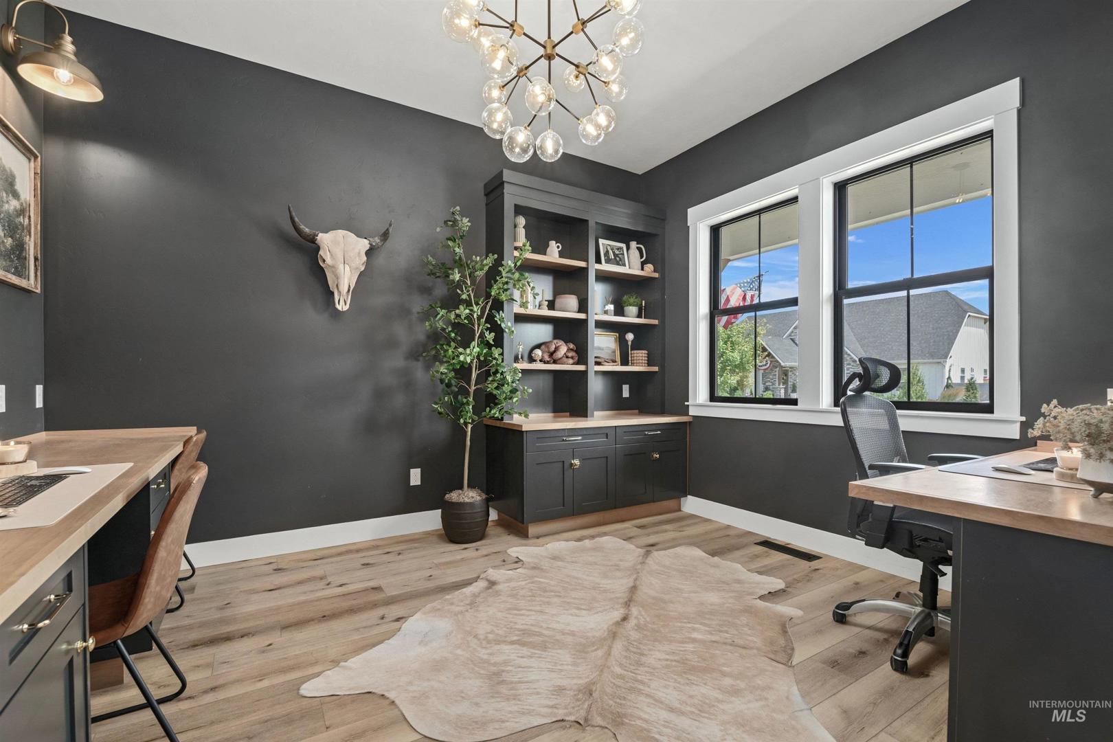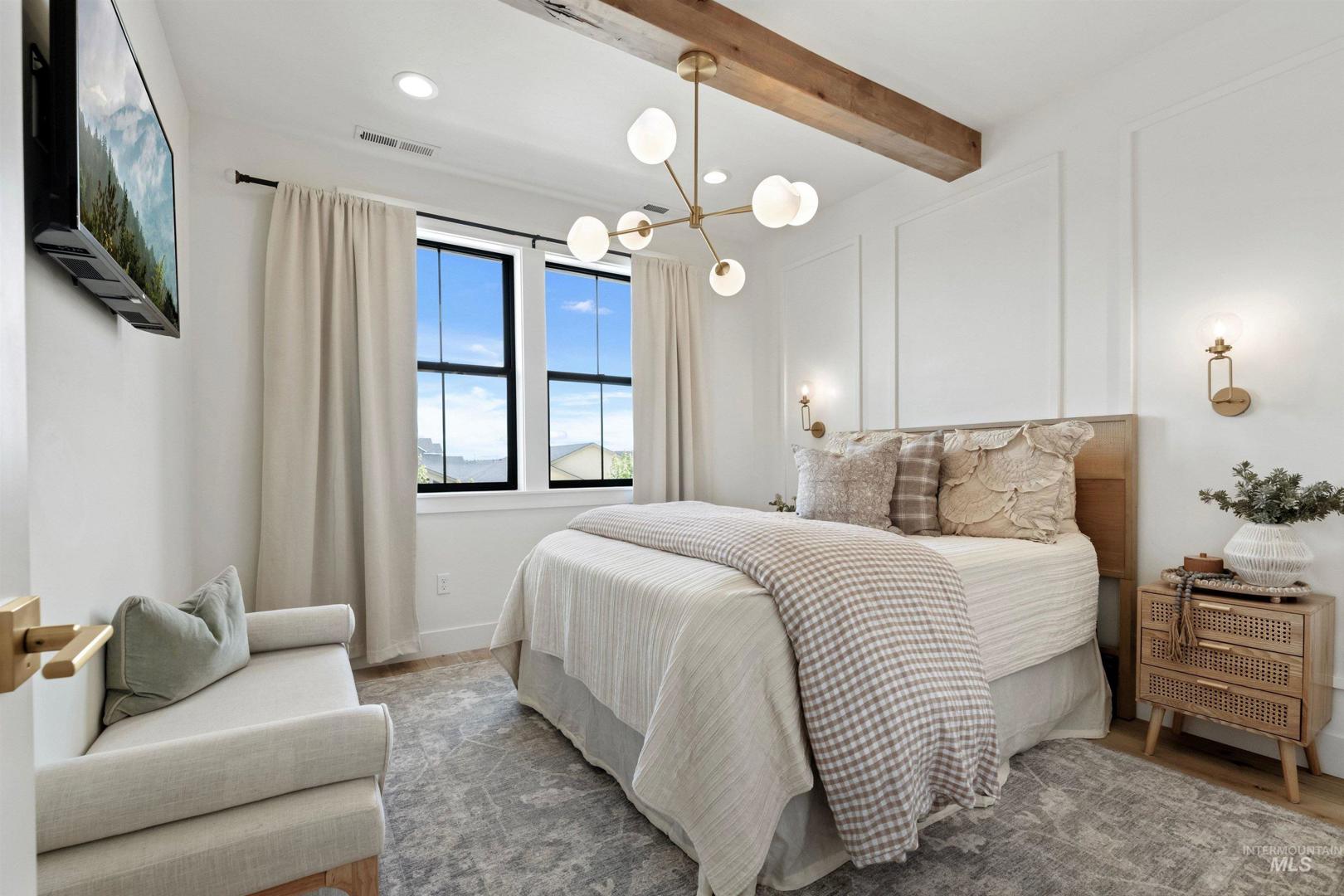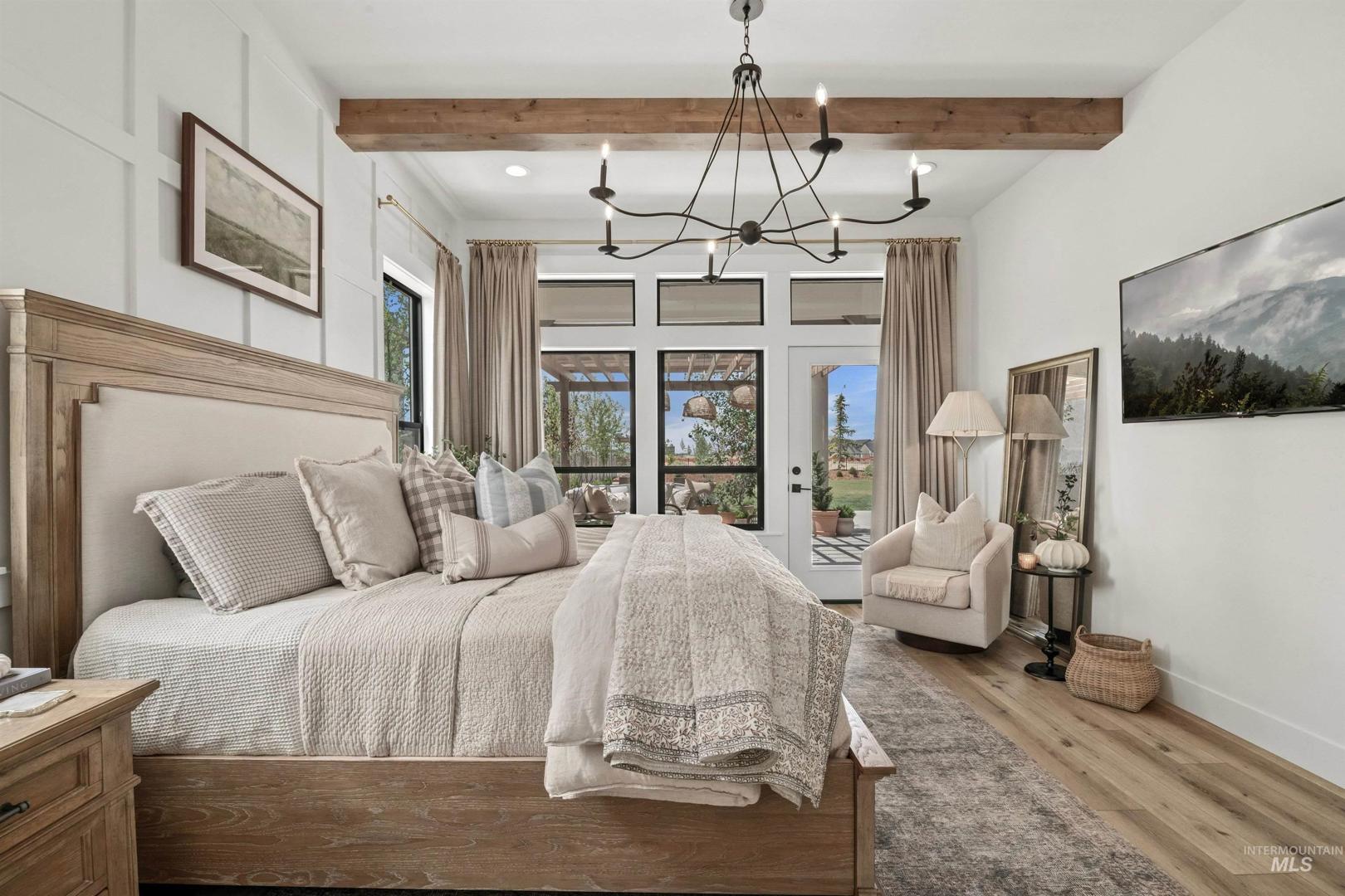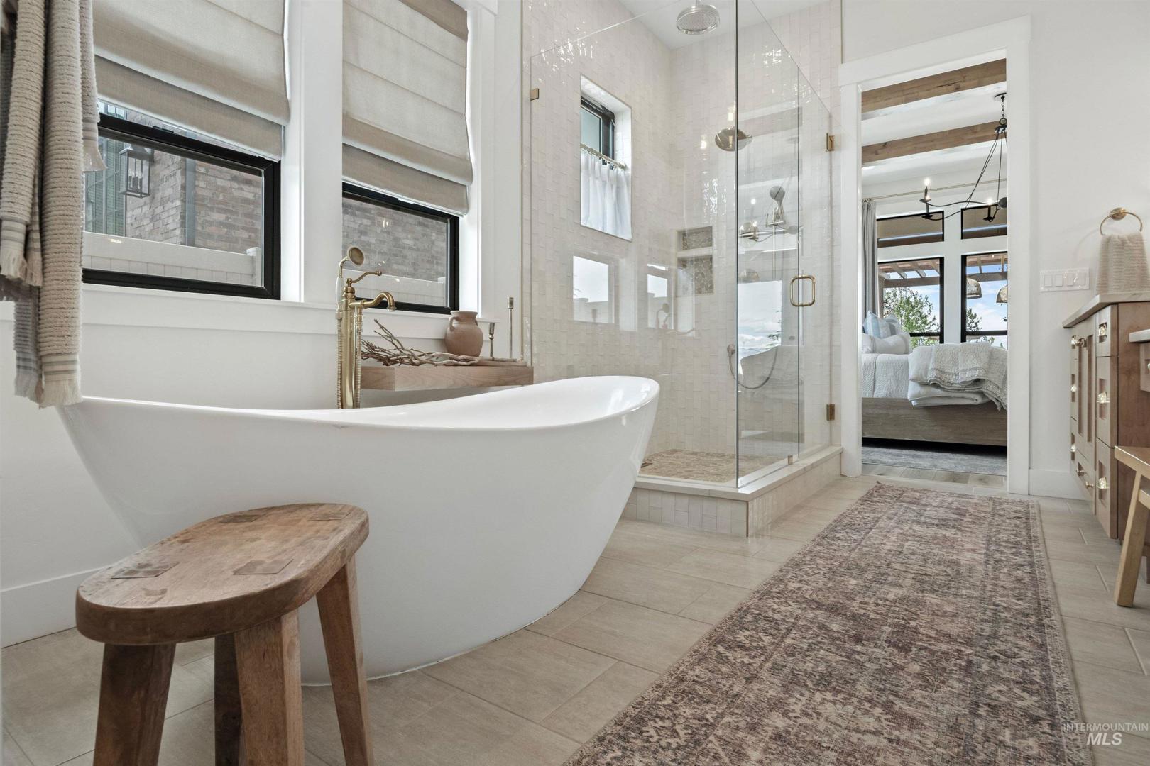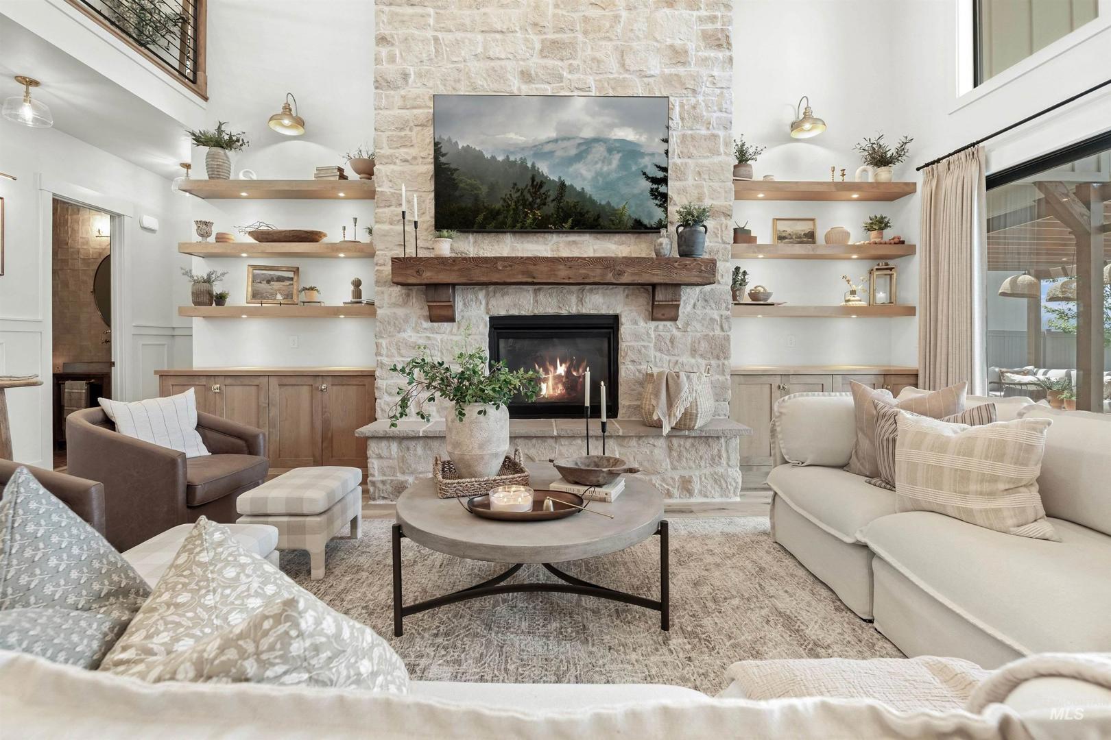 Step into a life where every moment feels elevated. This exceptional Custom Luxury Residence—set within the prestigious enclave of The Keep—blends Modern French Country inspiration with the kind of comfort, warmth, and effortless sophistication that turns a house into a sanctuary. Resting on over half an acre, it includes a private-entry Casita that creates the perfect haven for guests, extended family, or quiet weekend retreats. From the very first step inside, the home sets a tone of refined living. Grand arched glass-and-iron doors, framed by softly glowing gas lanterns, open to cathedral ceilings that invite light and air to flow freely. Throughout this full custom home, curated details tell a story: artisan tilework, custom millwork, brass accents, and reclaimed wood from the historic Simplot Barn infuse each space with authenticity and soul. Designed for those who love to gather, cook, and celebrate, the home features alder cabinetry, mitered-edge quartz countertops, striking limestone fireplaces, and two chef-worthy kitchens—each equipped with 6-burner ZLINE gas ranges, premium appliances, and a butler’s pantry that keeps entertaining effortless. A main-level office, an upstairs bonus room, a flexible additional living space, and a hidden tech nook offer room for creativity, productivity, and play. The 40` RV bay ensures that adventure is always within reach.