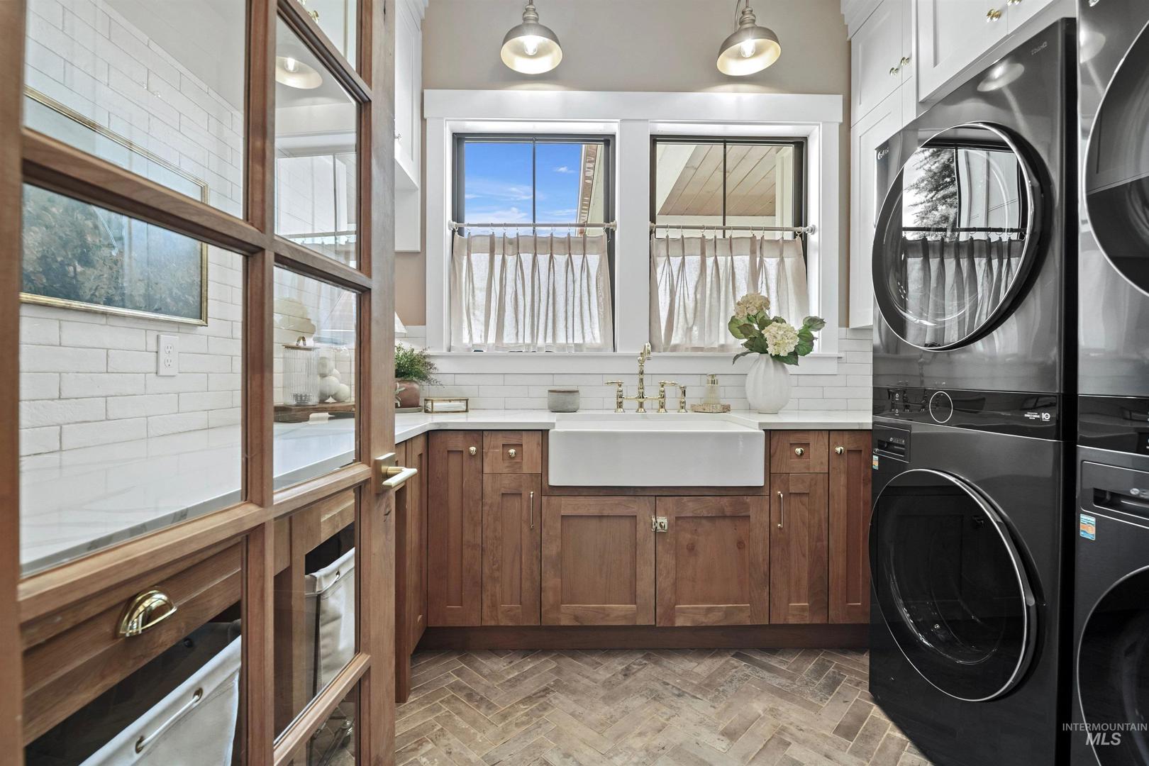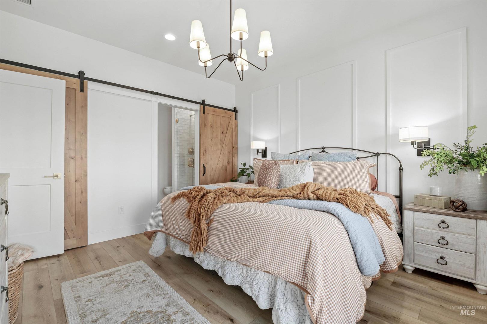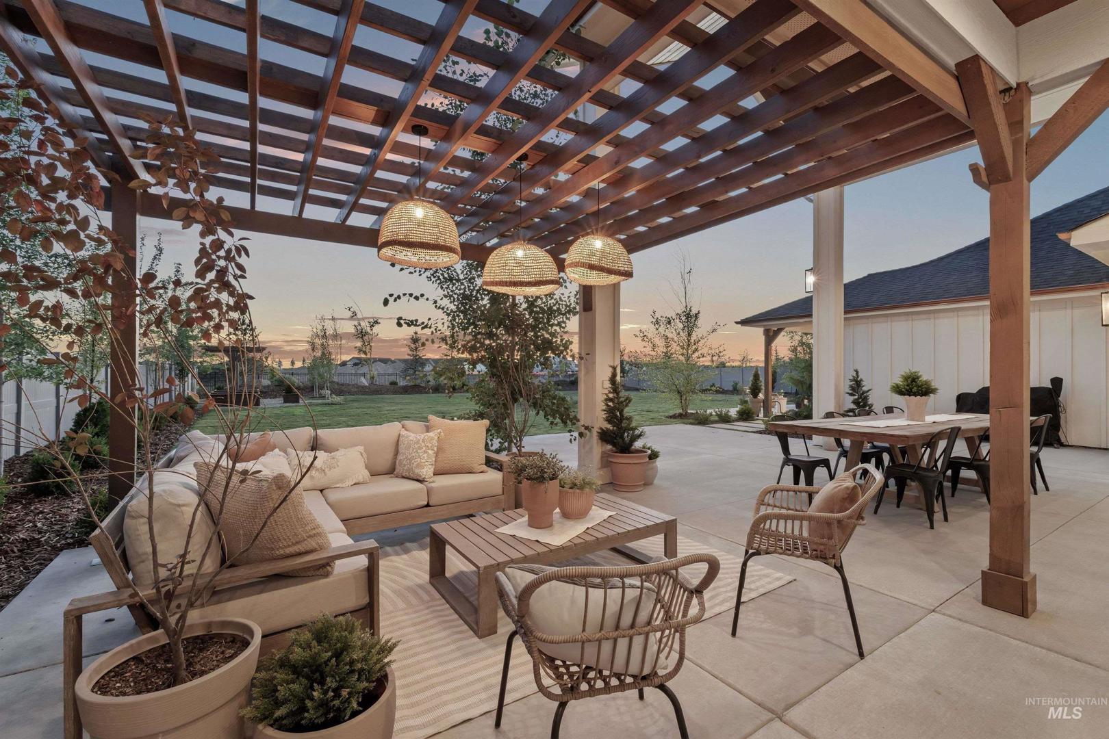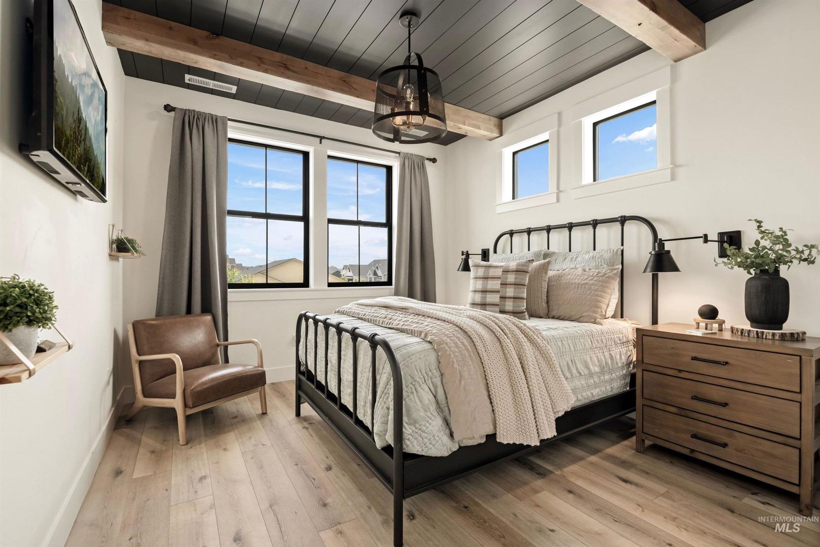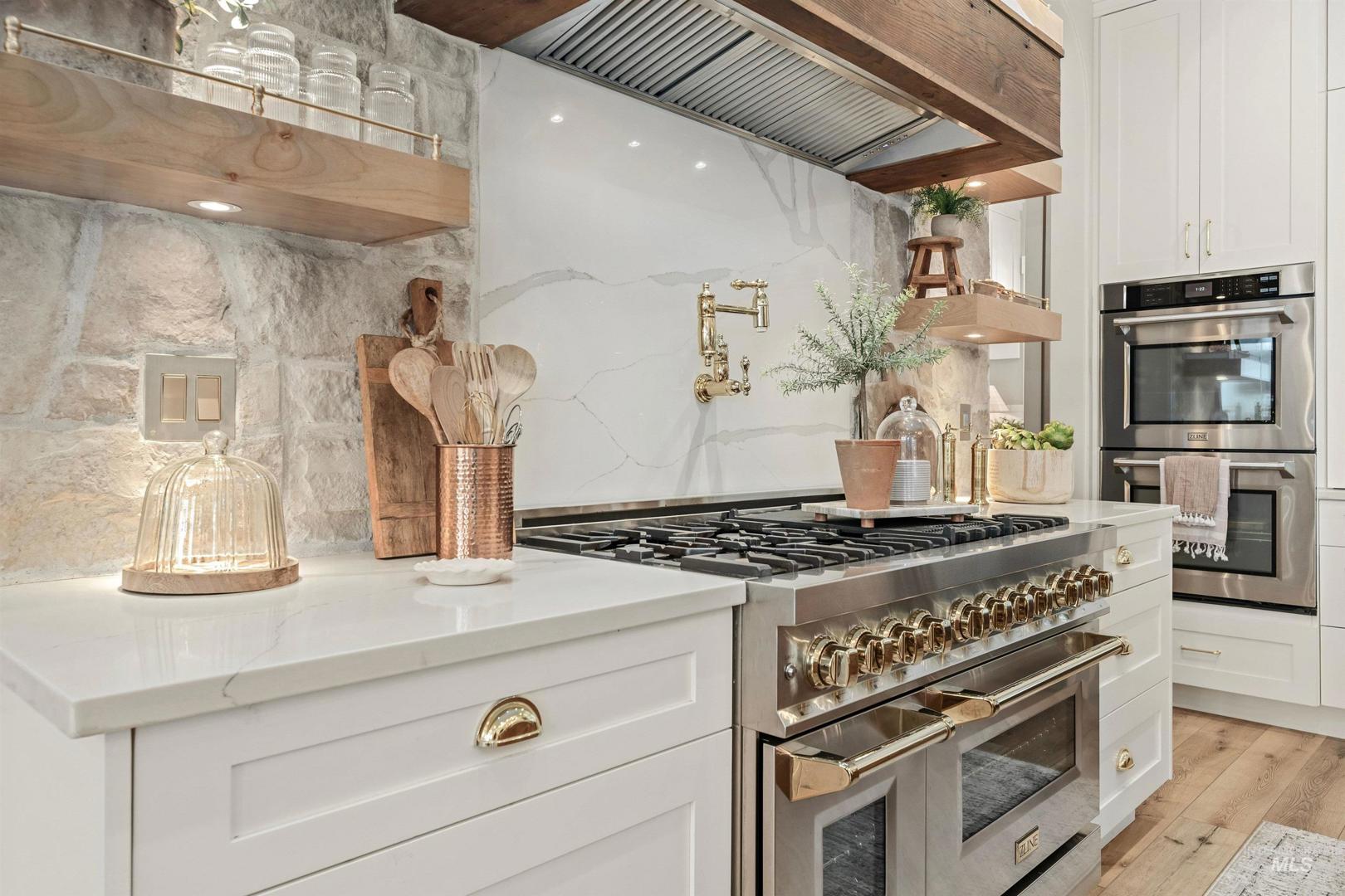 Step into a life where every moment feels elevated. This exceptional Custom Luxury Residence—set within the prestigious enclave of The Keep—blends Modern French Country inspiration with the kind of comfort, warmth, and effortless sophistication that turns a house into a sanctuary. Resting on over half an acre, it includes a private-entry Casita that creates the perfect haven for guests, extended family, or quiet weekend retreats. From the very first step inside, the home sets a tone of refined living. Grand arched glass-and-iron doors, framed by softly glowing gas lanterns, open to cathedral ceilings that invite light and air to flow freely. Throughout this full custom home, curated details tell a story: artisan tilework, custom millwork, brass accents, and reclaimed wood from the historic Simplot Barn infuse each space with authenticity and soul. Designed for those who love to gather, cook, and celebrate, the home features alder cabinetry, mitered-edge quartz countertops, striking limestone fireplaces, and two chef-worthy kitchens—each equipped with 6-burner ZLINE gas ranges, premium appliances, and a butler’s pantry that keeps entertaining effortless. A main-level office, an upstairs bonus room, a flexible additional living space, and a hidden tech nook offer room for creativity, productivity, and play. The 40` RV bay ensures that adventure is always within reach.
