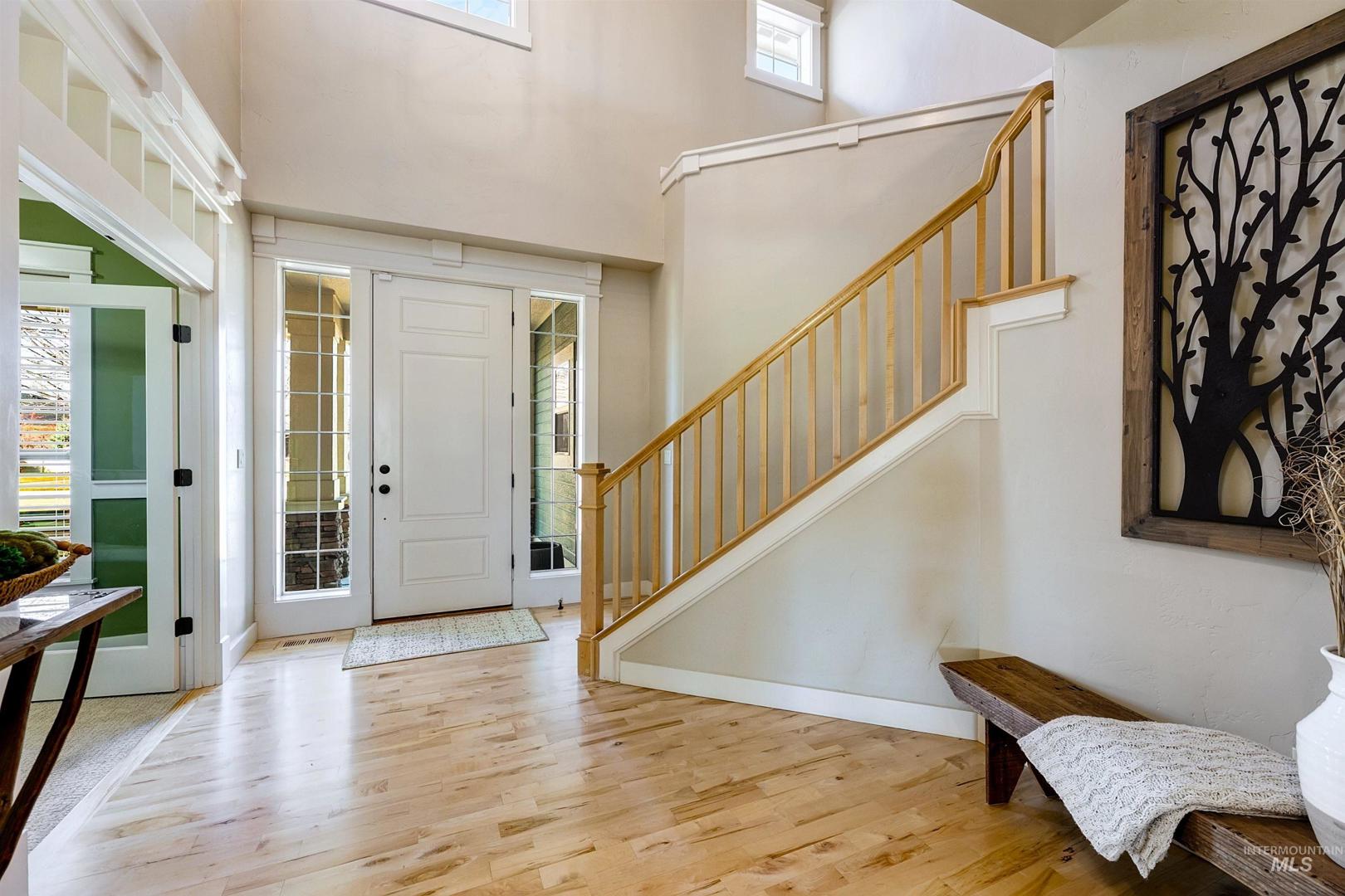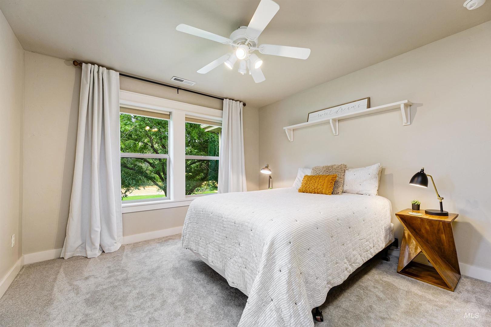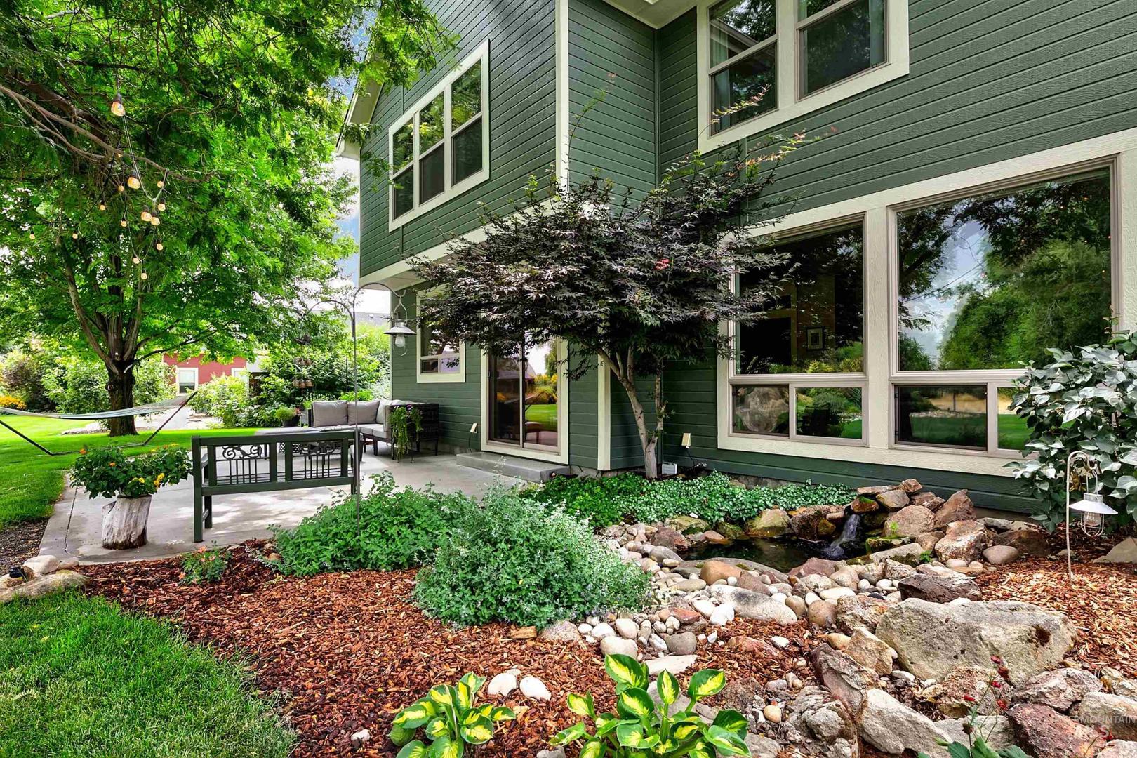 Gracefully poised on .74 acres at the end of a quiet cul-de-sac in Star’s coveted Westpointe neighborhood, this impeccably maintained 3,138 sq ft home offers the freedom of acreage living just one mile from downtown. With no rear neighbors, the setting unfolds as a private retreat featuring mature landscaping, fruit trees, grape vines, blackberry and raspberry bushes, raised garden beds, a spacious firepit, in-ground trampoline, sports court, and room for a future shop. The thoughtful floorplan includes a main-level primary suite with walk-in closet, secondary closet, and direct backyard access. A dedicated office and open living spaces capture serene, park-like views, while the kitchen overlooks the expansive yard—ideal for everyday living and entertaining. Upstairs offers three bedrooms, including one with a private ensuite and walk-in closet, a versatile bonus room (potential fifth bedroom/media/playroom), and a full bath with dual sinks. Recent updates include a new roof (`25), interior and exterior paint, and carpet. Energy Star certification ensures efficiency and lower utility costs; HVAC and AC are biannually serviced. Three car tandem garage with work bench. Walk to nearby schools, enjoy Hunter Park across the subdivision, easy Hwy 16 access, and sunrise views over Bogus Basin. Acreage of this caliber, moments from Star’s amenities, is truly exceptional. Welcome home.