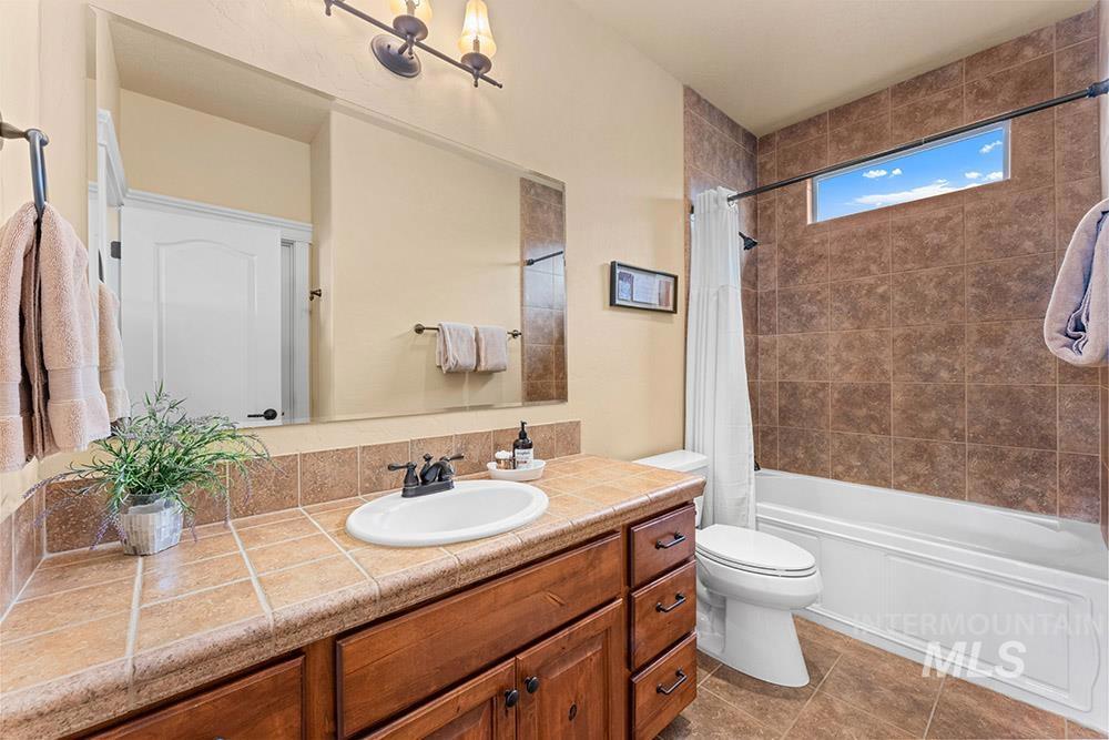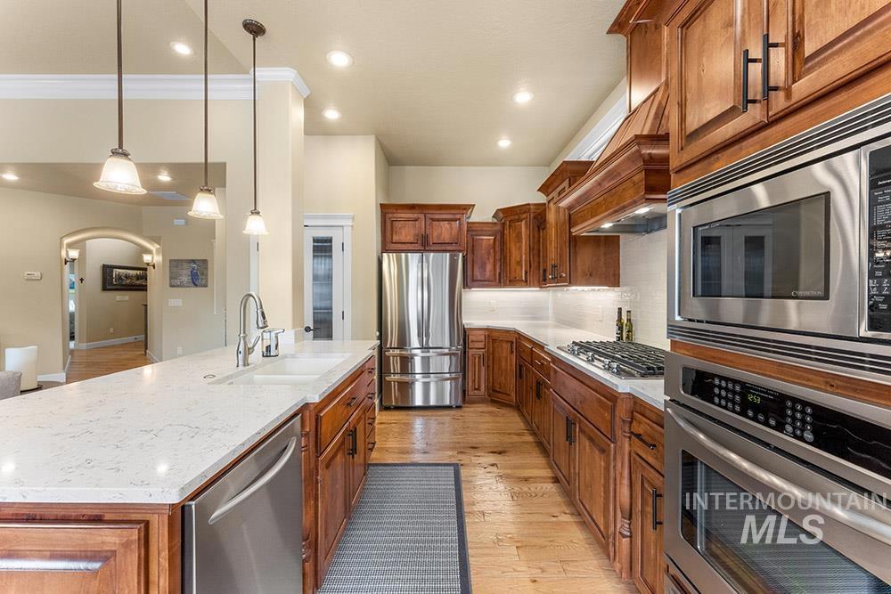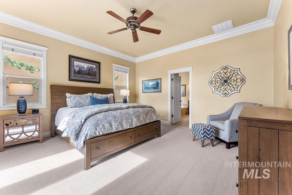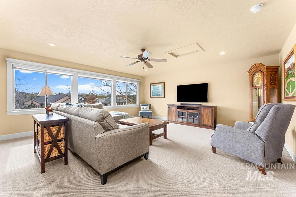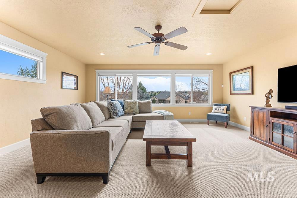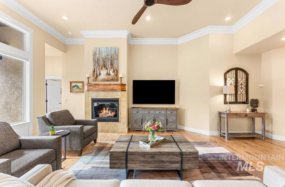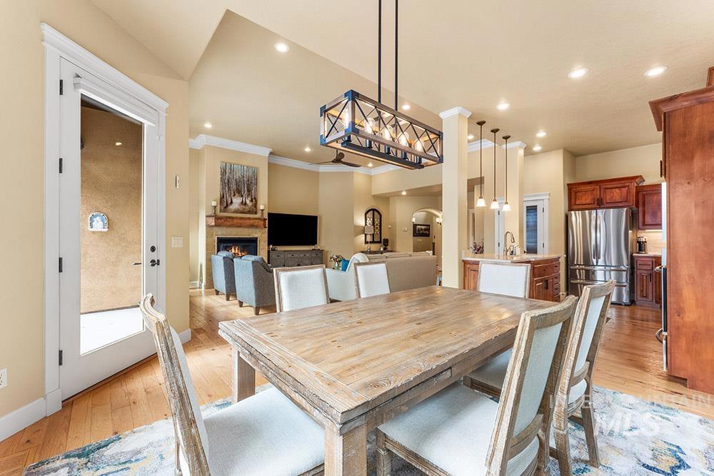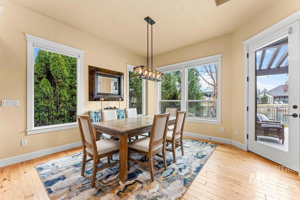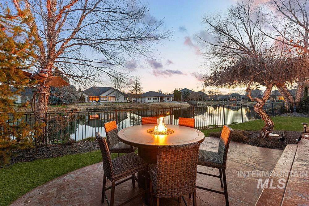 Golf course lifestyle living on a waterfront lot backing to a neighborhood lake in Banbury Meadows! This rich, sophisticated home sits just a block from Banbury Golf Course and minutes from the Boise River and downtown Eagle. The interior features a grand open layout with rich hardwood flooring, detailed trim work, expansive windows showcasing stunning lake views, and a cozy floor-to-ceiling fireplace. The gourmet kitchen is centered around a lengthy entertaining island and includes rich wood cabinetry, updated quartz countertops and backsplash, a gas cooktop, and a large walk-in pantry. The main-level master suite offers direct access to the backyard overlooking the lake and features an en suite bath with dual vanities, a tiled walk-in shower, and a soaker tub. An additional guest bedroom is located on the main level, while the upper level hosts an expansive bonus room ideal for a home theater, gym, or playroom. Enjoy lakeside evenings on the pergola-covered extended stamped concrete patio, offering multiple outdoor entertaining spaces and a neatly manicured lawn for easy upkeep. Experience the premier Banbury lifestyle just moments from the clubhouse, golf course, sports courts, and luxury golf amenities, all while enjoying the vibrant lifestyle and dining of downtown Eagle nearby.