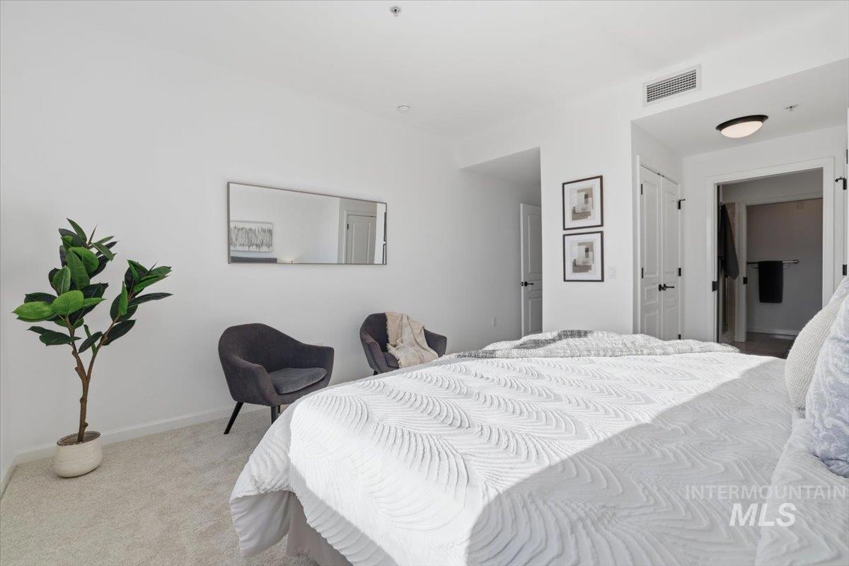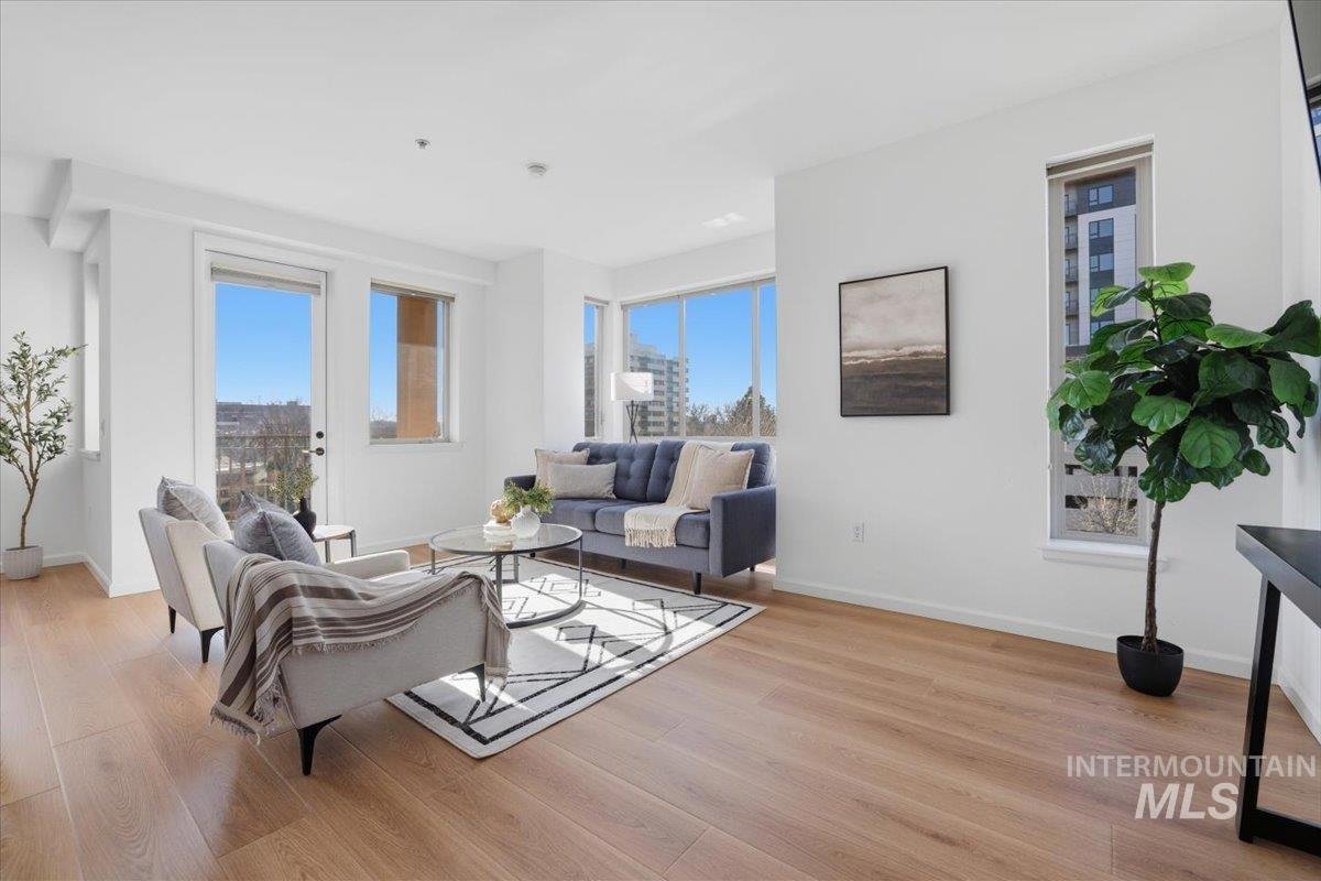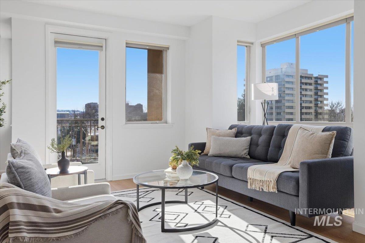 Enjoy vibrant downtown living in this top-floor corner unit condo with beautiful views of Bogus Basin Mountain Recreation Area. Natural light fills the home, highlighting the new luxury vinyl plank flooring throughout and new carpet in the bedrooms, giving the space a fresh, modern feel. The kitchen features granite countertops and a premium Thermador gas range, offering both style and performance for everyday cooking or entertaining. A dedicated office/tech nook provides a convenient workspace for remote work or managing daily tasks. Step outside to the covered patio to relax and take in the views and city atmosphere. The secure building offers peace of mind and includes garage parking and an additional storage unit. Located in the heart of Boise, this condo places you just steps from downtown’s best restaurants, coffee shops, entertainment, and nightlife, while still being minutes from outdoor recreation at Bogus Basin Mountain Recreation Area. Whether you`re enjoying the urban lifestyle or heading to the mountains for skiing, hiking, or biking, this home offers the perfect balance of city convenience and Idaho adventure. Ideal for those seeking low-maintenance living in one of Boise’s most walkable locations.