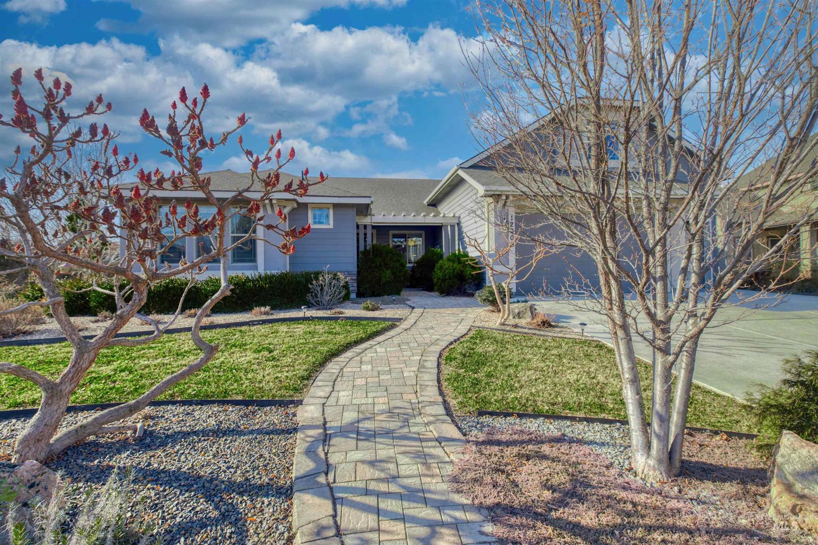 Exceptional single-level residence with an upstairs bonus suite, ideally positioned on a spacious corner lot in the prestigious Carriage Hill subdivision. Designed with both comfort and sophistication in mind, this beautifully maintained home features a thoughtful split-bedroom floor plan offering 3 bedrooms, 2 full bathrooms, and 2 half bathrooms. The home welcomes you with an abundance of natural light that fills the open-concept living spaces, creating a warm & inviting atmosphere throughout. The expansive great room seamlessly connects to the kitchen & dining areas, making it perfect for both everyday living & elegant entertaining. A private office with double glass doors provides a refined workspace or quiet retreat. Upstairs, a versatile bonus room with its own half bath offers endless possibilities, ideal for a media room, guest retreat or additional living space. Step outside to a beautifully designed outdoor living area w/a covered patio w/extensive paver stonework, creating an ideal setting for gatherings or peaceful evenings. Includes a private hot tub, sun screen w/remote the perfect place to relax and unwind. This lightly lived-in home is in excellent condition, showcasing pride of ownership throughout. Additional highlights include abundant storage throughout & featuring a rare 4-car garage. Community has scenic walking paths & neighborhood pool. Minutes to Lake Lowell