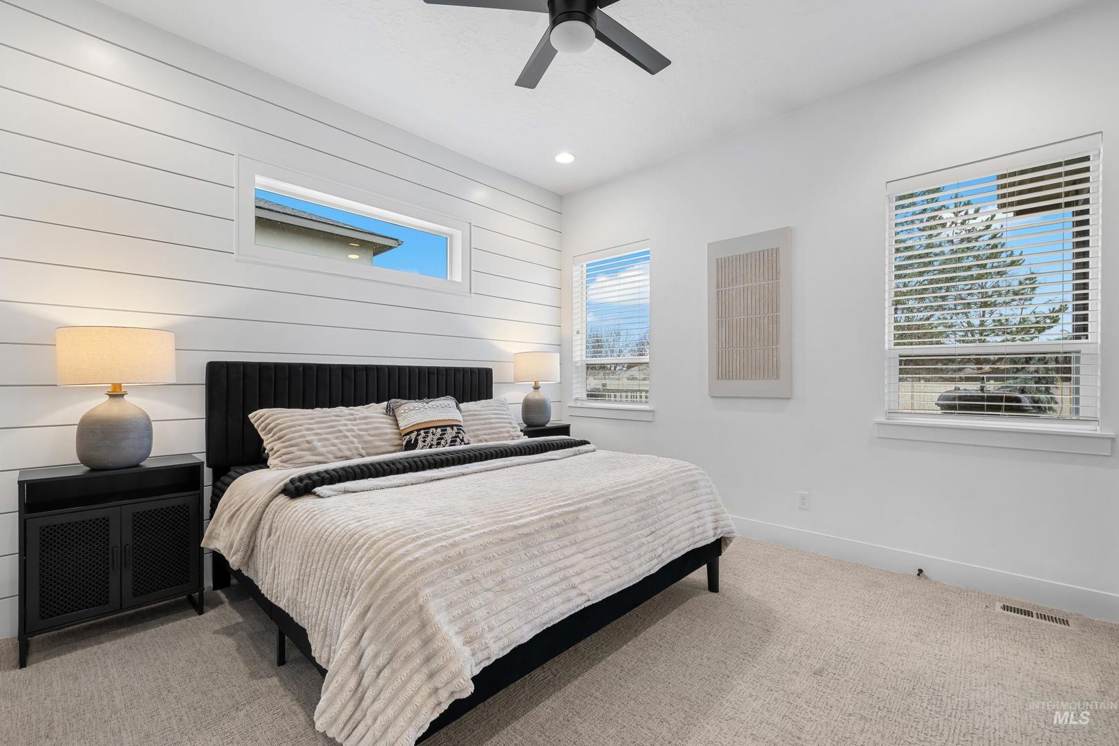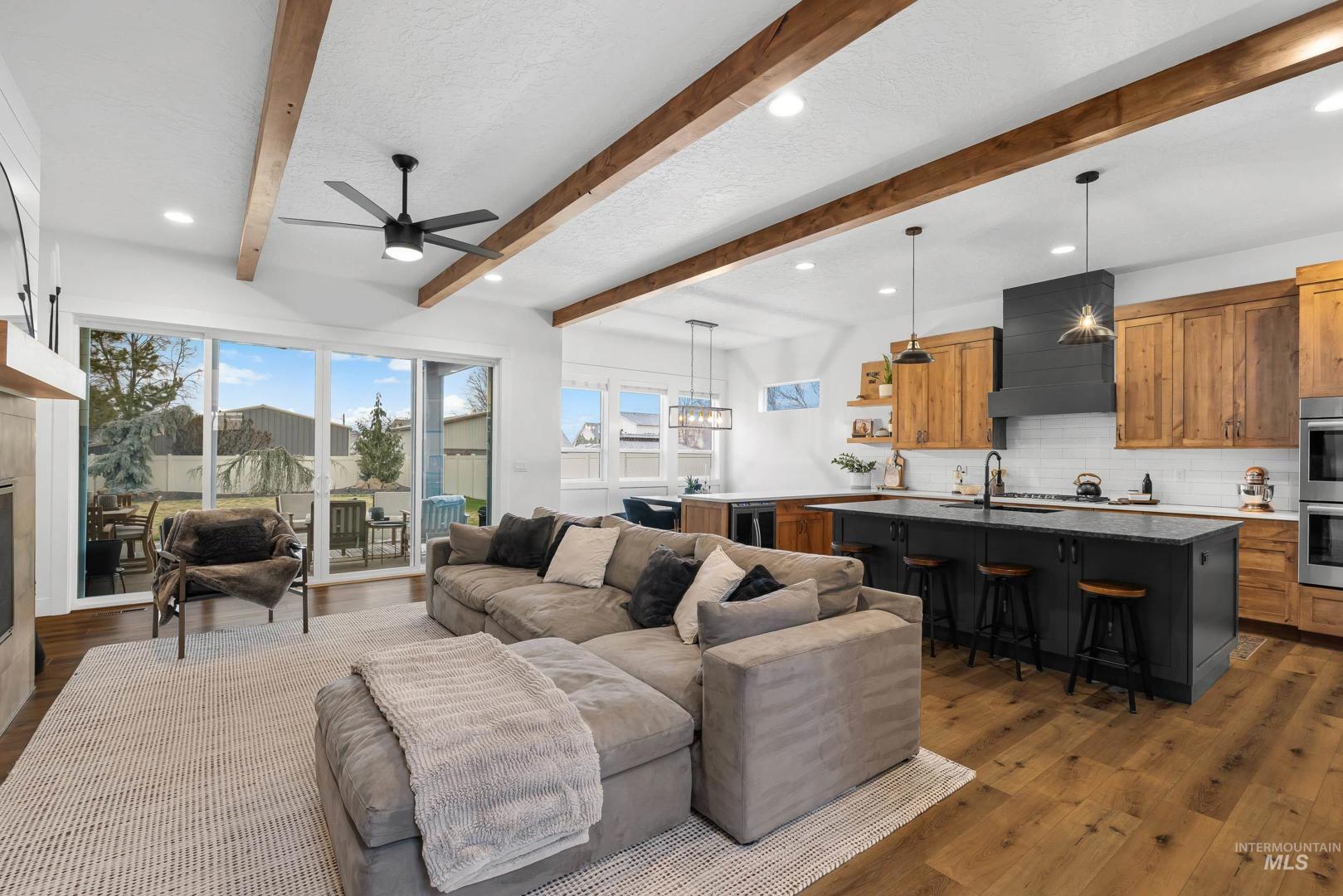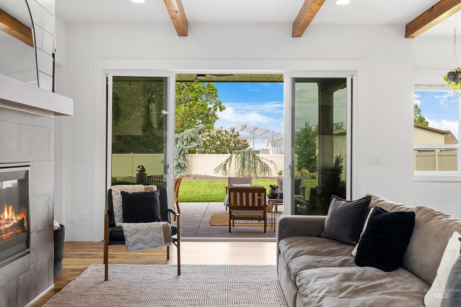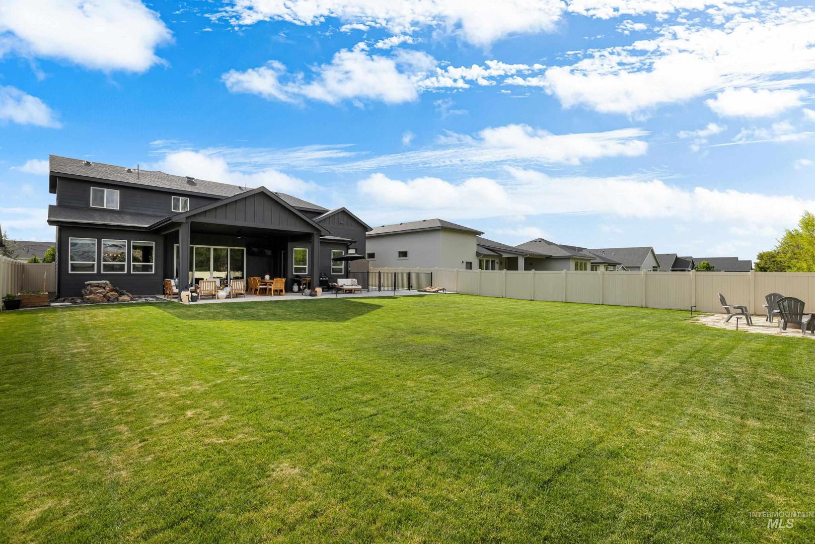 Custom built and packed with upgrades! An Idahoan`s dream 1,220SF garage with a 50` pull through rv bay and built in storage. Situated on a massive 0.28 acre private lot backing to acreage neighbors and sitting on a culdesac out front. The backyard is a patio lovers paradise with a 50` wide concrete pour that opens up to a large covered patio and dog run with pet turf, water feature, paver finished fire pit, swing set with slide, well maintained lawn and evergreen trees. The double sliding glass doors open up the living room to the patio, perfect for those that love to host. The kitchen includes a custom cabinetry package, beverage center, marbled quartz and leathered granite countertops, Bosch appliances and large walk in pantry with butlers shelf. Main level master with dual vanities, walk in tile shower and connecting laundry / mud room. On the main level is another full bedroom/office and a powder bathroom for guests. Upstairs are two bedrooms split by a bonus room, full bathroom and a kitchenette. Quiet community with only 42 lots, friendly neighbors and walking distance to Ridgevue High School. North Nampa is a central hub for easy access to everything Ada and Canyon County. 7 minutes to CostCo, St Lukes and everything Karcher offers for shopping, dining and living. Garage gym is negotiable. Hard to find features at this price point and location!