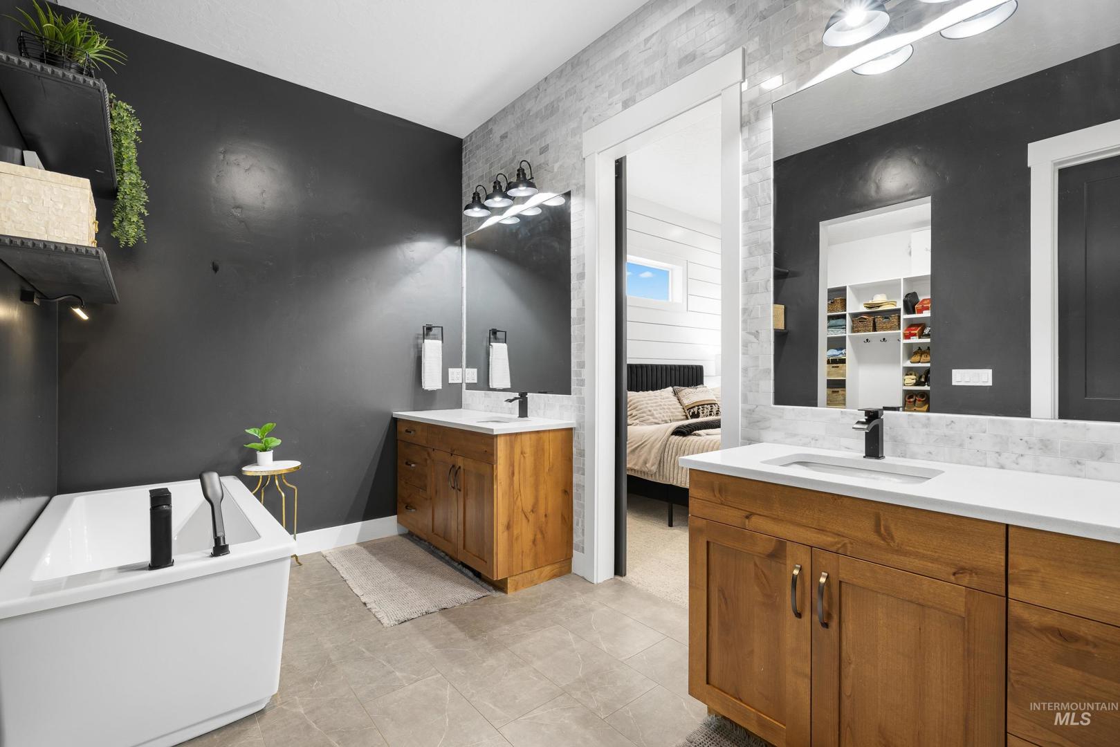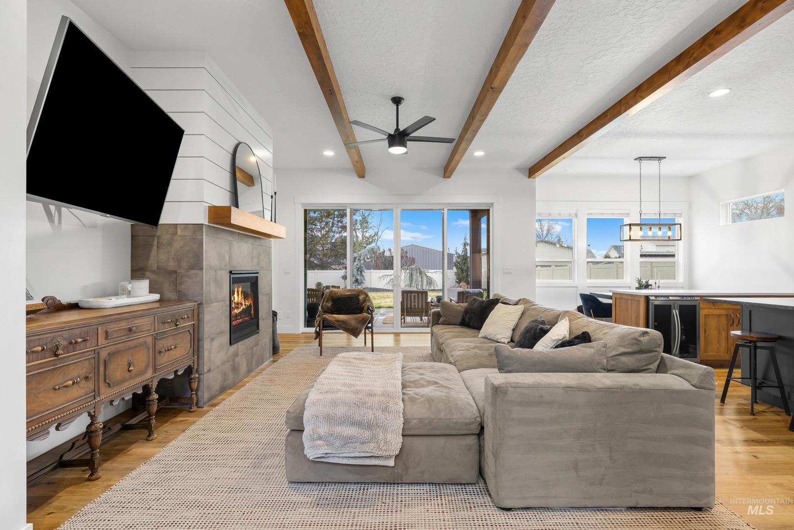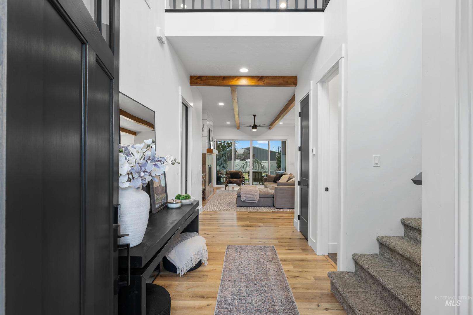 Custom built and packed with upgrades! An Idahoan`s dream 1,220SF garage with a 50` pull through rv bay and built in storage. Situated on a massive 0.28 acre private lot backing to acreage neighbors and sitting on a culdesac out front. The backyard is a patio lovers paradise with a 50` wide concrete pour that opens up to a large covered patio and dog run with pet turf, water feature, paver finished fire pit, swing set with slide, well maintained lawn and evergreen trees. The double sliding glass doors open up the living room to the patio, perfect for those that love to host. The kitchen includes a custom cabinetry package, beverage center, marbled quartz and leathered granite countertops, Bosch appliances and large walk in pantry with butlers shelf. Main level master with dual vanities, walk in tile shower and connecting laundry / mud room. On the main level is another full bedroom/office and a powder bathroom for guests. Upstairs are two bedrooms split by a bonus room, full bathroom and a kitchenette. Quiet community with only 42 lots, friendly neighbors and walking distance to Ridgevue High School. North Nampa is a central hub for easy access to everything Ada and Canyon County. 7 minutes to CostCo, St Lukes and everything Karcher offers for shopping, dining and living. Garage gym is negotiable. Hard to find features at this price point and location!