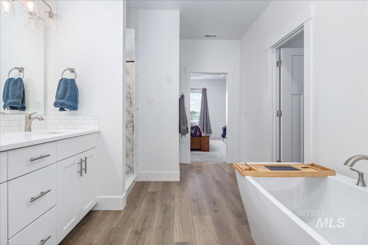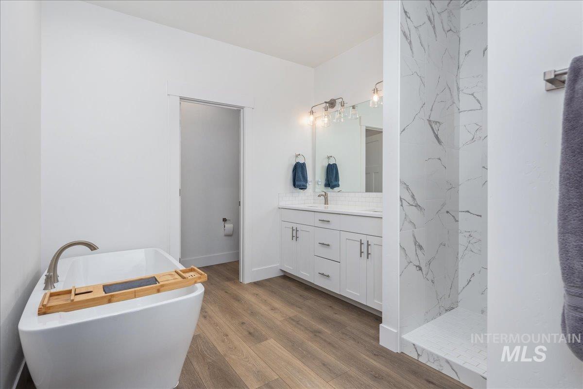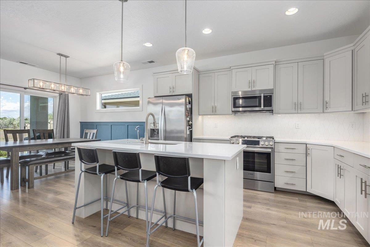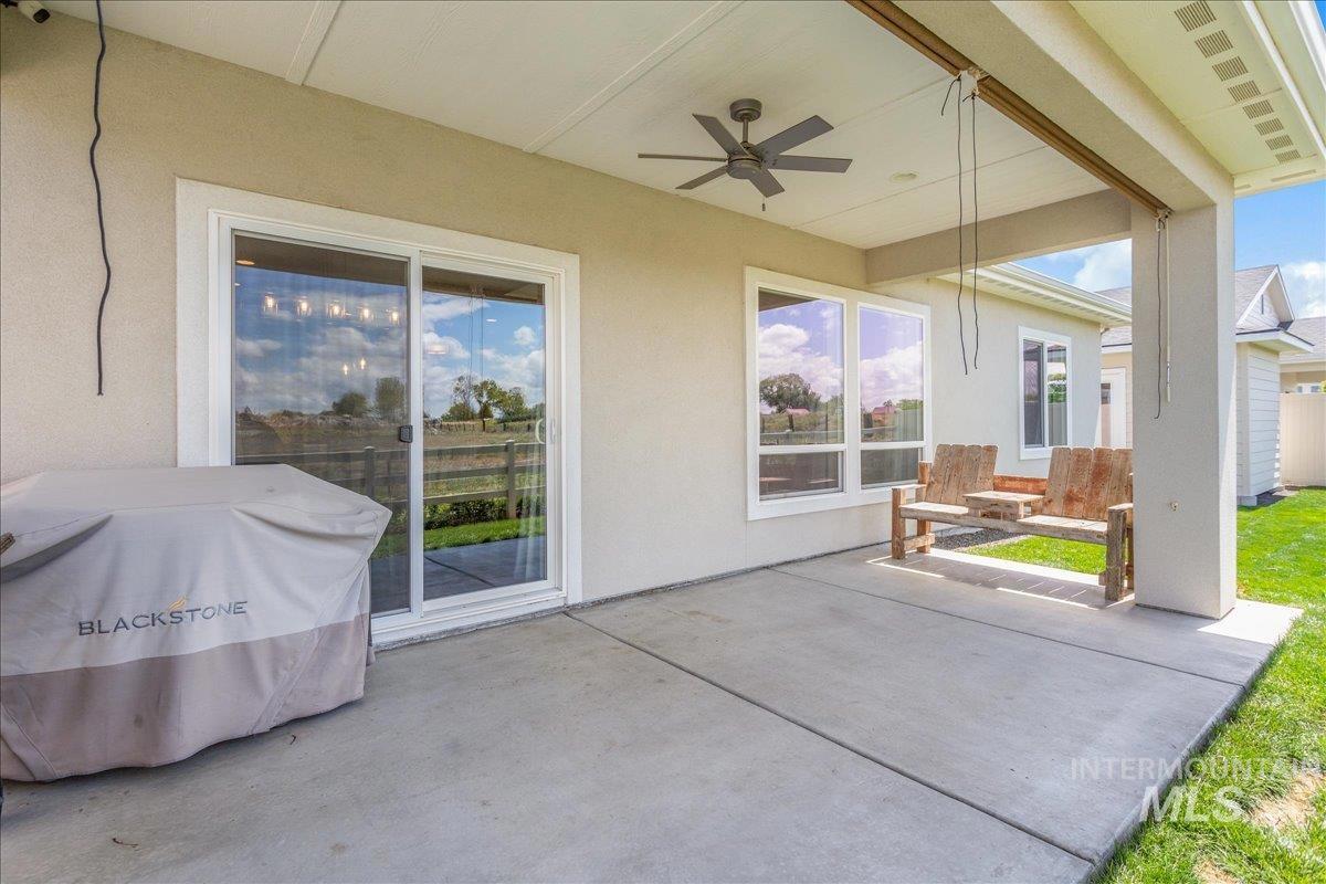 Rare Lava Falls home with a 4 car garage featuring a 35’ RV bay! This like new 3 bedroom, 2 bath residence, built in 2021, offers an open concept layout with high-end finishes throughout. The spacious kitchen features quartz countertops, a tile backsplash, and plenty of room for cooking and entertaining. The primary suite includes a tiled shower and freestanding soaker tub perfect for relaxing after a long day. A recently added central vacuum system adds effortless convenience to everyday living. Step outside to the covered patio and enjoy Idaho’s beautiful sunsets with no rear neighbors. The backyard also includes a storage shed prepped for electricity, ideal for a workshop or additional storage. The 4-car garage’s RV bay measures 35’ deep with a 10’ wide x 12’ high door, providing ample space for vehicles, toys, and gear. Located just minutes from schools, shopping, and everyday amenities, this home combines comfort, functionality, and an excellent location.