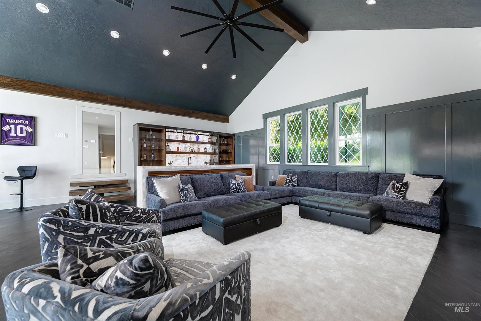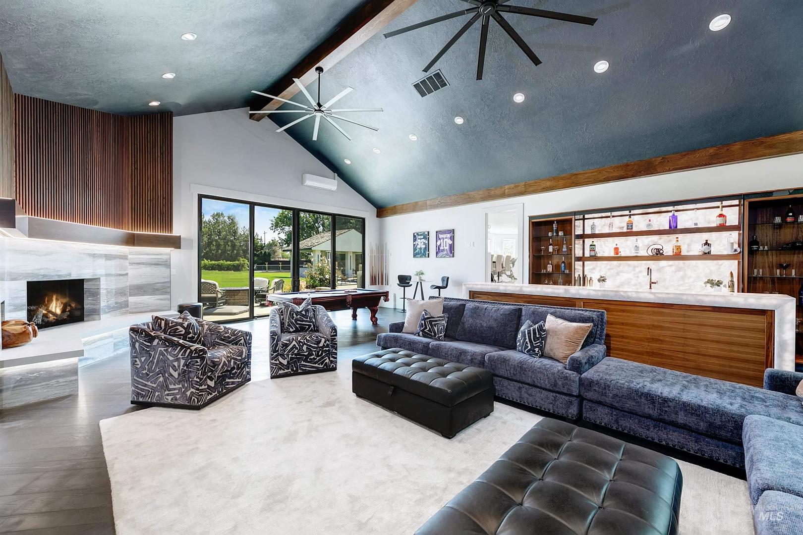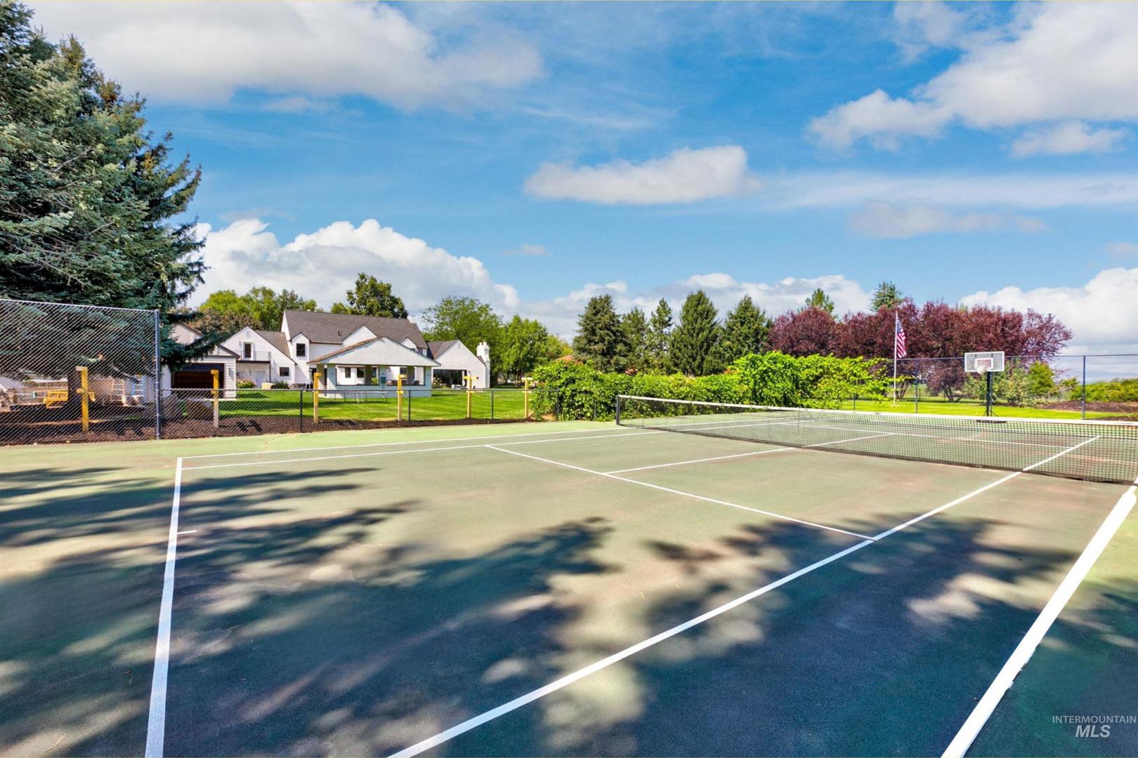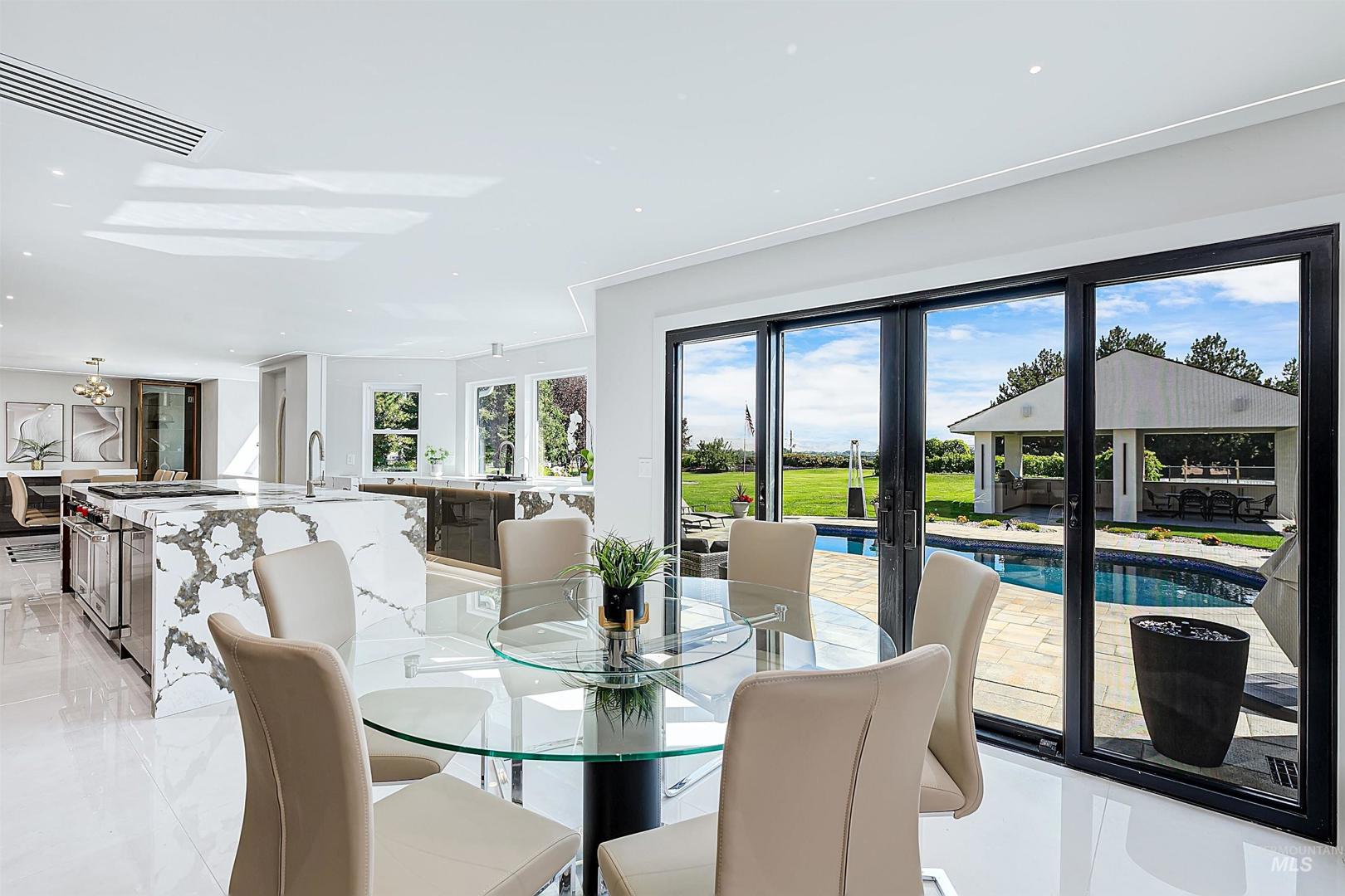 Properties offering this level of design, privacy, and resort-style amenities rarely come available in Eagle. Set on 1.7 elevated acres with sweeping foothills views, this home delivers a blend of modern architecture, luxury finishes, and an exceptional view setting. Thoughtfully remodeled by Legacy Homes in 2024, the 6,286 SF residence showcases craftsmanship and distinctive features throughout. At the center is a stunning chef’s kitchen with Wolf, Sub-Zero, and Thermador appliances, expansive quartzite surfaces, and custom detailing designed for everyday living and large-scale entertaining. A vaulted Great Room creates a dramatic gathering space, complemented by a hotel-inspired wine bar and seamless indoor-outdoor access to the saltwater pool and cabana. The Primary Suite offers a true retreat with heated stone floors, a sculptural floating tub, and panoramic views. The home includes an attached private apartment (In-Law Suite/ADU) with its own entrance, ideal for guests, extended living, or multi-generational flexibility. A detached heated three-car garage with a large upper storage room provides additional space for vehicles, hobbies, or equipment. Designed for both relaxation and recreation, the home features a hidden speakeasy lounge, dedicated home gym, massage room, hot tub, fire pit gathering area, solar panels, a large lawn space, and a full-sized fenced tennis court.