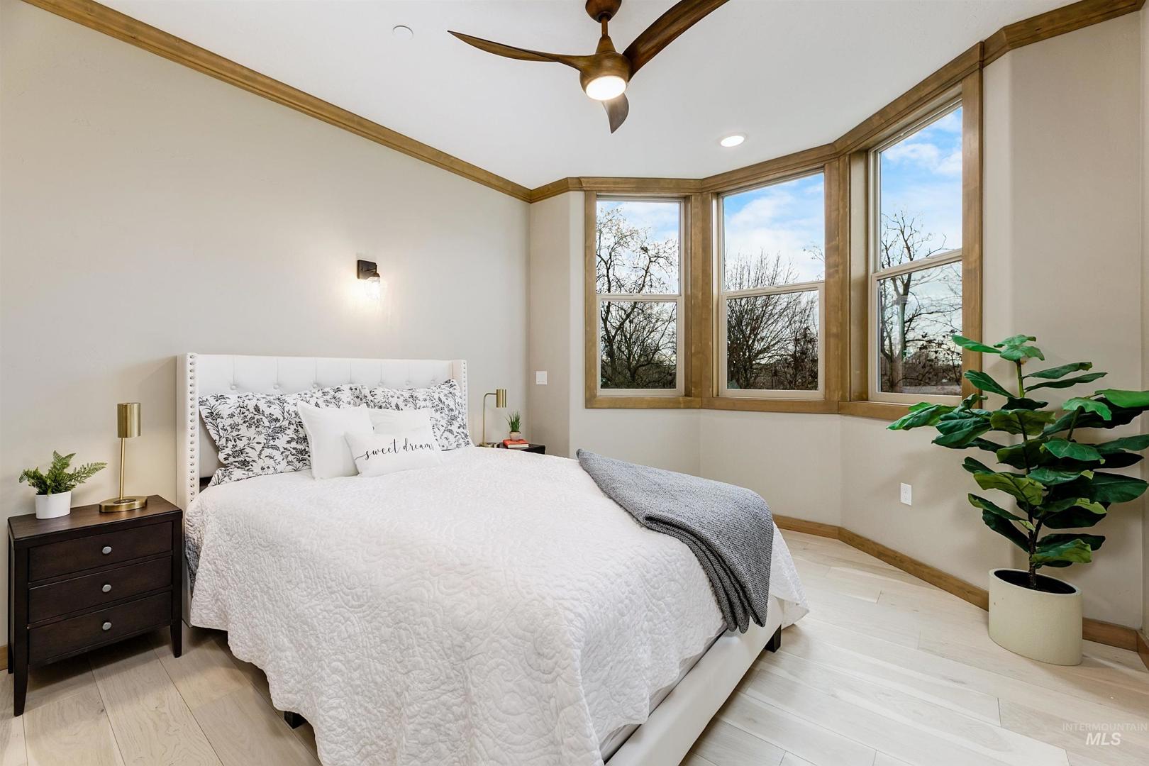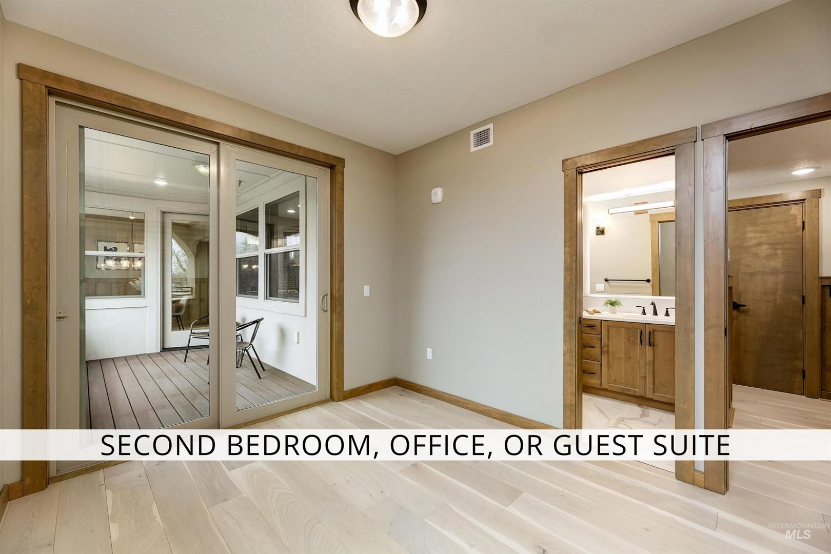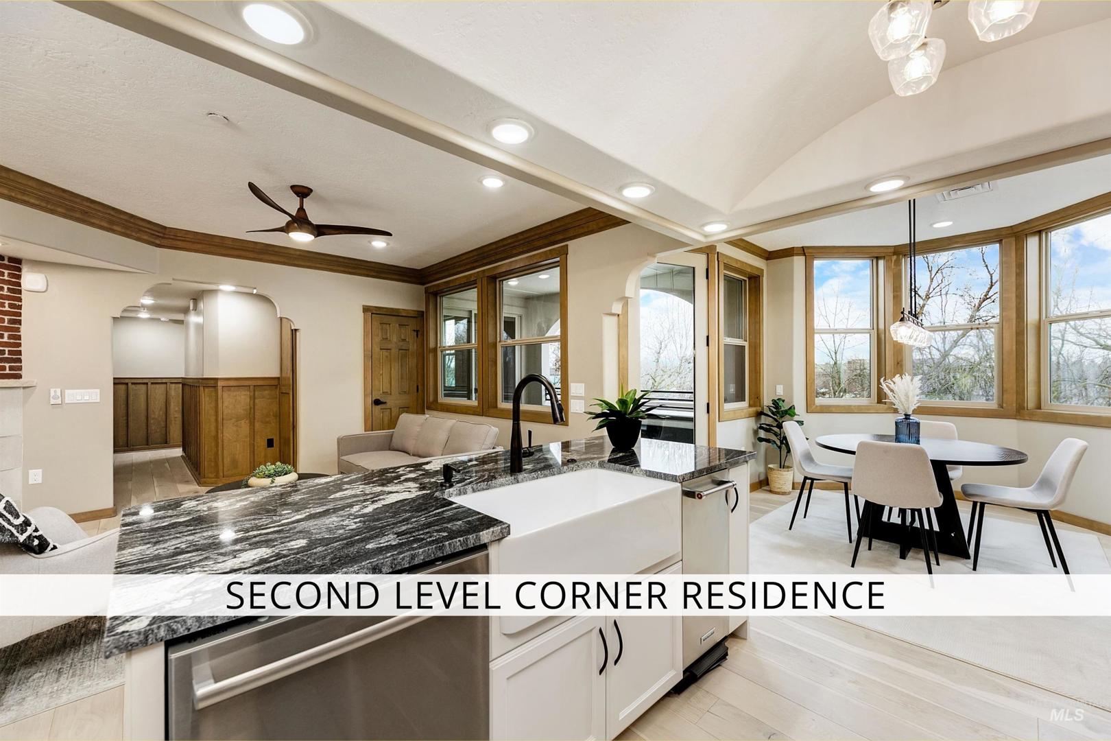 Welcome to Aikens Plaza - a landmark new construction building in the heart of downtown Eagle - this home is one of only eight private residences within the development, delivering a level of exclusivity rarely found. The building is also the only high-security, access-controlled residential property in downtown Eagle, with electronically monitored entry and private enclosed garages that offer peace of mind and convenience. Zero-maintenance living frees you from exterior upkeep and seasonal chores: simply lock and leave when travel calls or step outside your door and enjoy everything downtown has to offer. The most "Walkable" address in downtown Eagle, yet quietly tucked away from it all. Within 2 blocks, you’ll discover more than 50 dining and shopping destinations: cafés, a bakery, banks, restaurants, boutiques, groceries, and everyday essentials - all in the center of a charming and vibrant area. A residence created for ease, positioned for life. As a premier corner residence, this home captures elevated second-level views of the waterway and trees below - all complemented by a private deck. The open-concept design is anchored by a kitchen showcasing elevated ceilings, granite surfaces, and a brick backsplash. Designed with the future in mind, this home is Age-In-Place ready, offering wide passages, elevator access, and a thoughtful layout ready for multiple uses.