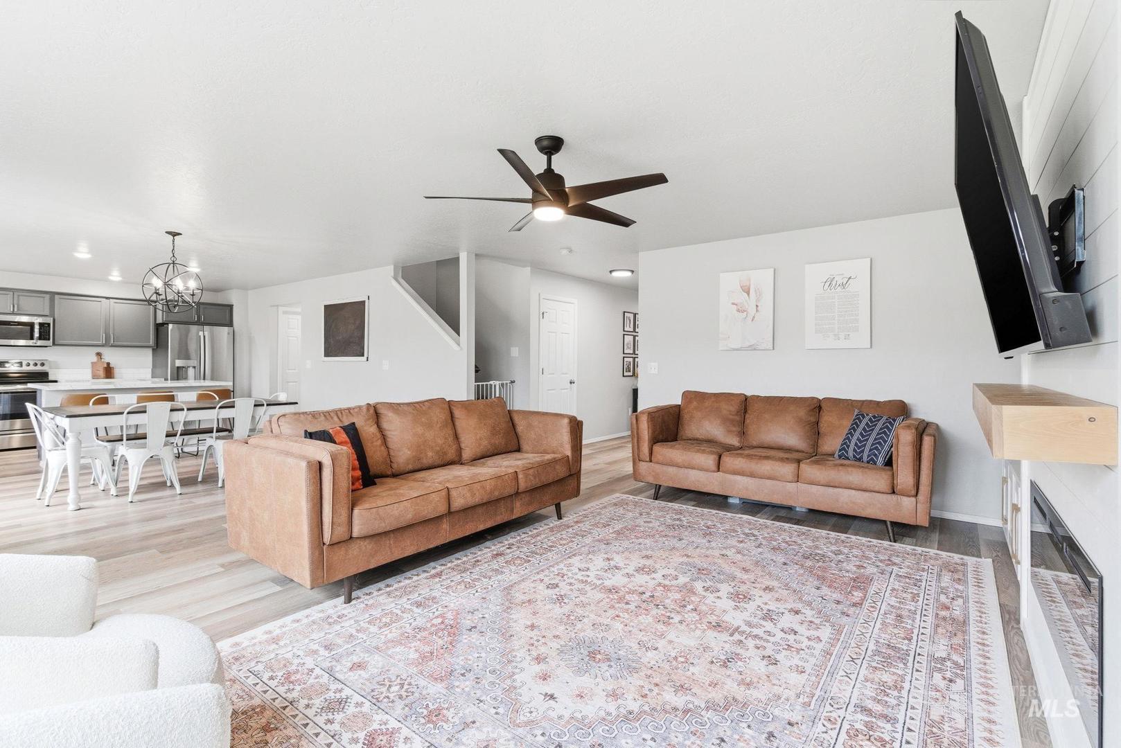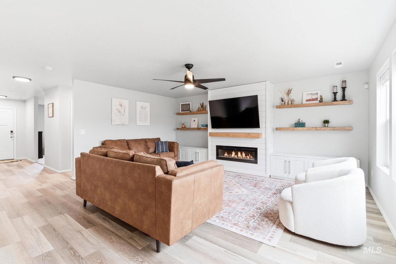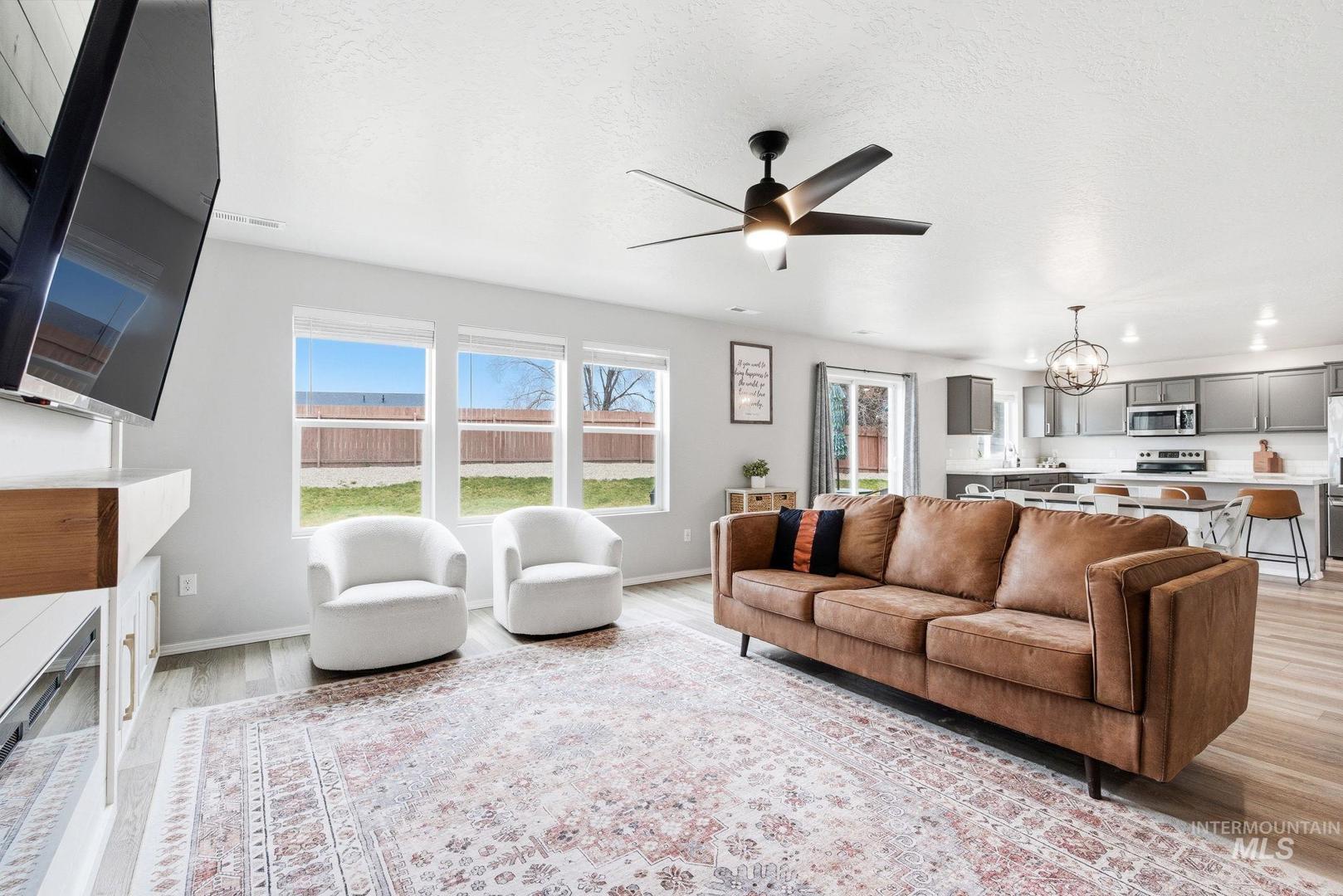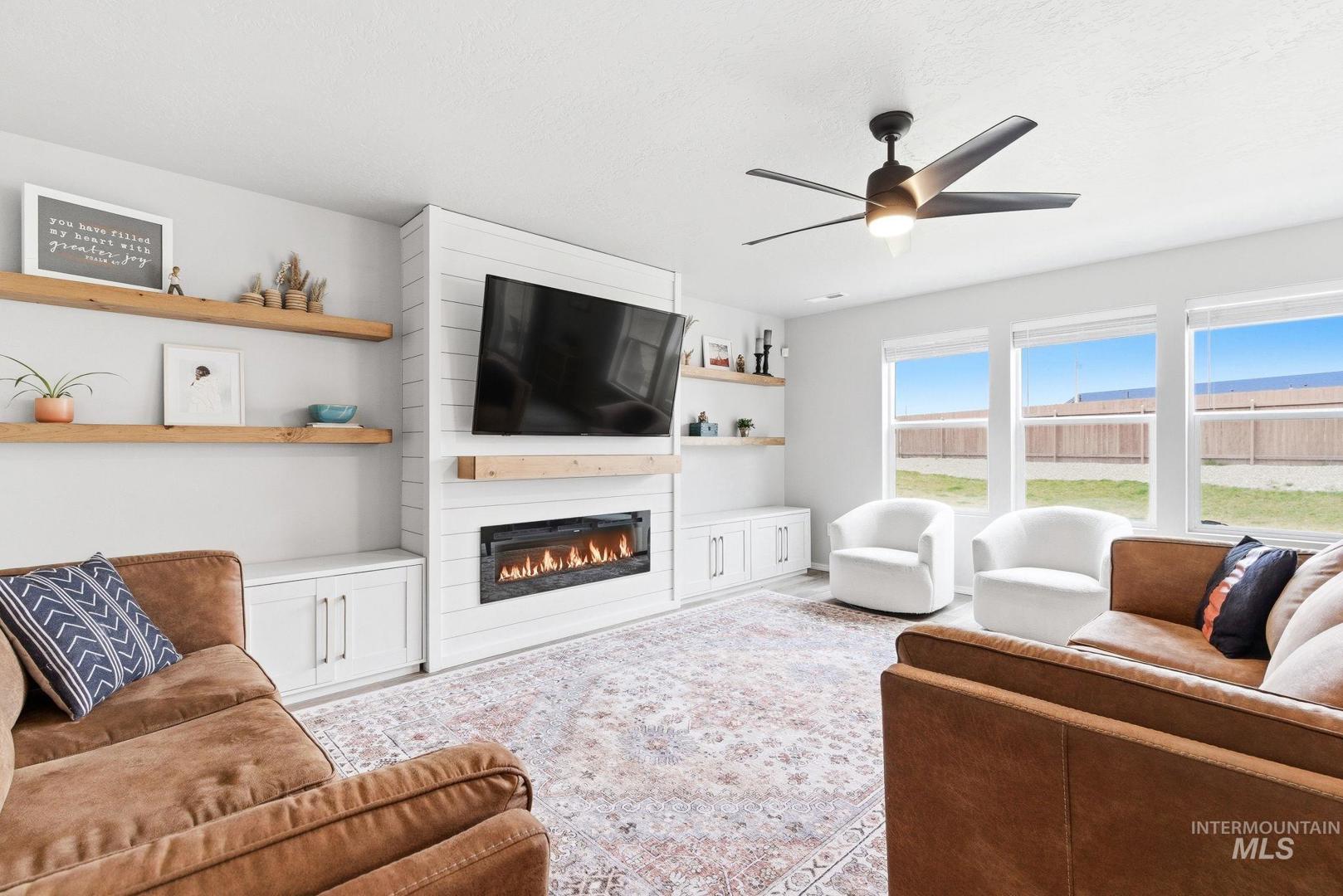 Welcome to this beautiful 4-bedroom, 2.5-bath home located in a quiet cul-de-sac. The open-concept main level features a spacious living room with a stylish electric fireplace, with shelving and cabinets, and upgraded LVP flooring throughout. The kitchen is designed for both function and entertaining with a large island, abundant cabinetry, and a generous pantry. Upstairs, you`ll find a versatile loft space perfect for a playroom, office, or second living area. The primary suite offers a relaxing retreat with double vanities and a large walk-in closet. Step outside to enjoy the fully fenced backyard with automatic sprinklers—perfect for entertaining, relaxing, or pets. Refrigerator, range, washer, and dryer are included—making this home truly move-in ready. BTVAI