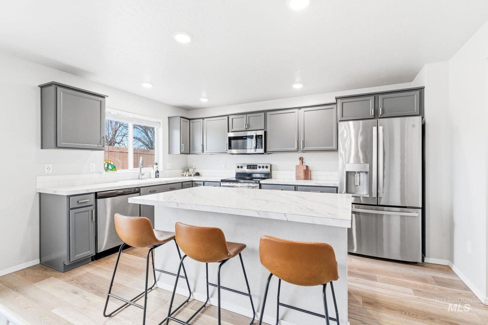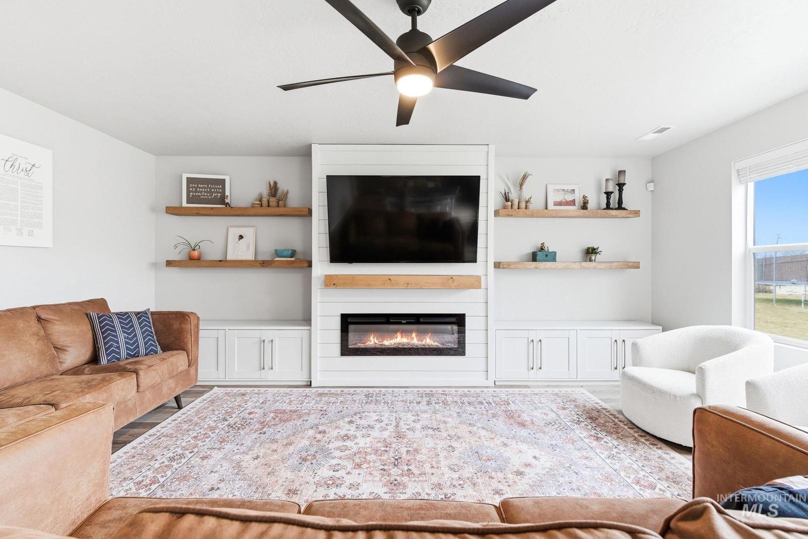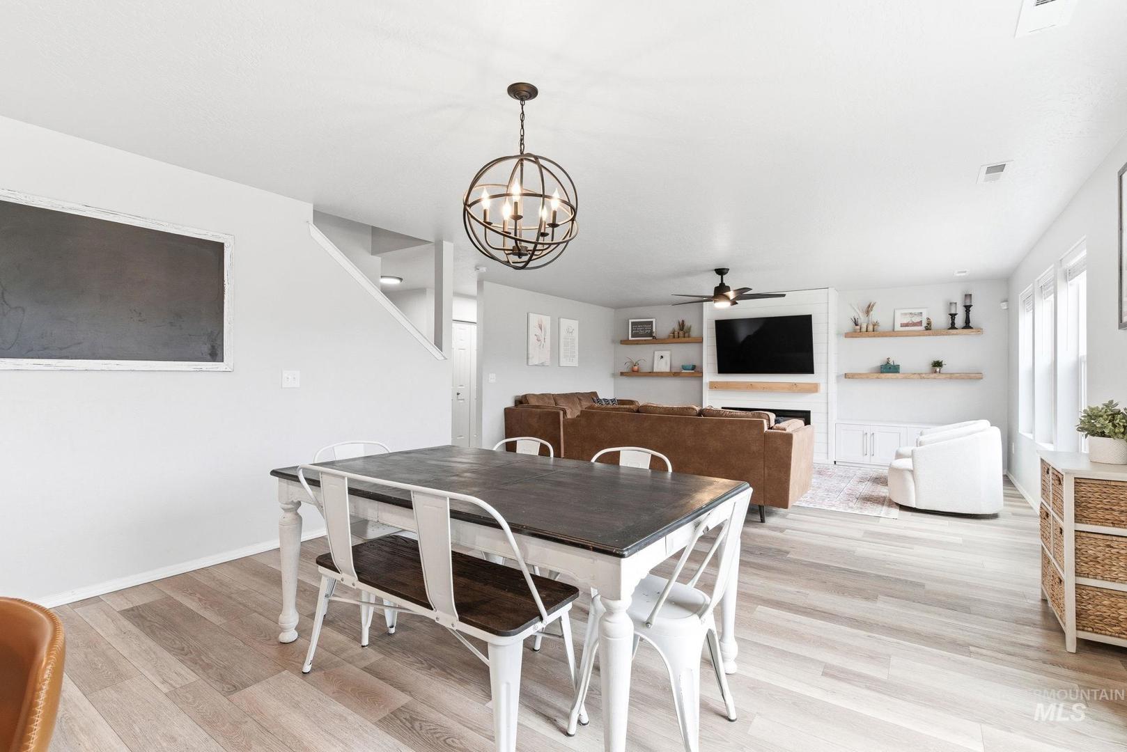 Welcome to this beautiful 4-bedroom, 2.5-bath home located in a quiet cul-de-sac. The open-concept main level features a spacious living room with a stylish electric fireplace, with shelving and cabinets, and upgraded LVP flooring throughout. The kitchen is designed for both function and entertaining with a large island, abundant cabinetry, and a generous pantry. Upstairs, you`ll find a versatile loft space perfect for a playroom, office, or second living area. The primary suite offers a relaxing retreat with double vanities and a large walk-in closet. Step outside to enjoy the fully fenced backyard with automatic sprinklers—perfect for entertaining, relaxing, or pets. Refrigerator, range, washer, and dryer are included—making this home truly move-in ready. BTVAI