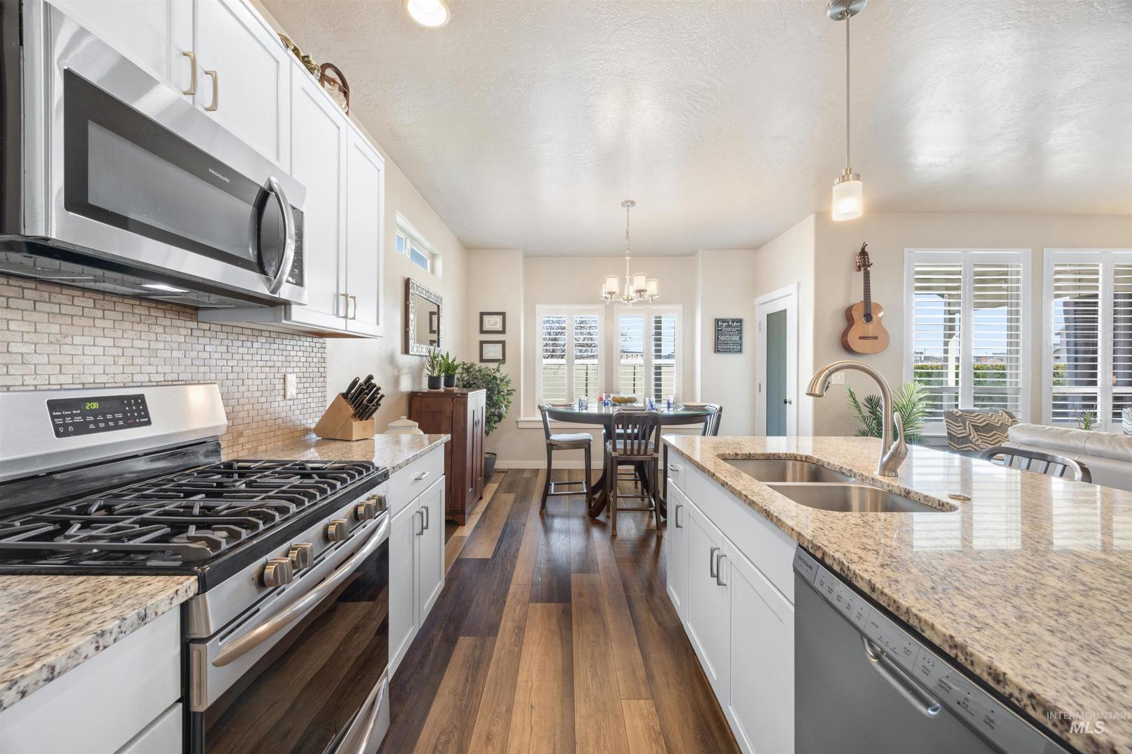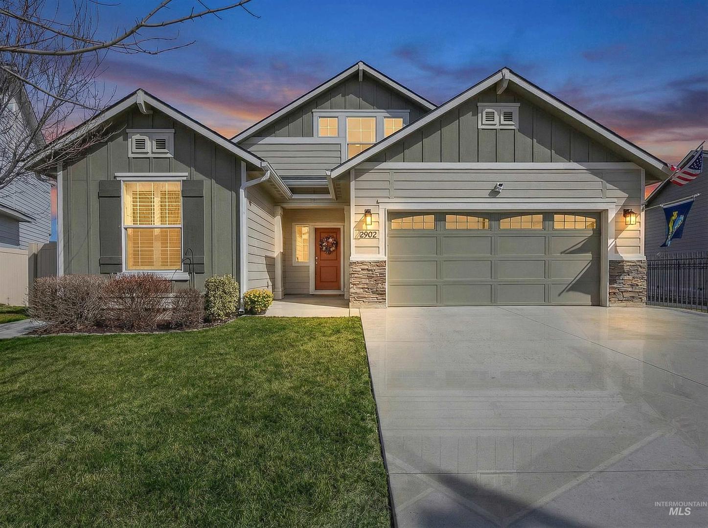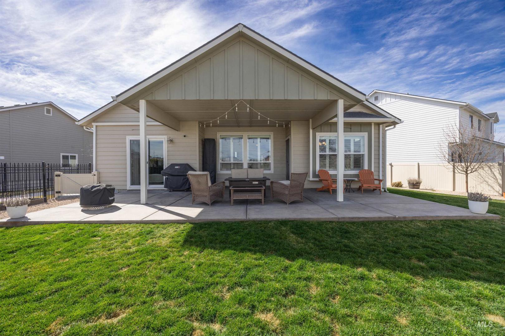 Welcome home ~ this beautifully maintained single-level residence with a spacious bonus room upstairs, ideally located in Meridian. Featuring 3 bedrooms, 2 bathrooms, and soaring 9-foot ceilings throughout. This home offers a bright and inviting open layout designed for comfortable living. Luxury vinyl plank flooring flows through the main living areas, with carpet only in the bedrooms and bonus room for added comfort. The kitchen is both functional and stylish, showcasing granite countertops, abundant cabinetry, and plenty of natural light that fills the home. The Sun Valley textured walls add a warm, and modern finish throughout the interior. The large primary suite provides a peaceful retreat with a walk-in closet and direct access to a private patio. The backyard has been thoughtfully enhanced with additional concrete for a future hot tub, upgraded landscaping, a retaining wall, shrubs, and three raised garden beds—perfect for outdoor enjoyment. With no backyard neighbors and added privacy plants, the space feels secluded. Ideally located just 5 minutes from Scheels, restaurants, and coffee shops, with Costco in Meridian only a 10-minute drive away. Enjoy easy access to I-84, making commuting and daily errands simple and convenient.This home has been meticulously cared for, very clean, and is move-in ready for its next owners.