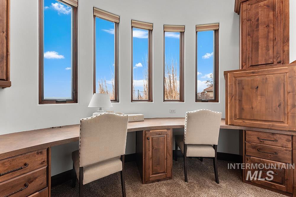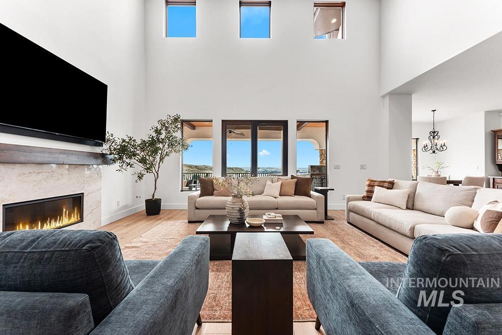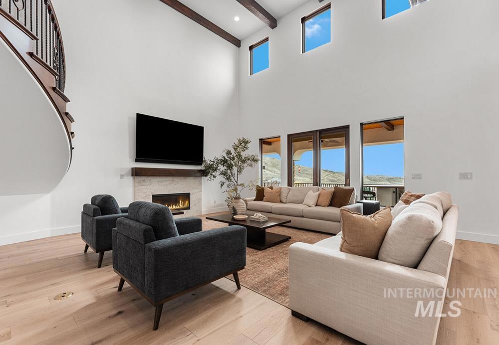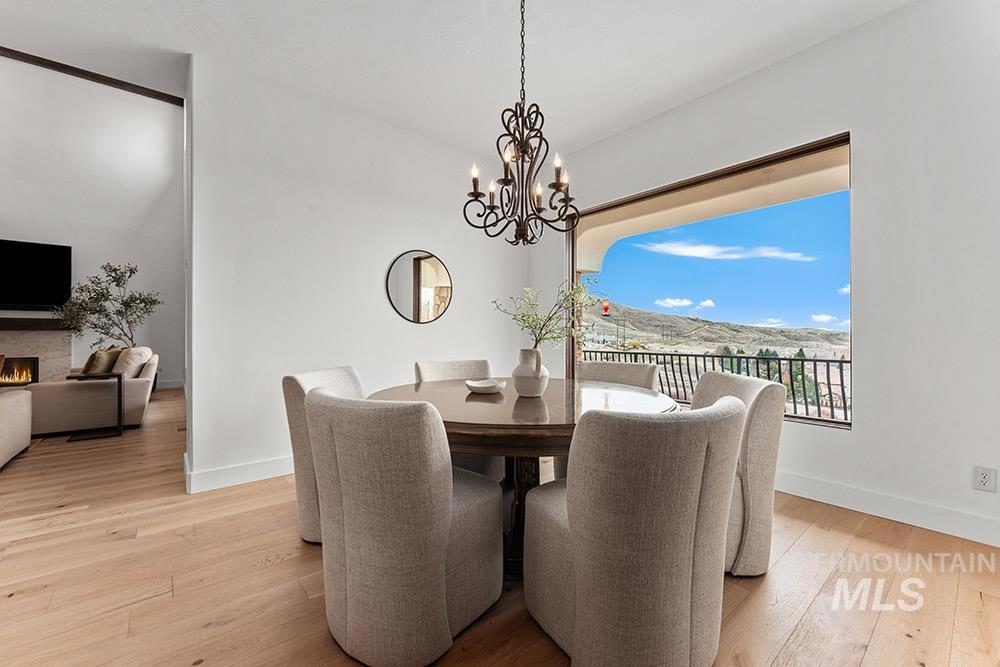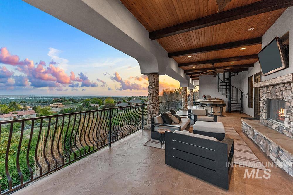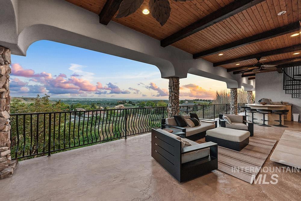 Perched in the coveted East Boise foothills, this custom-built one-owner estate captures breathtaking 180° valley views and rare privacy, surrounded by protected wildlife land. Recently refreshed with new exterior paint, new hardwood flooring, and a beautifully updated kitchen, the home blends timeless design with modern upgrades. Soaring two-story ceilings and expansive windows frame sweeping valley views, while the spacious floorplan offers exceptional areas for everyday living and entertaining. The renovated kitchen features a new island, countertops, backsplash, sinks, and brand-new appliances, complemented by rich cabinetry and a butler’s pantry. New hardwood flooring extends through the hallway, kitchen nook, kitchen, family room, and primary suite. The main-level primary retreat offers balcony access overlooking Table Rock and a spa-inspired bath with heated floors, dual vanities, and a large dressing room. Additional highlights include a library with rolling ladder, curved executive office, formal dining room, and lower-level guest suite with private entry. The walk-out lower level includes a bonus room with kitchenette and full gym, offering fully equipped guest quarters. Outdoor living shines with a wraparound deck featuring a built-in kitchen, fireplace, in-ground hot tub, and putting green, just minutes from St. Luke’s and downtown Boise.