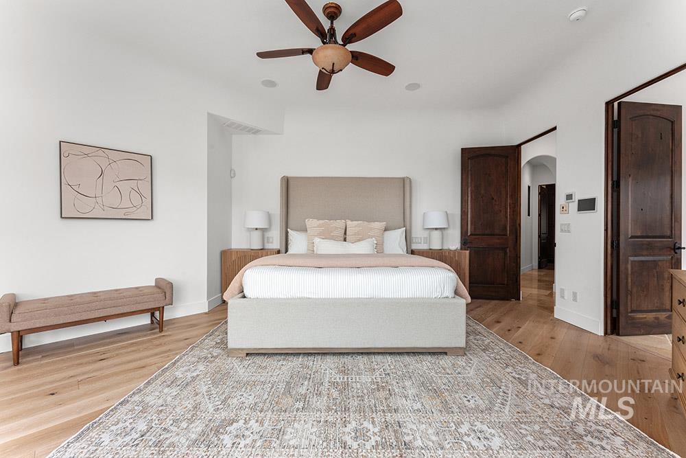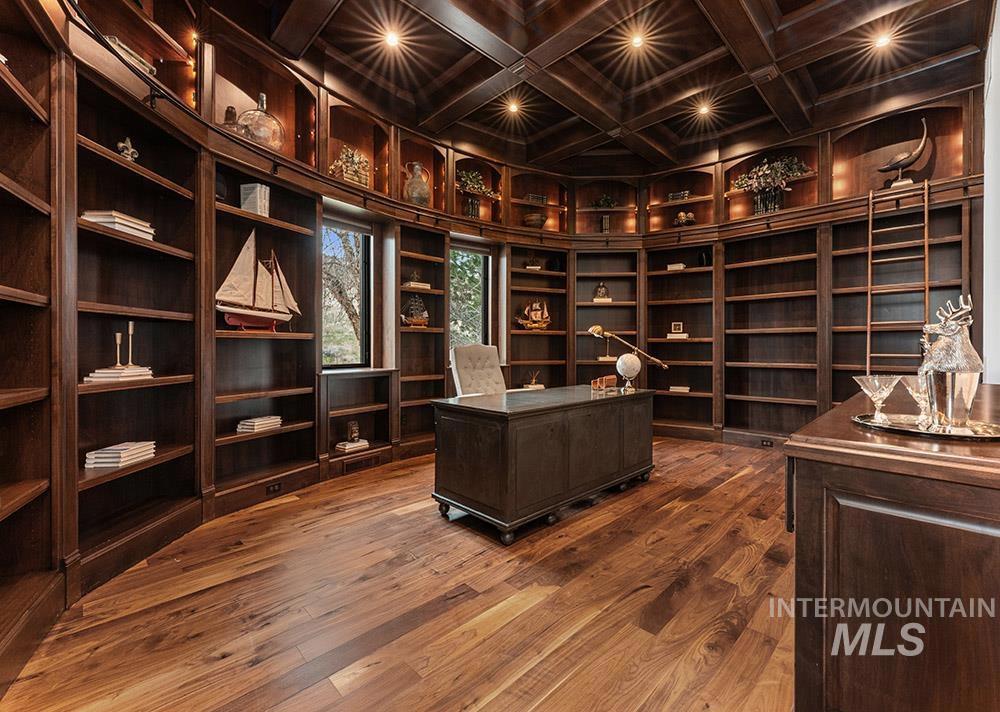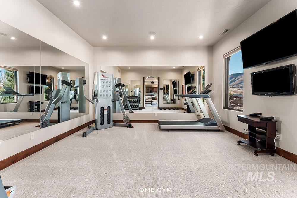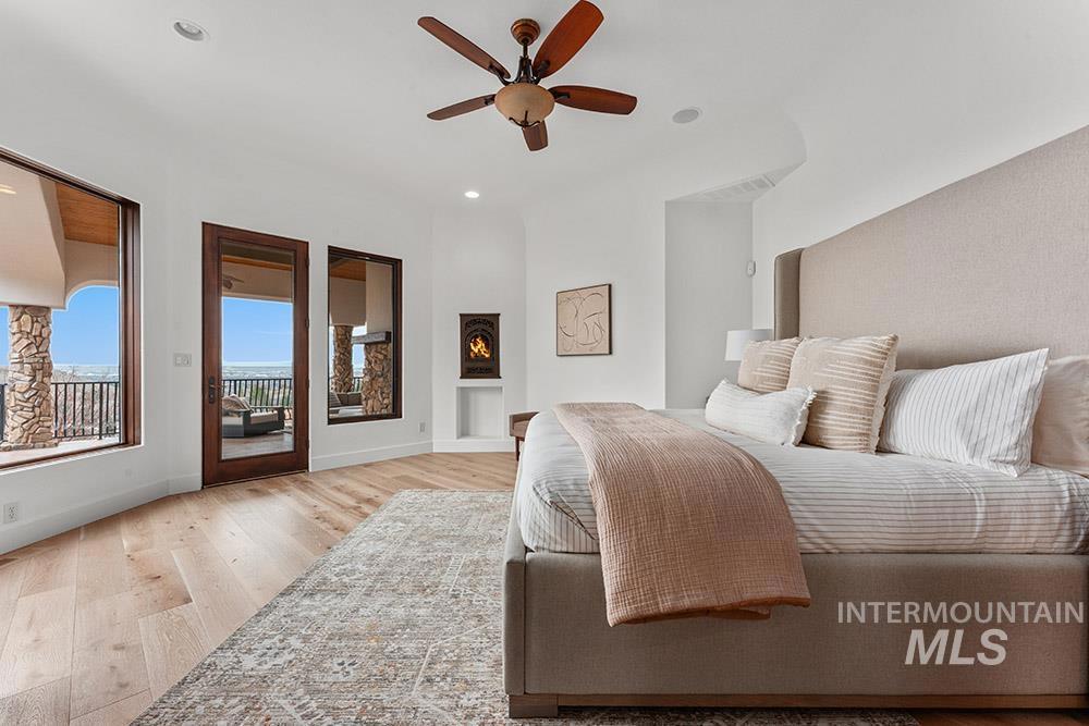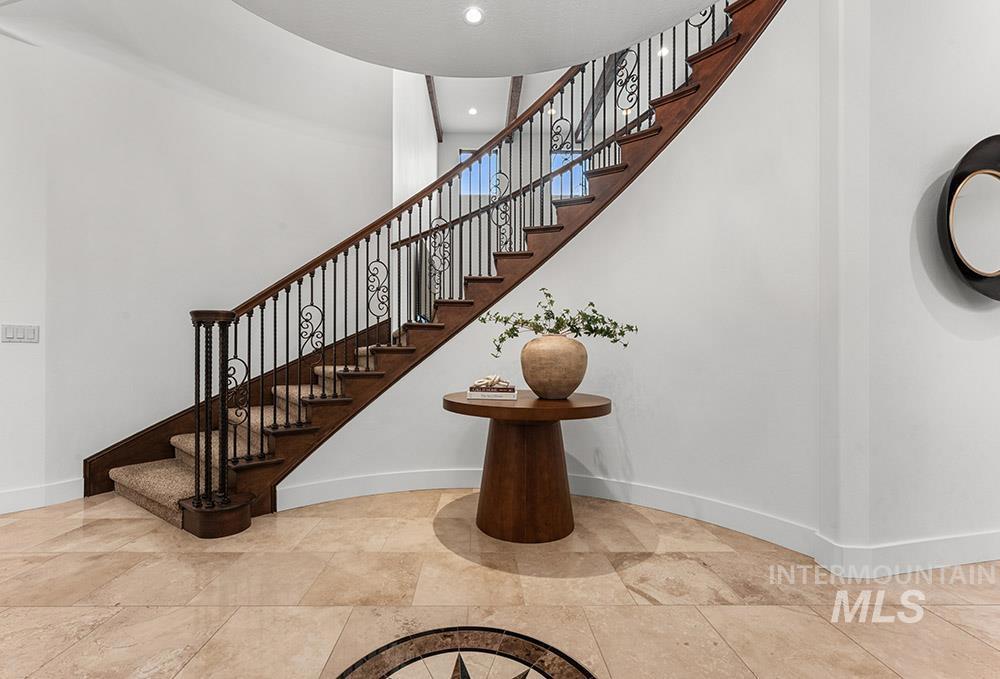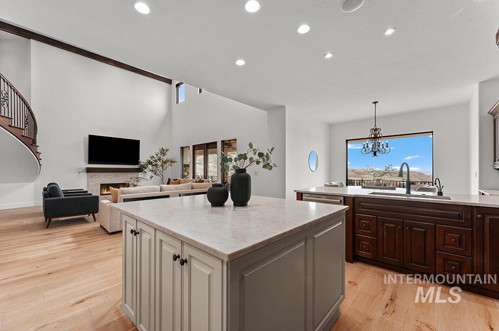 Perched in the coveted East Boise foothills, this custom-built one-owner estate captures breathtaking 180° valley views and rare privacy, surrounded by protected wildlife land. Recently refreshed with new exterior paint, new hardwood flooring, and a beautifully updated kitchen, the home blends timeless design with modern upgrades. Soaring two-story ceilings and expansive windows frame sweeping valley views, while the spacious floorplan offers exceptional areas for everyday living and entertaining. The renovated kitchen features a new island, countertops, backsplash, sinks, and brand-new appliances, complemented by rich cabinetry and a butler’s pantry. New hardwood flooring extends through the hallway, kitchen nook, kitchen, family room, and primary suite. The main-level primary retreat offers balcony access overlooking Table Rock and a spa-inspired bath with heated floors, dual vanities, and a large dressing room. Additional highlights include a library with rolling ladder, curved executive office, formal dining room, and lower-level guest suite with private entry. The walk-out lower level includes a bonus room with kitchenette and full gym, offering fully equipped guest quarters. Outdoor living shines with a wraparound deck featuring a built-in kitchen, fireplace, in-ground hot tub, and putting green, just minutes from St. Luke’s and downtown Boise.