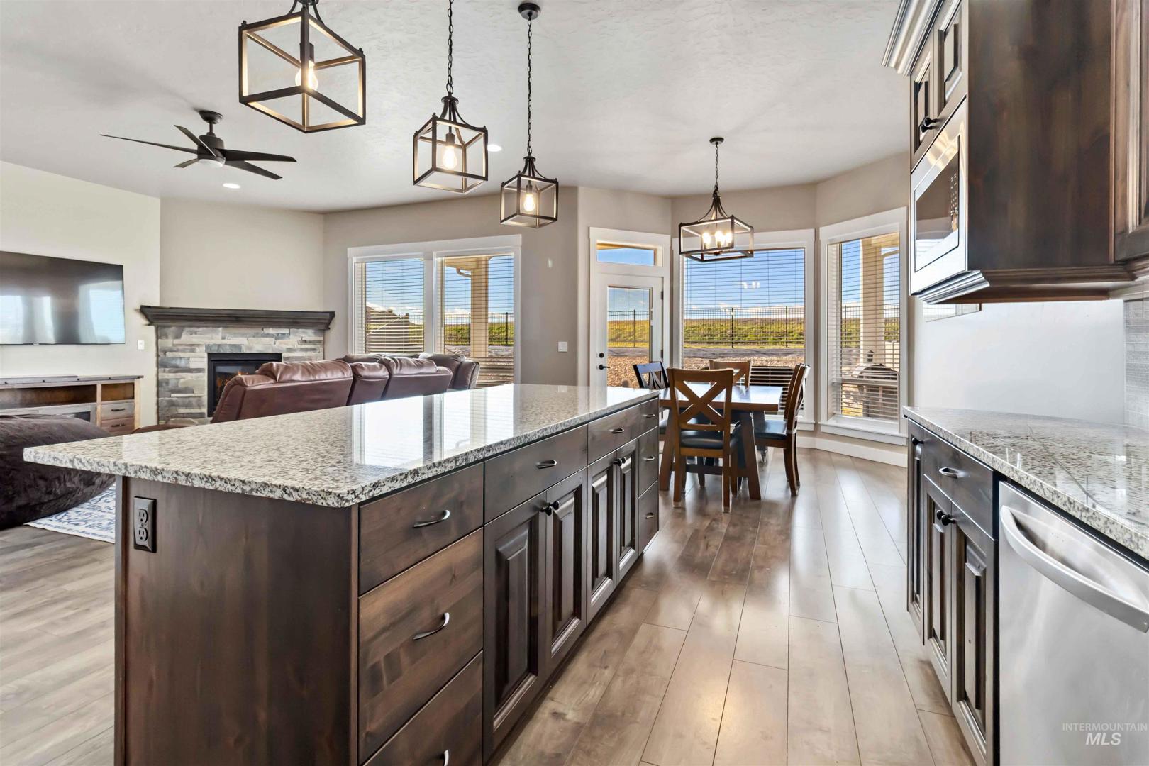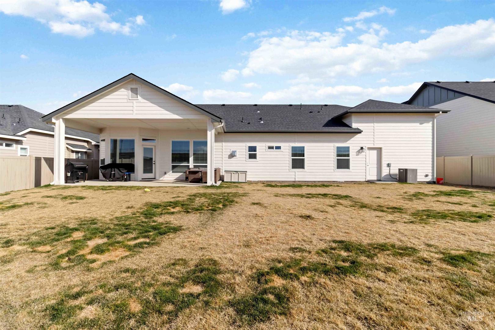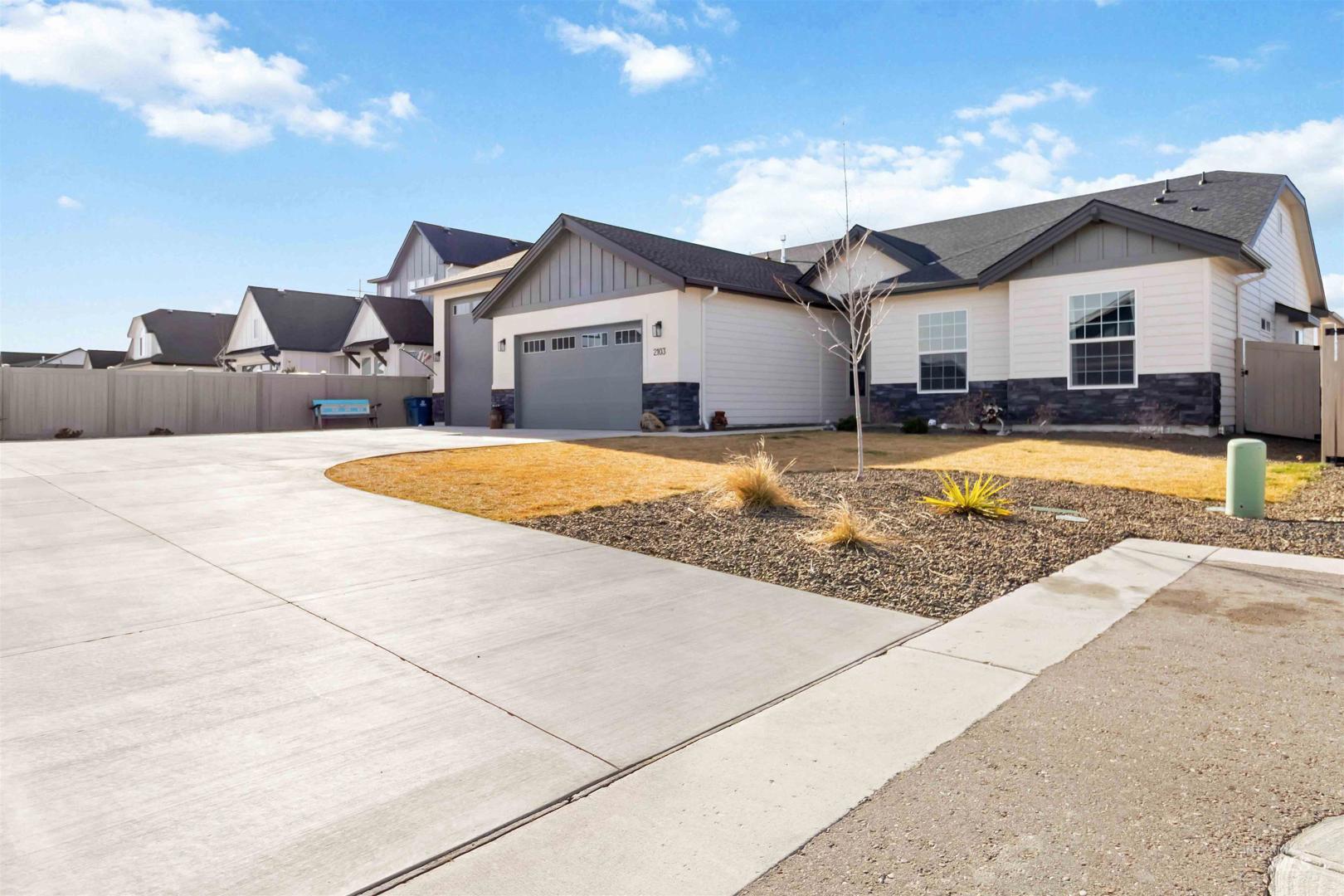 Desirable Heron Ridge. Newly built 4-bed, 2-bath home offering 1,917 sq ft with an open layout, 10’ ceilings, corner fireplace, and a bright kitchen featuring a large island, granite counters, stainless appliances, and gas range. Massive garage and RV storage totaling approx. 1,686 sq ft—rare at this price. The RV bay is 15.5’ × 52.8’ with 14.6’ height and a 12.9’ × 12’ door, ideal for large RVs or boats. The secondary garage is 38.2’ × 20.1’ plus a 10’ × 10’ extension for additional vehicles, storage, or shop space. Private fenced corner driveway fits up to six vehicles, plus a large covered patio and fenced backyard on a generous lot.