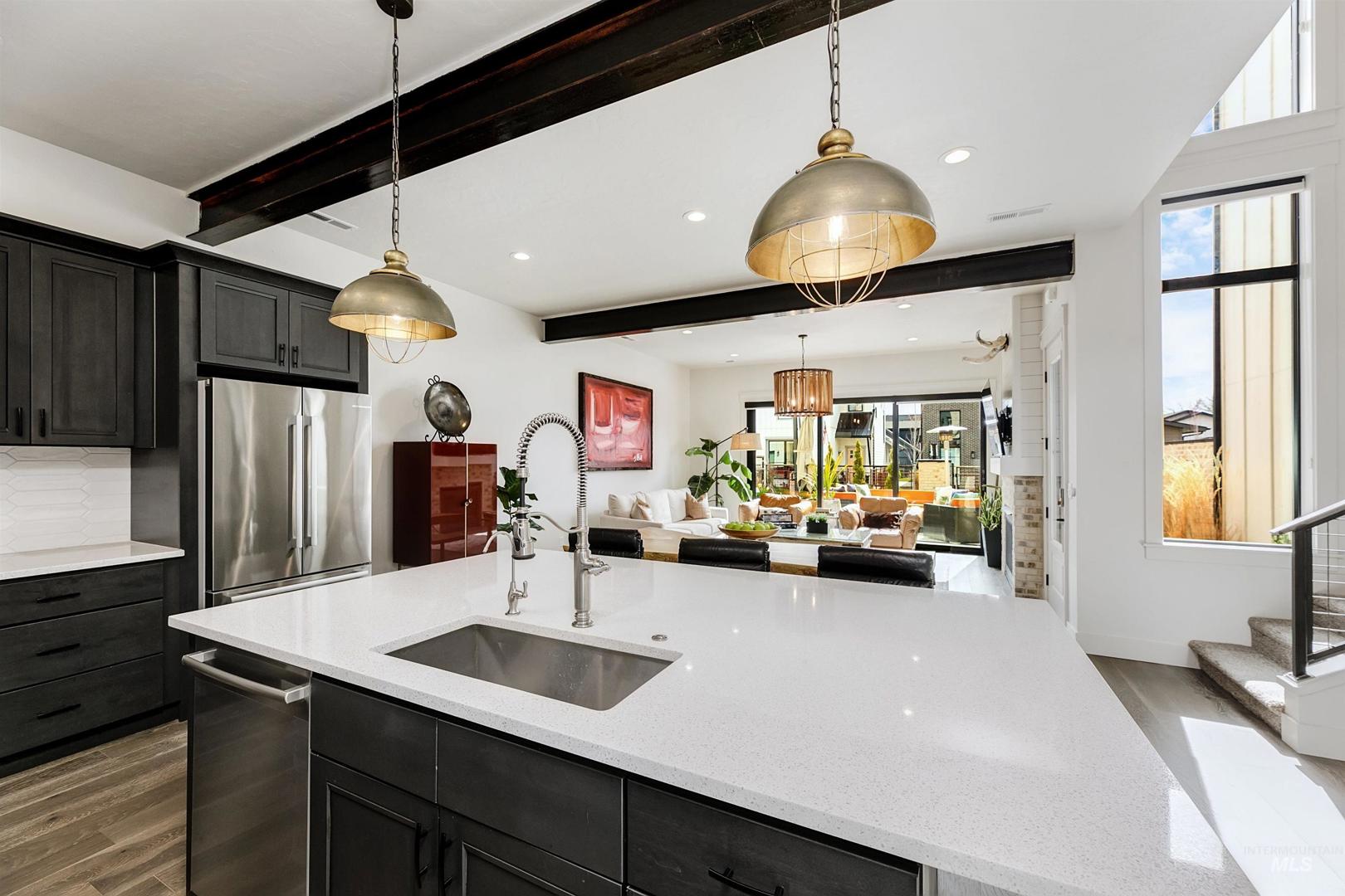 Modern rustic warmth with industrial-inspired details and access to Stillwater’s riverfront lifestyle - only minutes from downtown Eagle. This thoughtfully designed residence offers stylish, low-maintenance living in one of the area`s most sought-after communities. Light and bright with a beautifully appointed chef’s kitchen featuring Bosch appliances, quartz countertops, custom cabinetry, and a spacious walk-in pantry. The kitchen connects seamlessly into the great room, which flows directly to the patio, creating an open gathering space designed for both everyday living and effortless entertaining. Large sliders open to a fully enclosed area offering a private outdoor setting ideal for relaxing or hosting guests. A second outdoor living space awaits upstairs with an elevated deck directly off the owner`s suite, complete with a gas fireplace. The suite provides a private retreat with a soaking tub, walk-in shower, and an expansive closet that connects directly to the laundry room for convenience. Additional upgrades include a full home security system, custom blinds, a reverse osmosis system, and plumbing for a central vacuum. Stillwater residents enjoy resort-style amenities including a pool, hot tub, outdoor kitchen and fireplace, pickleball court, community pond for fishing or paddle boarding, and direct access to the Boise River and Greenbelt.